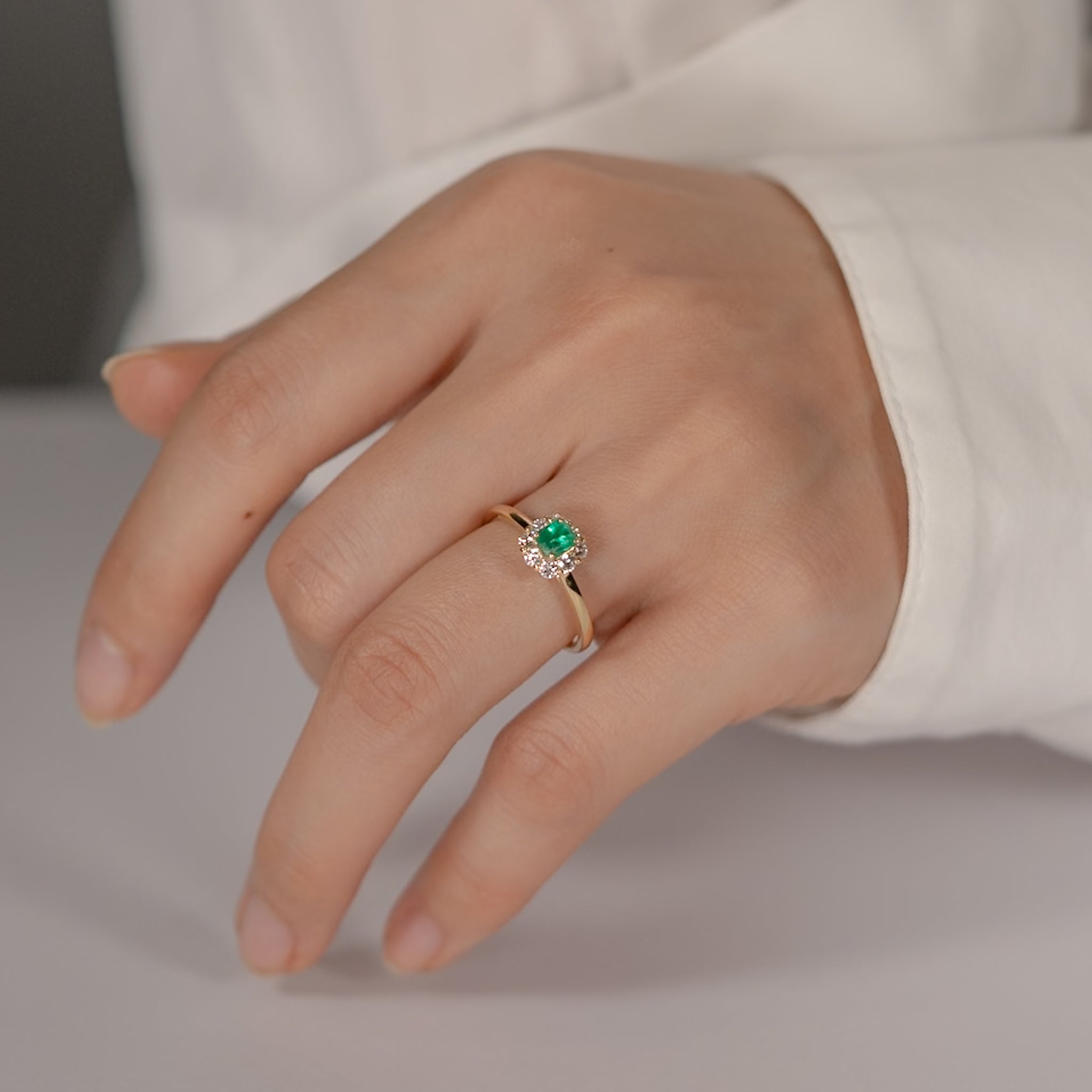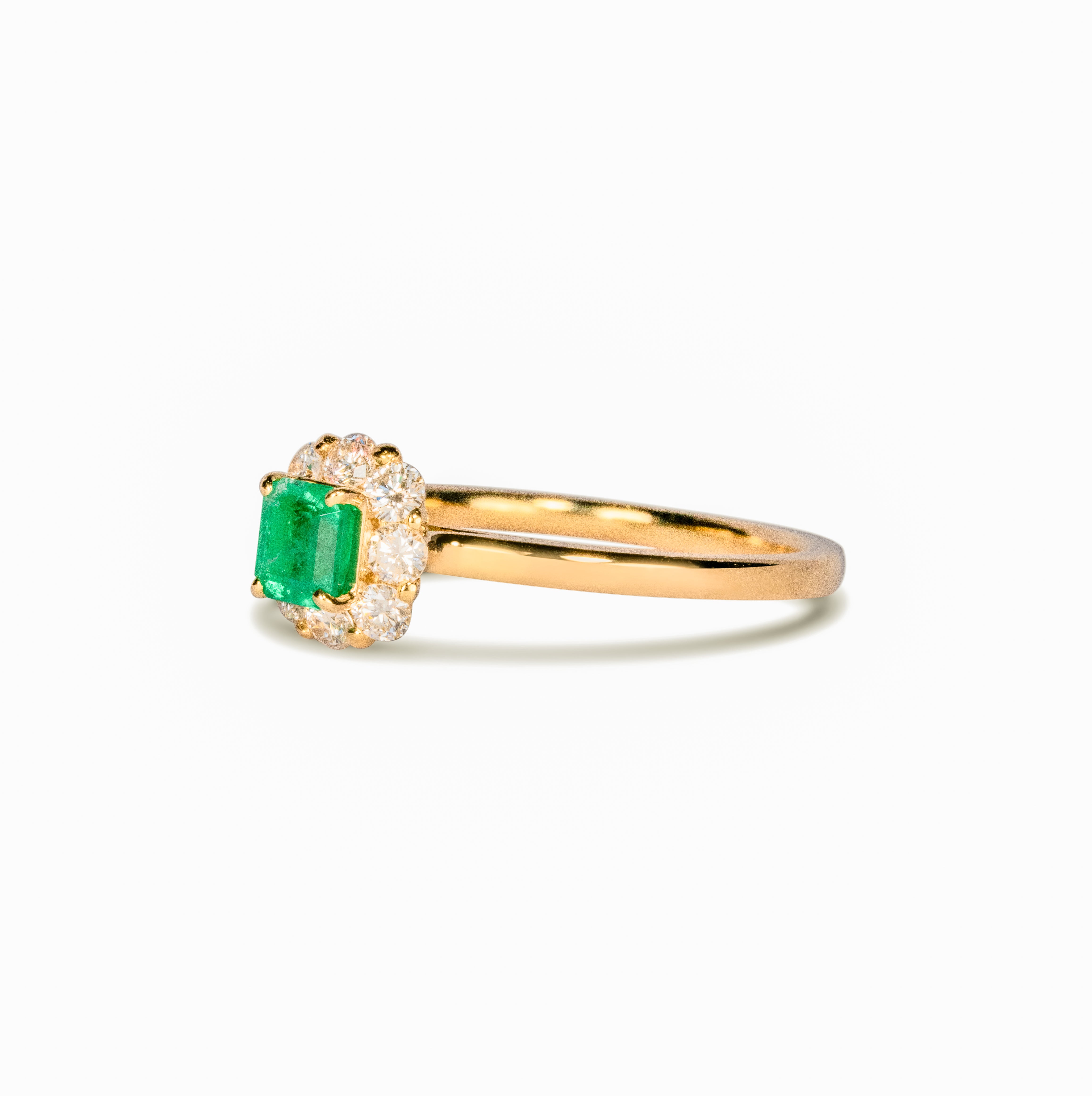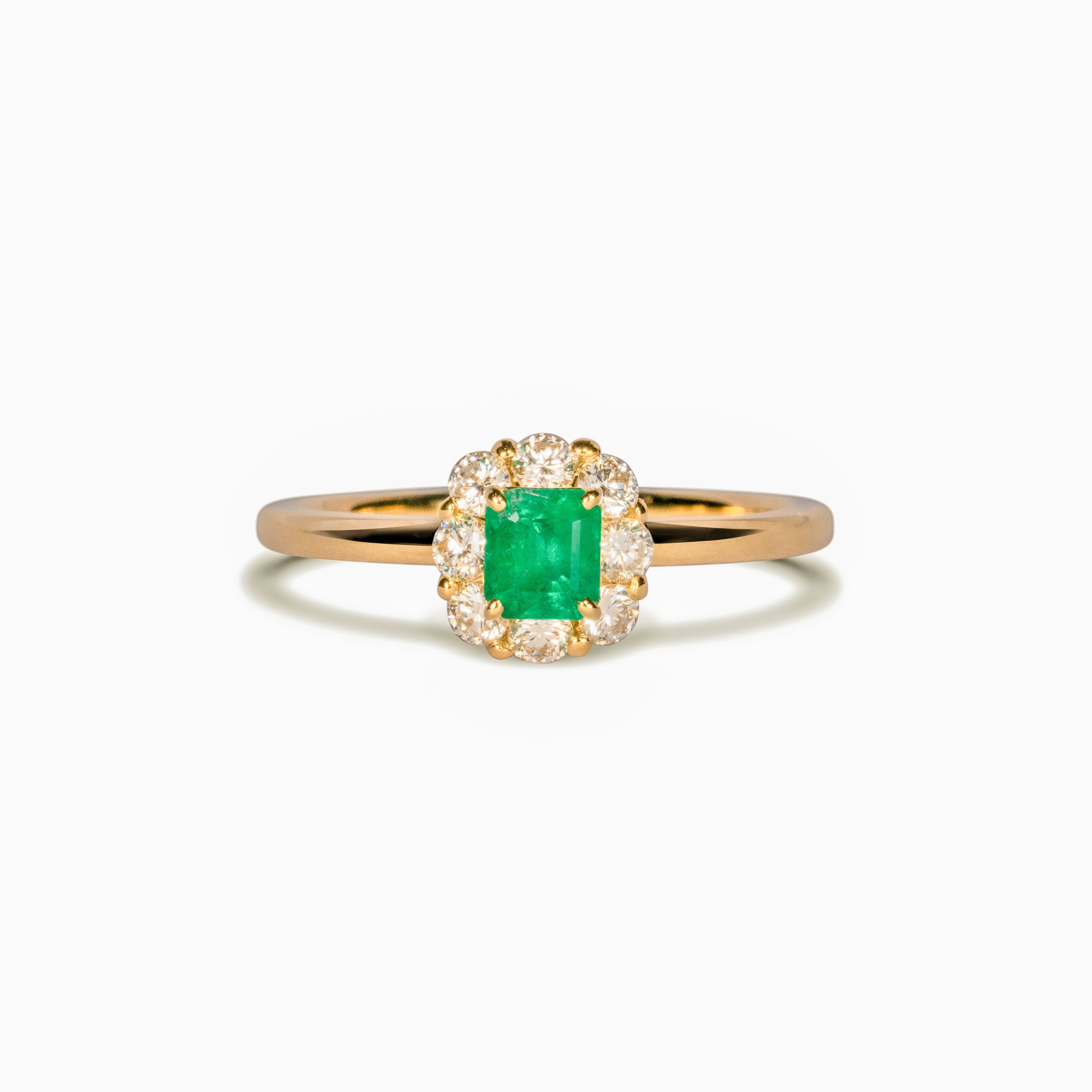 鮮やかなネオンカラーのエメラルドを華やかに彩ったリング。バレリーナのチュチュを思わせるダイヤモンドの絶妙な角度が、シンプルながら他にはない気品を引き立てます。単体での着用はもちろん、厚み約2.5mmまでの他のリングとの重ね着けも楽しめるよう、細部にまでこだわり抜いています。