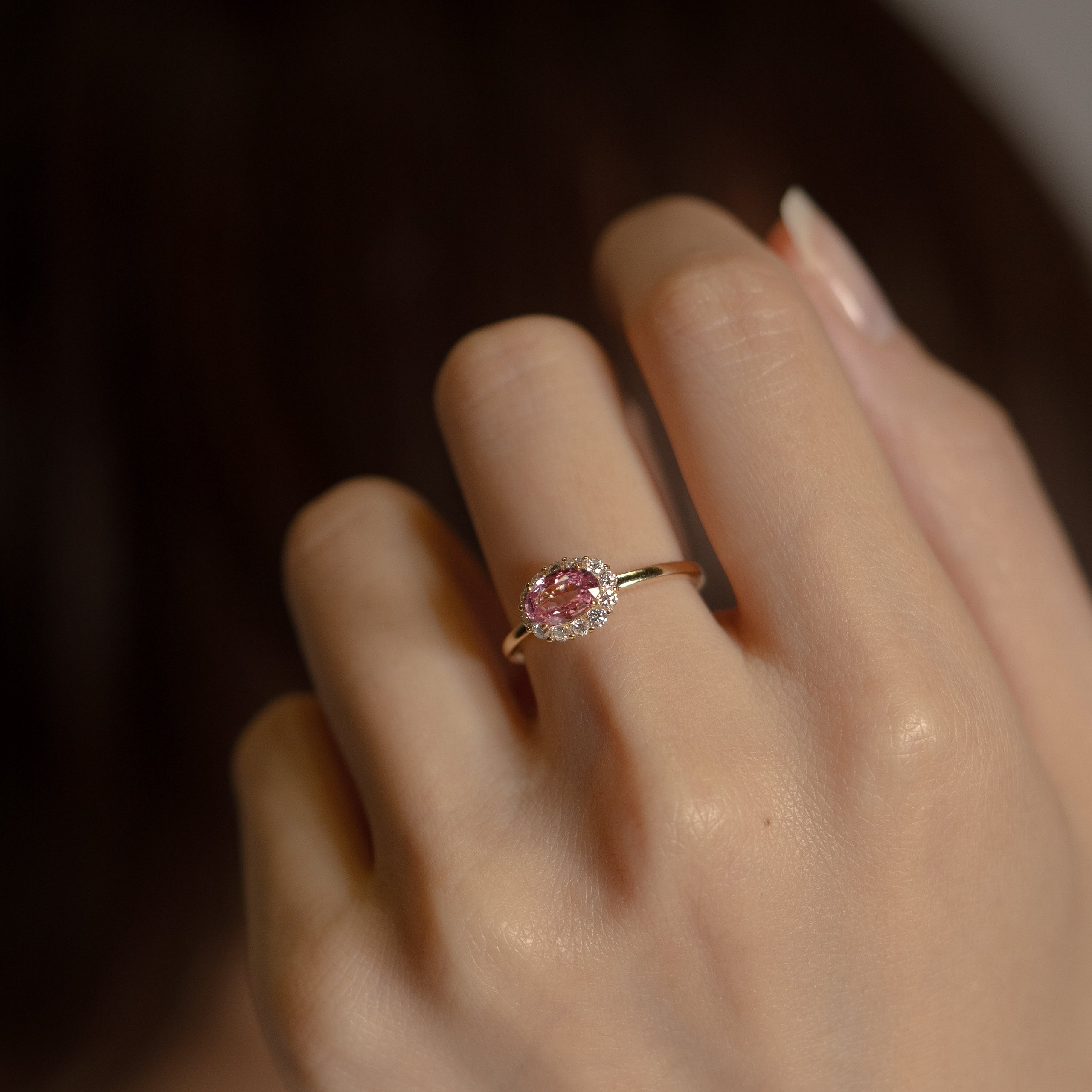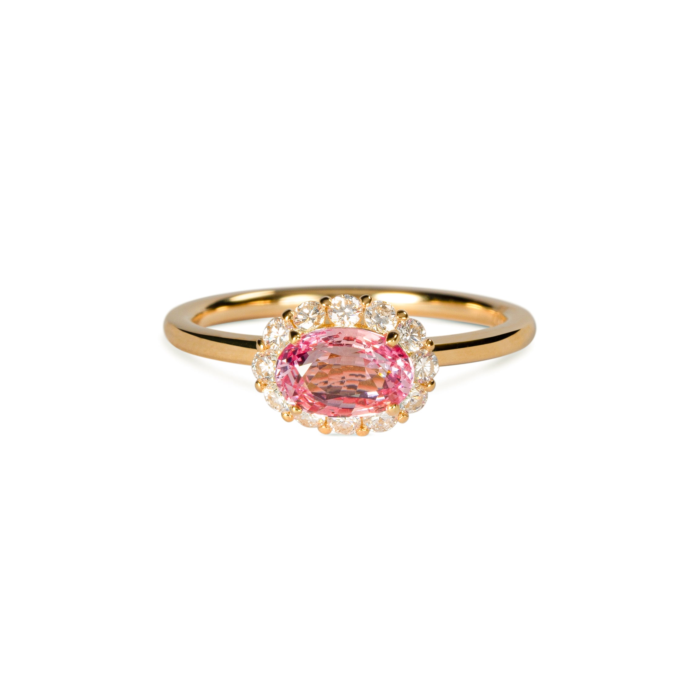 瑞々しく美しい貴重なパパラチアサファイアリングを華やかに彩ったリング。バレリーナのチュチュを思わせるダイヤモンドの絶妙な角度が、シンプルながら他にはない気品を引き立てます。単体での着用はもちろん、厚み約2.5mmまでの他のリングとの重ね着けも楽しめるよう、細部にまでこだわり抜いています。