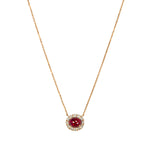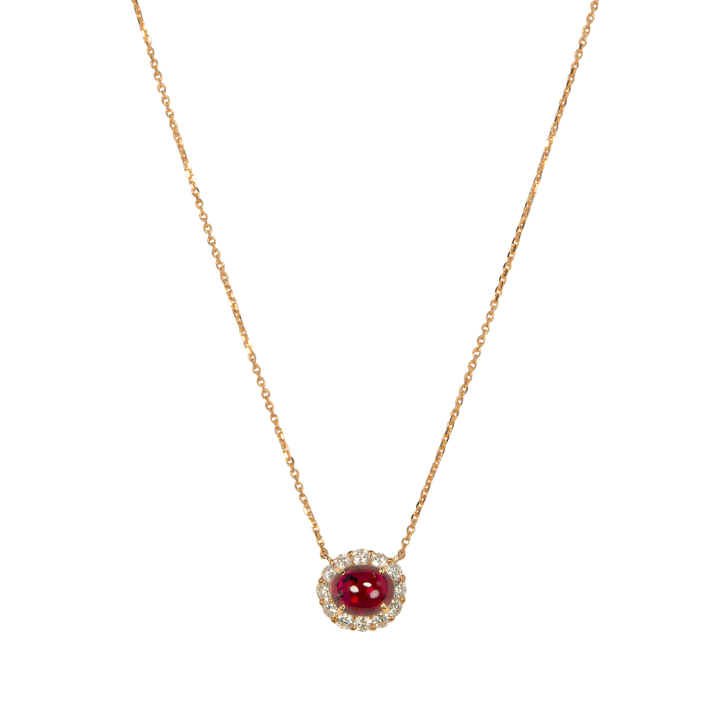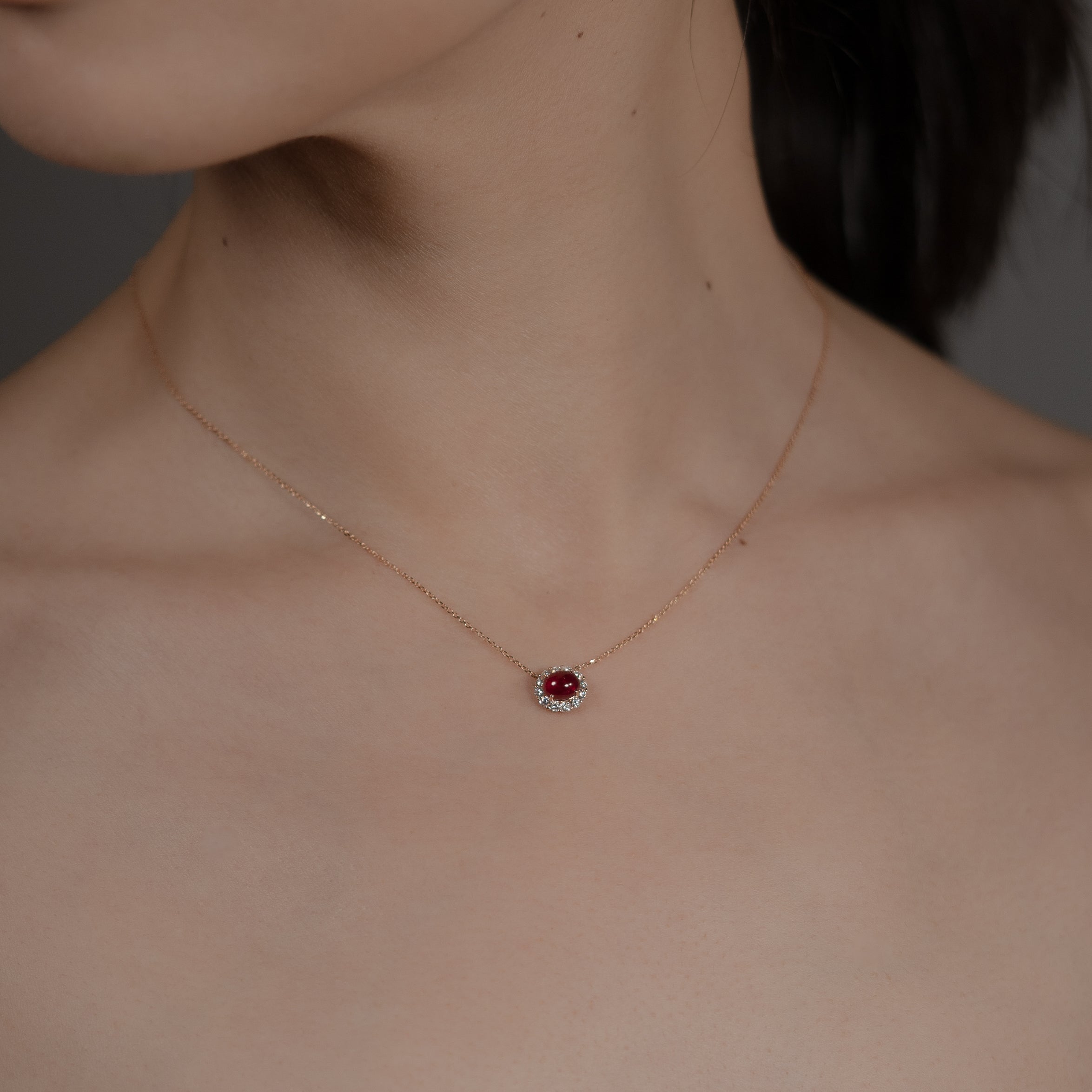 鮮やかな赤色と透明度の高さに惚れ惚れするカボションカットのルビーを、バレリーナのチュチュのように広がるダイヤモンドで華やかに彩ったネックレス。