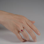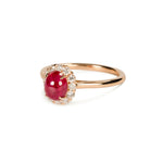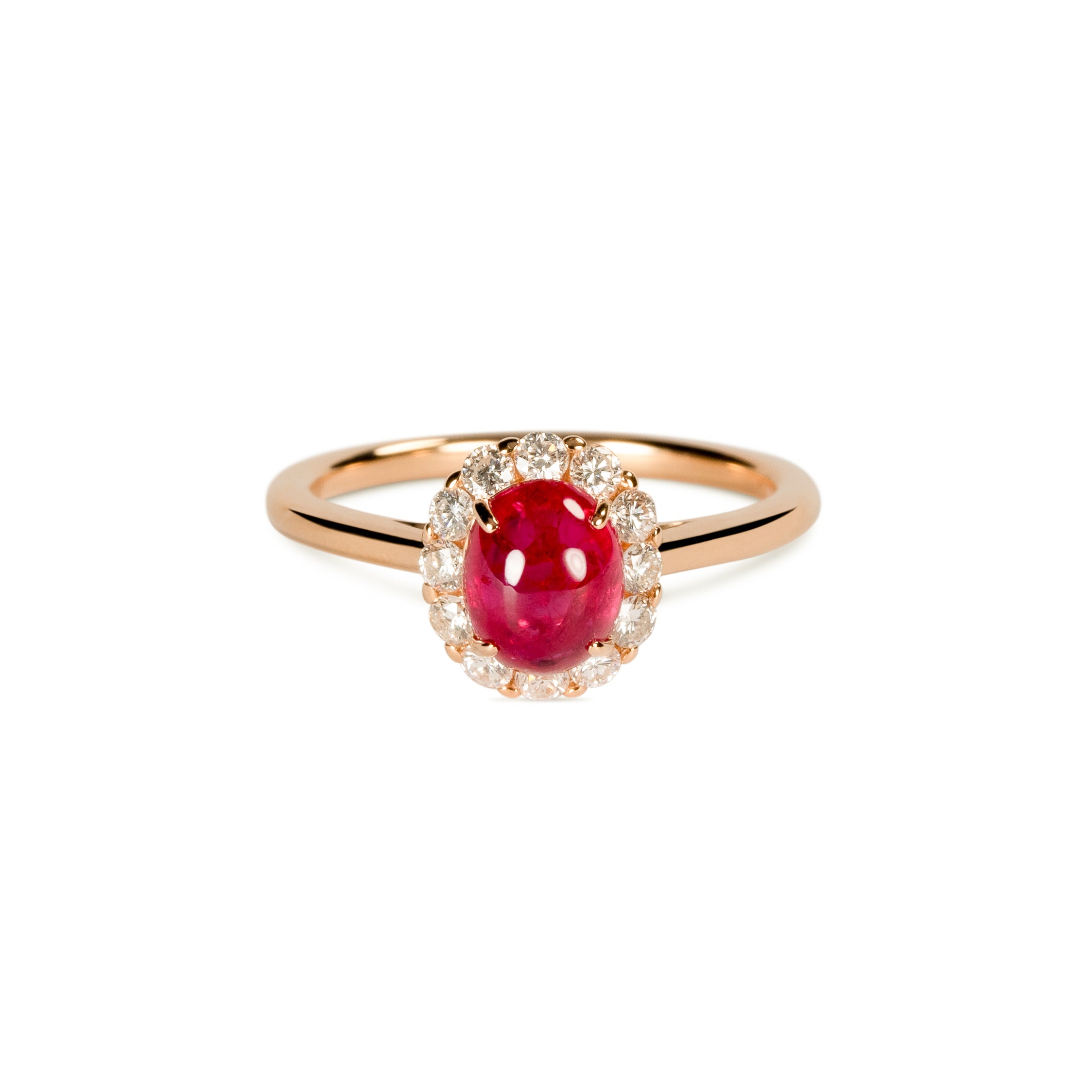 鮮やかな赤色と透明度の高さが印象的なカボションカットのルビーを華やかに彩ったリング。バレリーナのチュチュを思わせるダイヤモンドの絶妙な角度が、シンプルながら他にはない気品を引き立てます。単体での着用はもちろん、厚み約2.5mmまでの他のリングとの重ね着けも楽しめるよう、細部にまでこだわり抜いています。