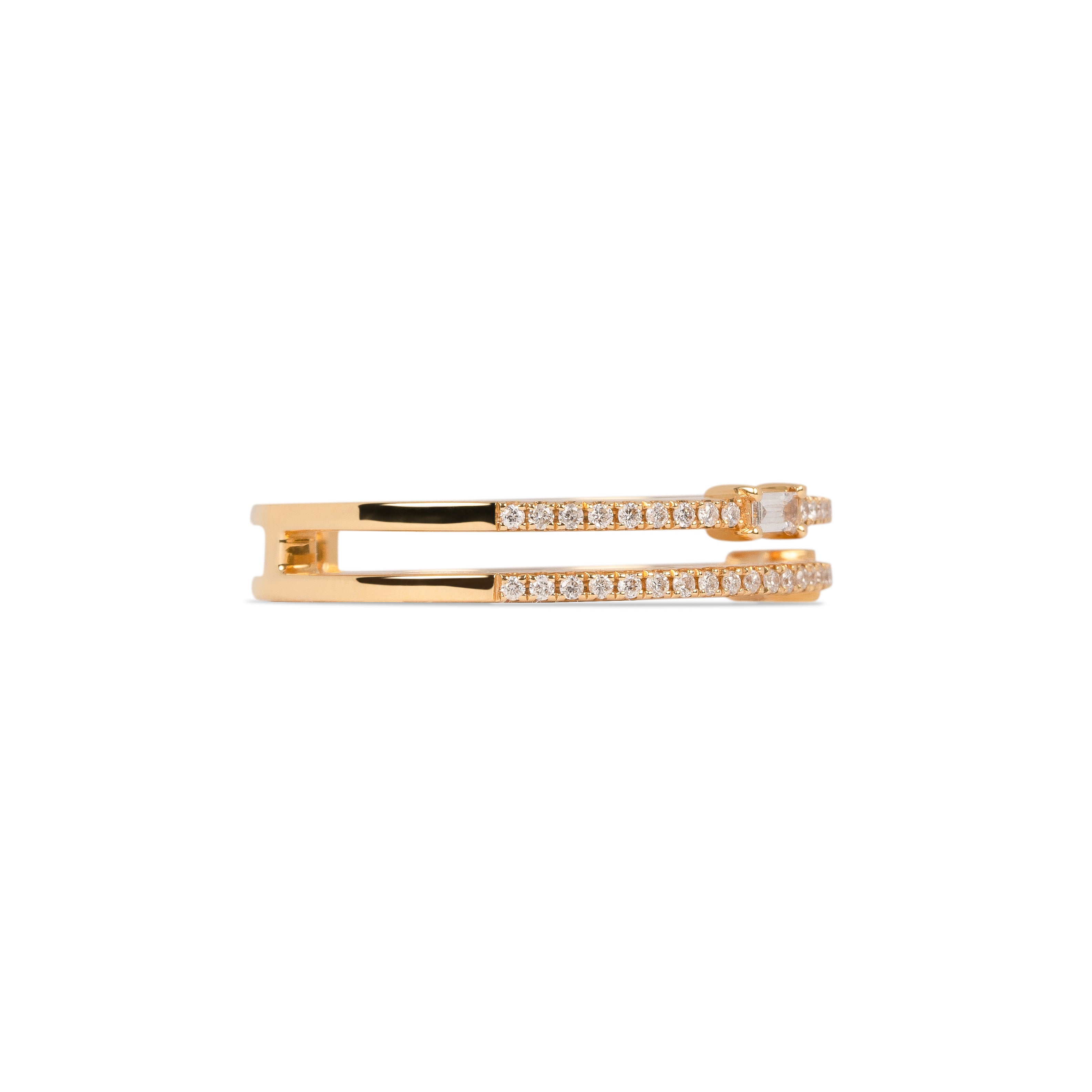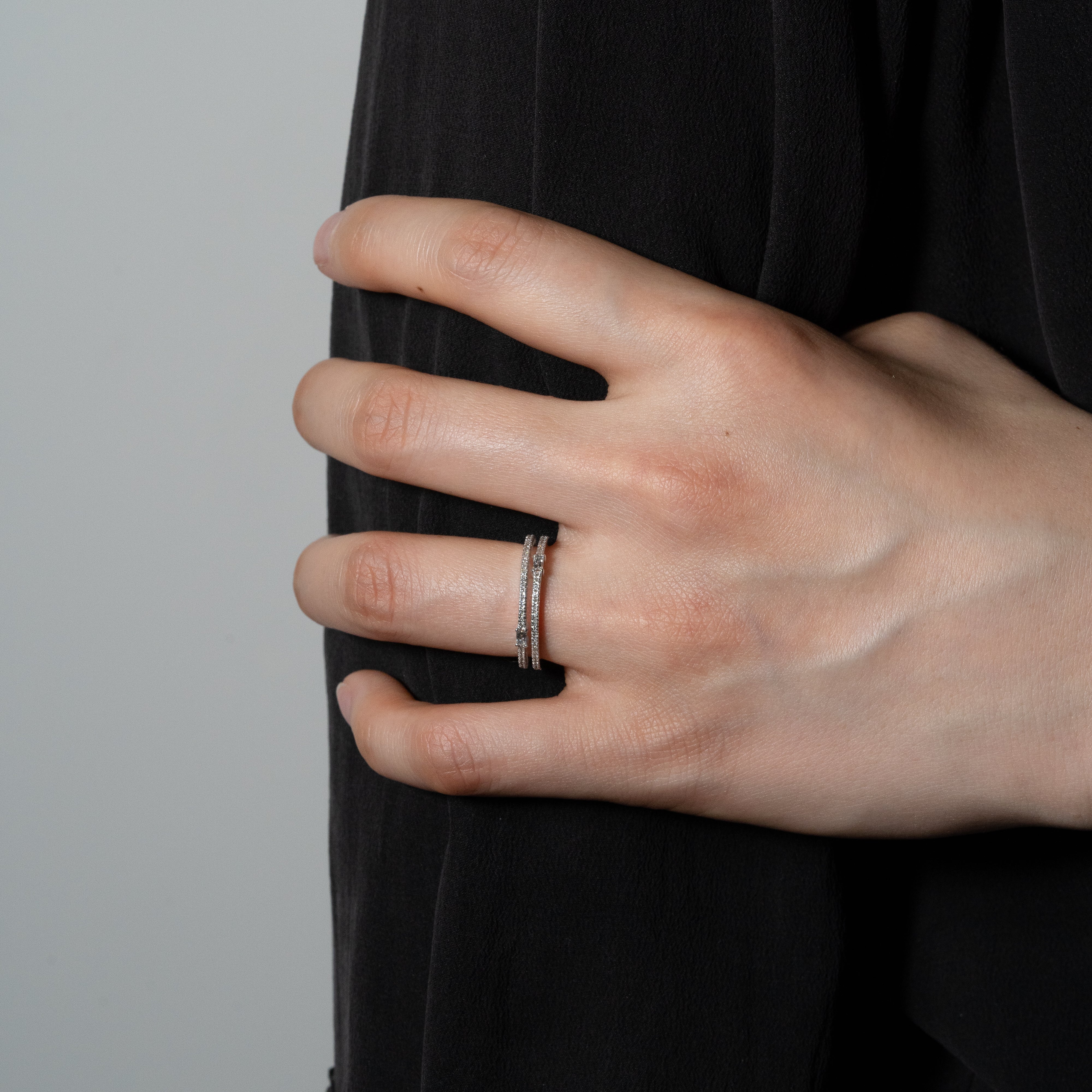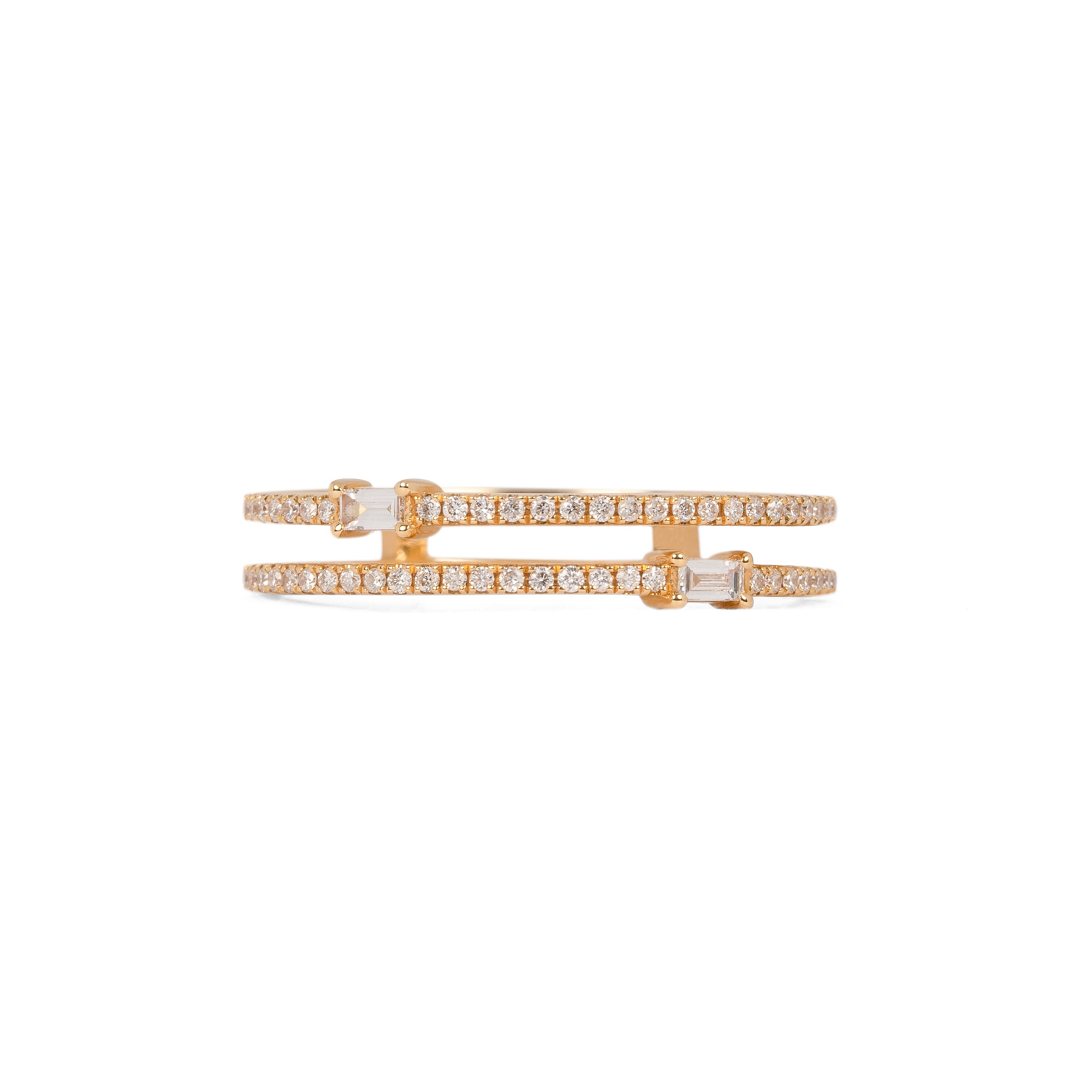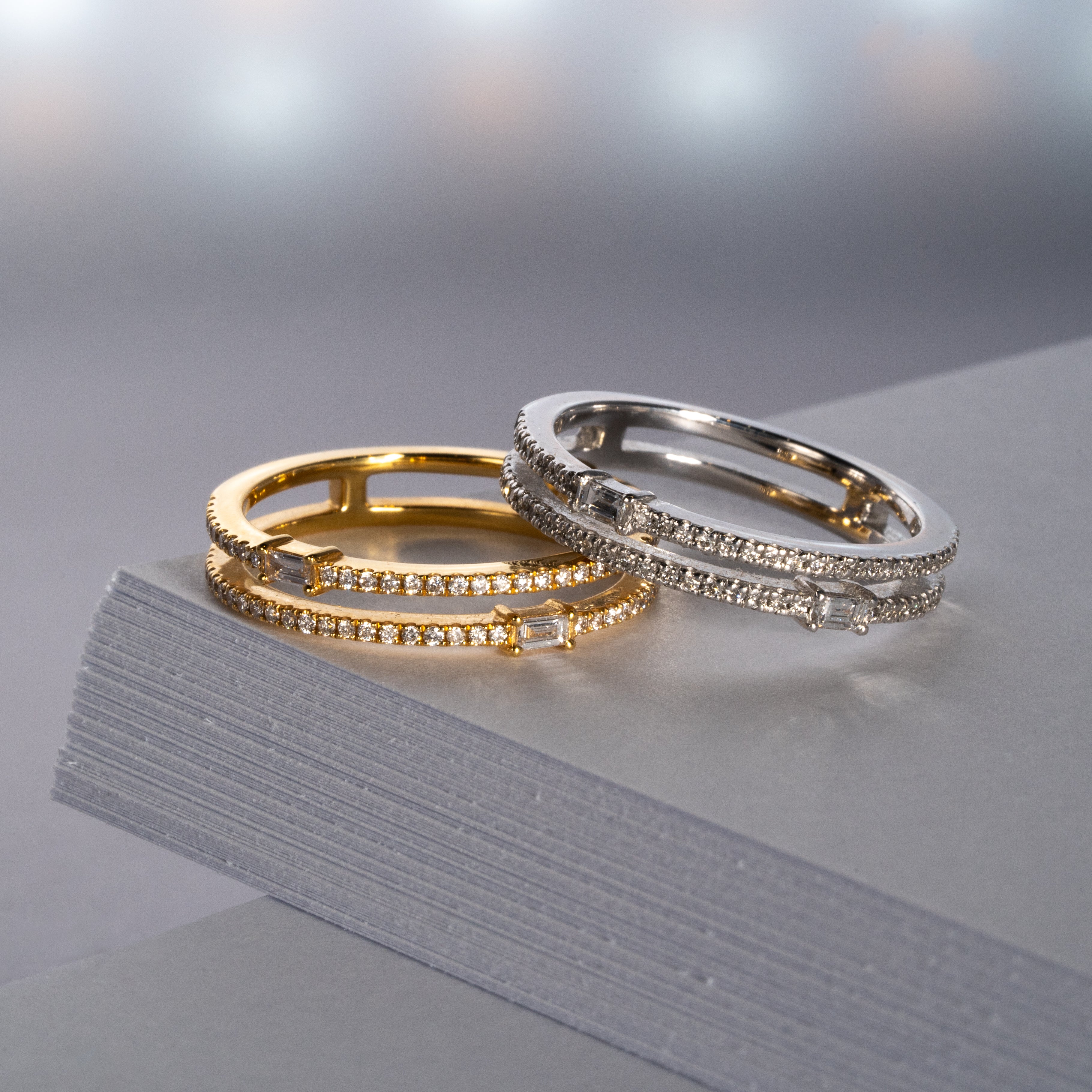 2連のダイヤモンドエタニティリングにバケットカットのダイヤモンドを2石留めたリング。 ラウンドブリリアントカットのダイヤモンドの強い輝きと、バケットカットのダイヤモンドの凛とした上品な輝き。2種類のカットのダイヤモンドが織りなすリズムが楽しいジュエリーです。