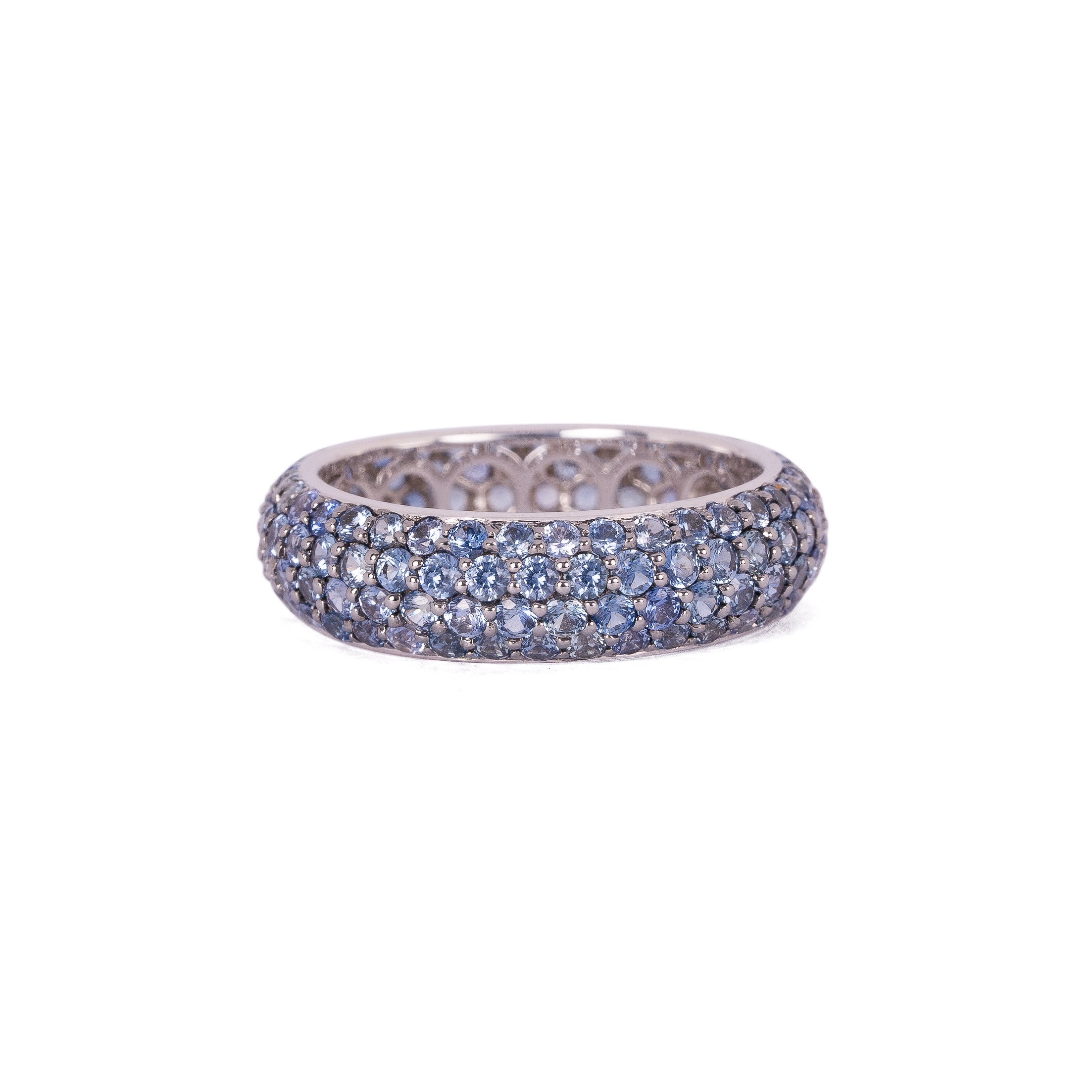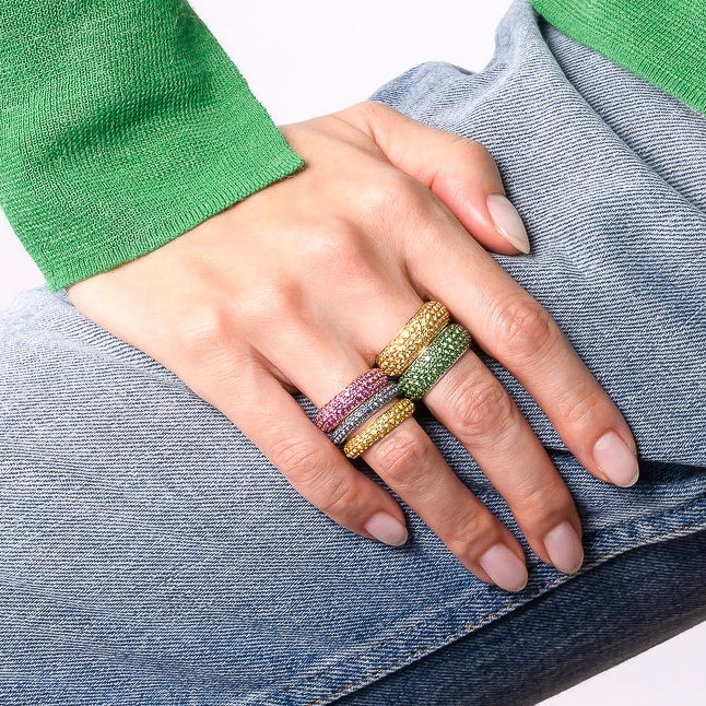 カラフルなパヴェセッティングのリングコレクション。デザインはシンプルながら一色使いのカラーストーンで仕立てることでラグジュアリーで洗練された魅力を発揮するジュエリー。