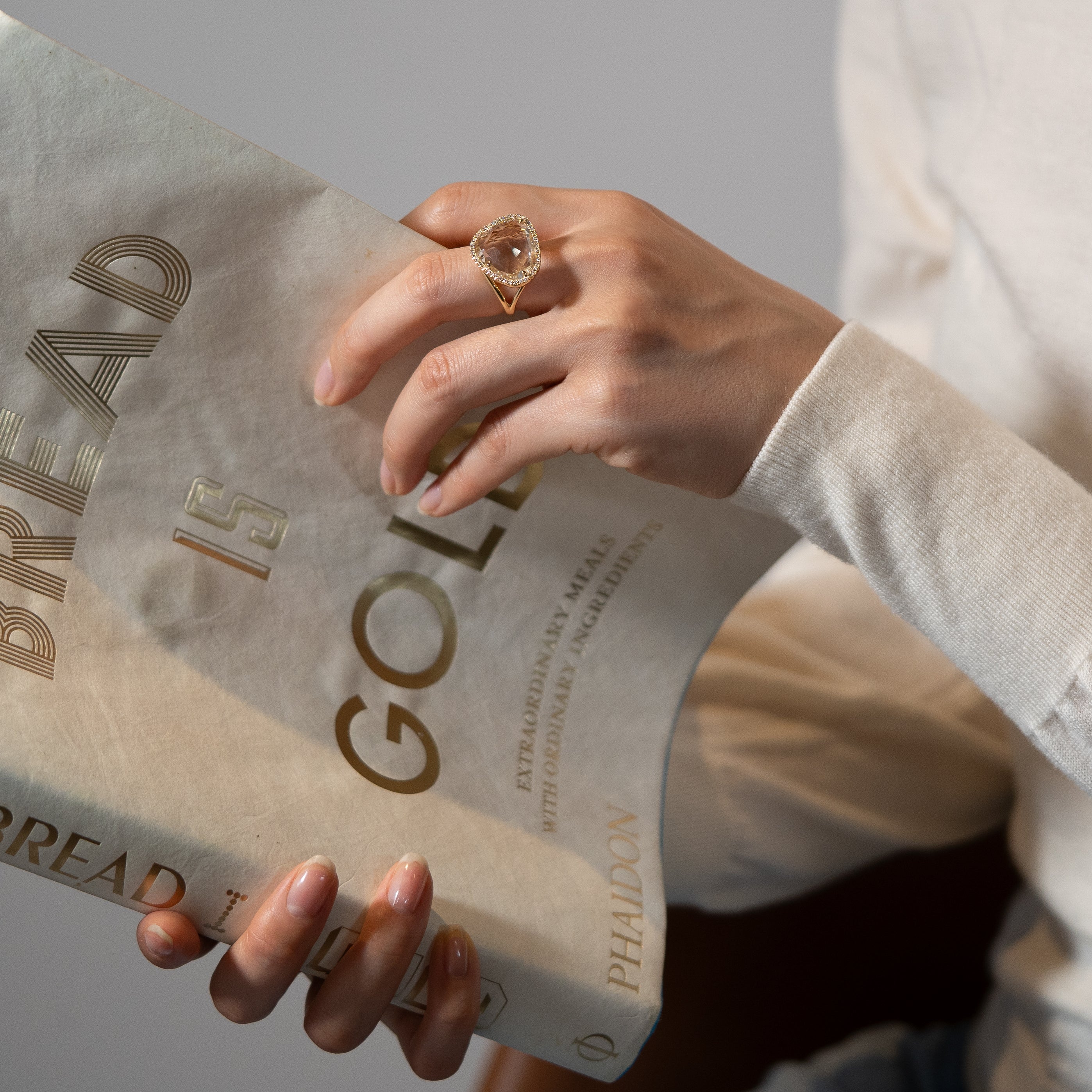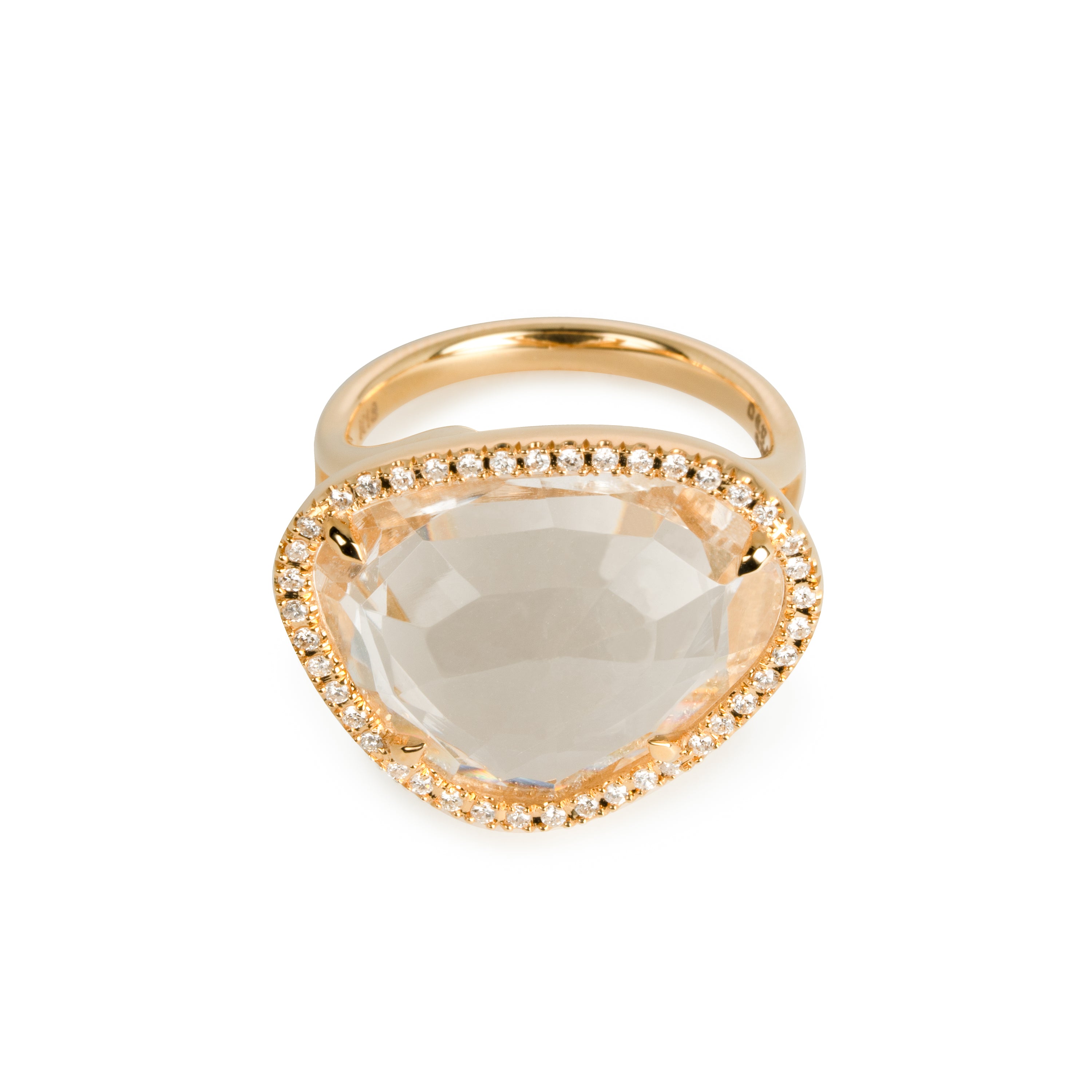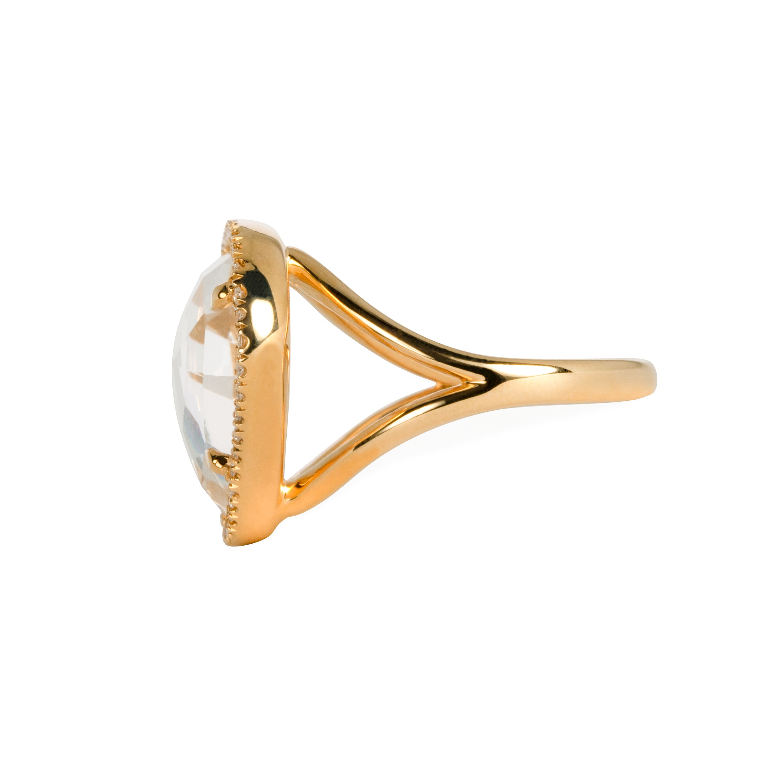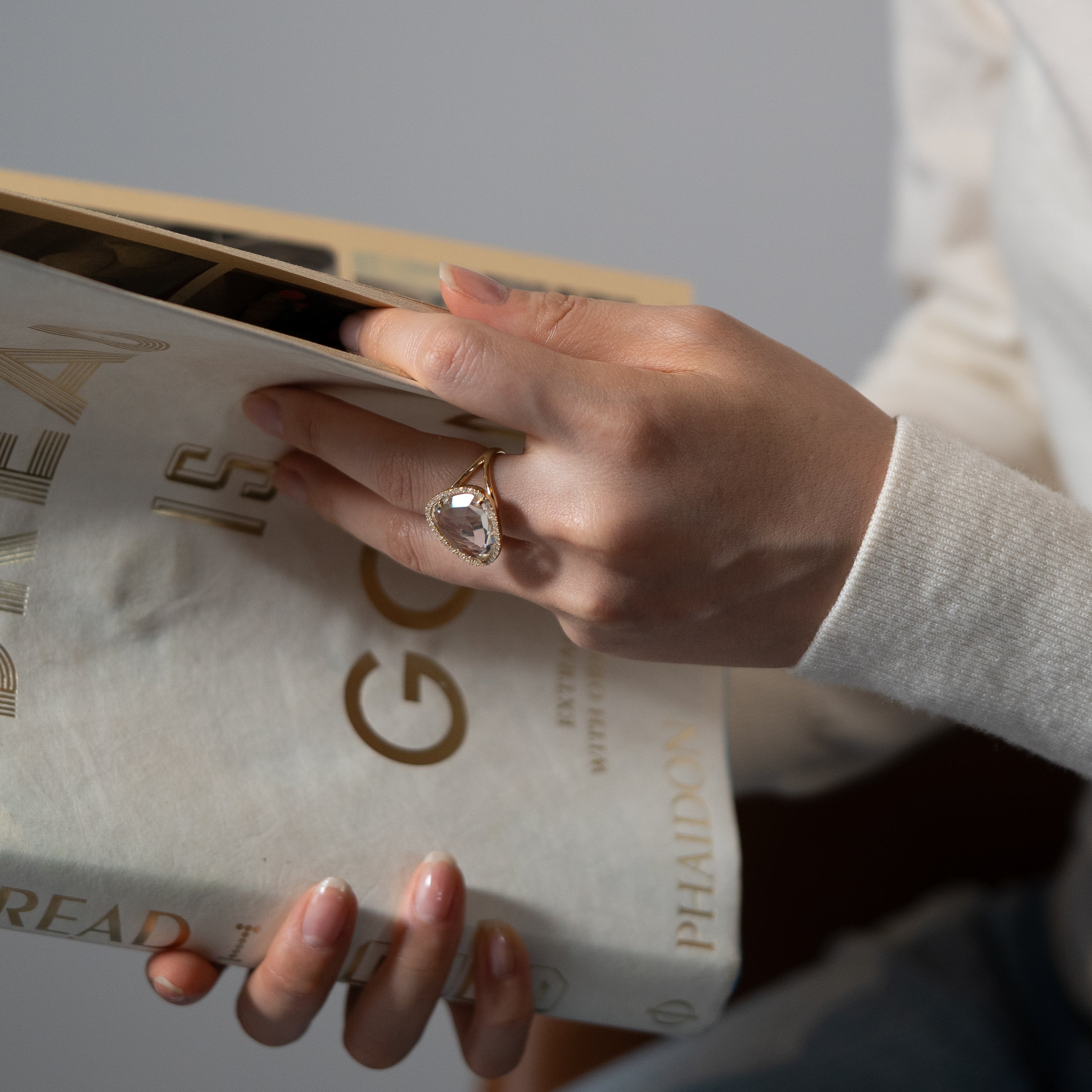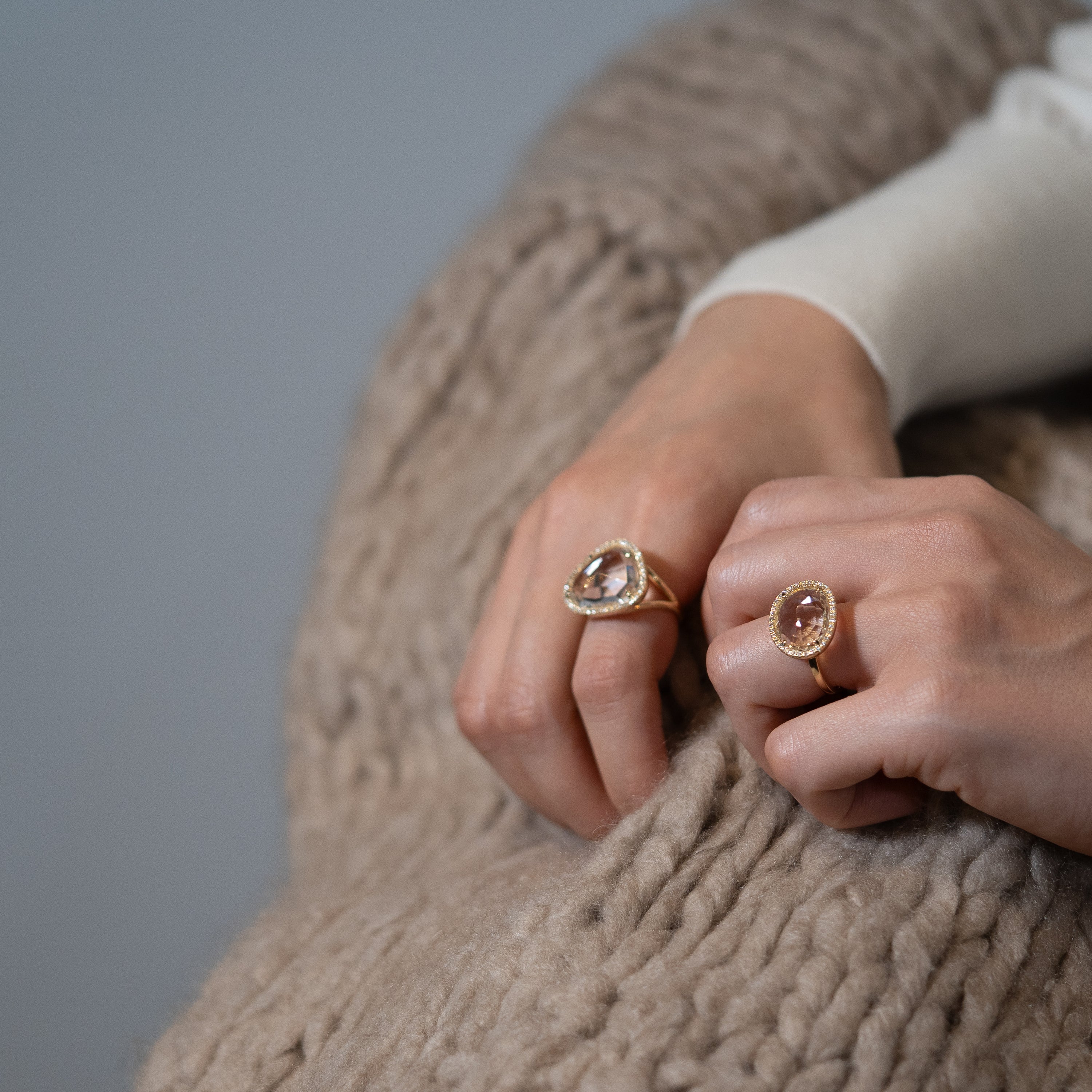 クリアなクリスタルに繊細に輝くメレダイヤモンドを取り巻きました。シンプルでいて、宝石のユニークな形が際立つデザイン。大きなセンターストーンを支えるアームは一本から二本に分岐し、指をしっかりとホールドする安心感も特徴です。宝石の形に合わせ、一点ずつ丁寧にお作りしています。
