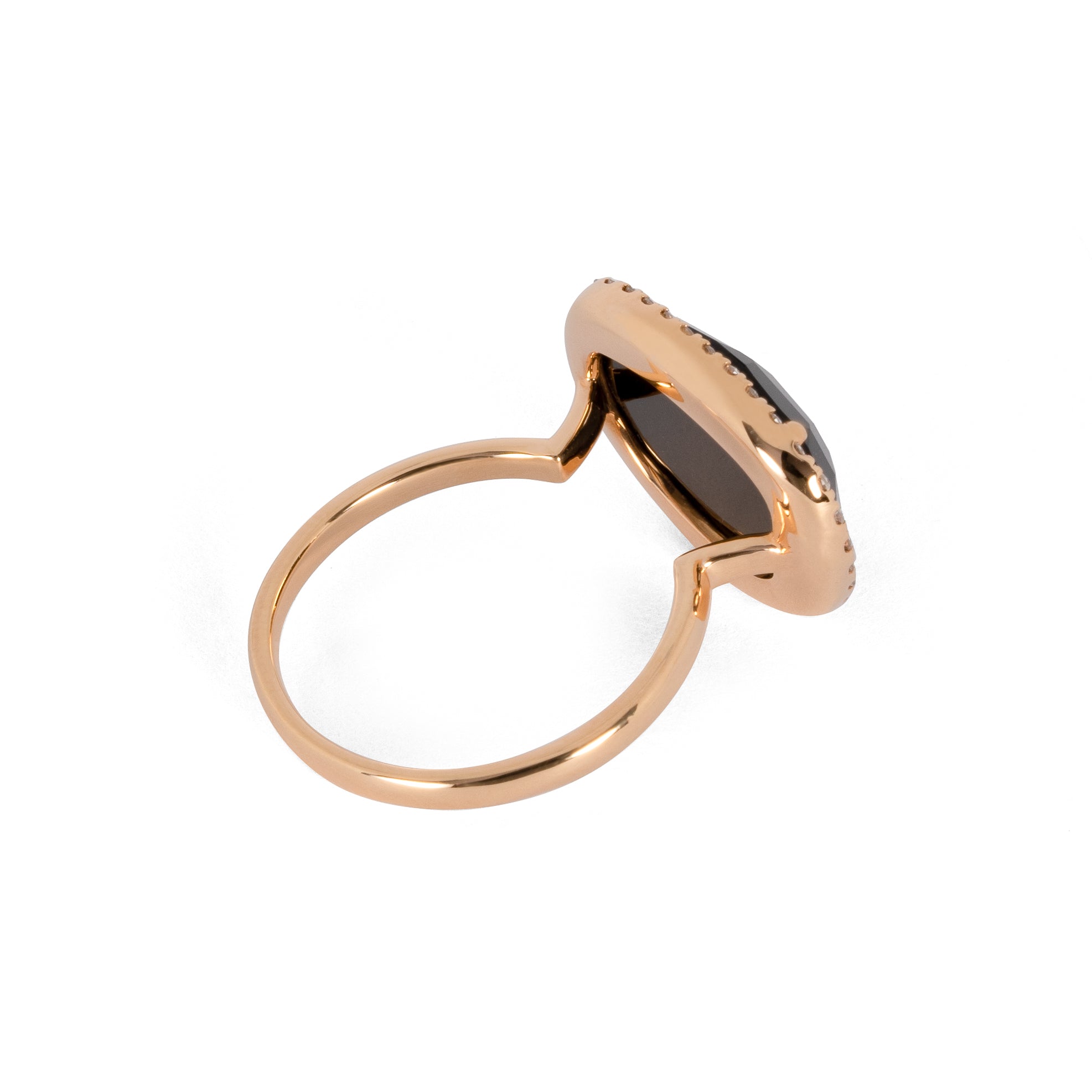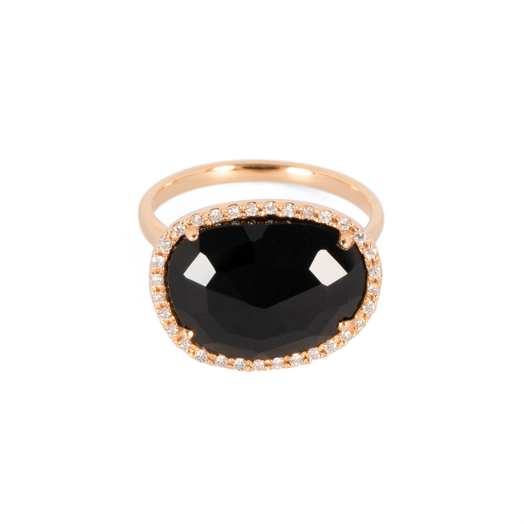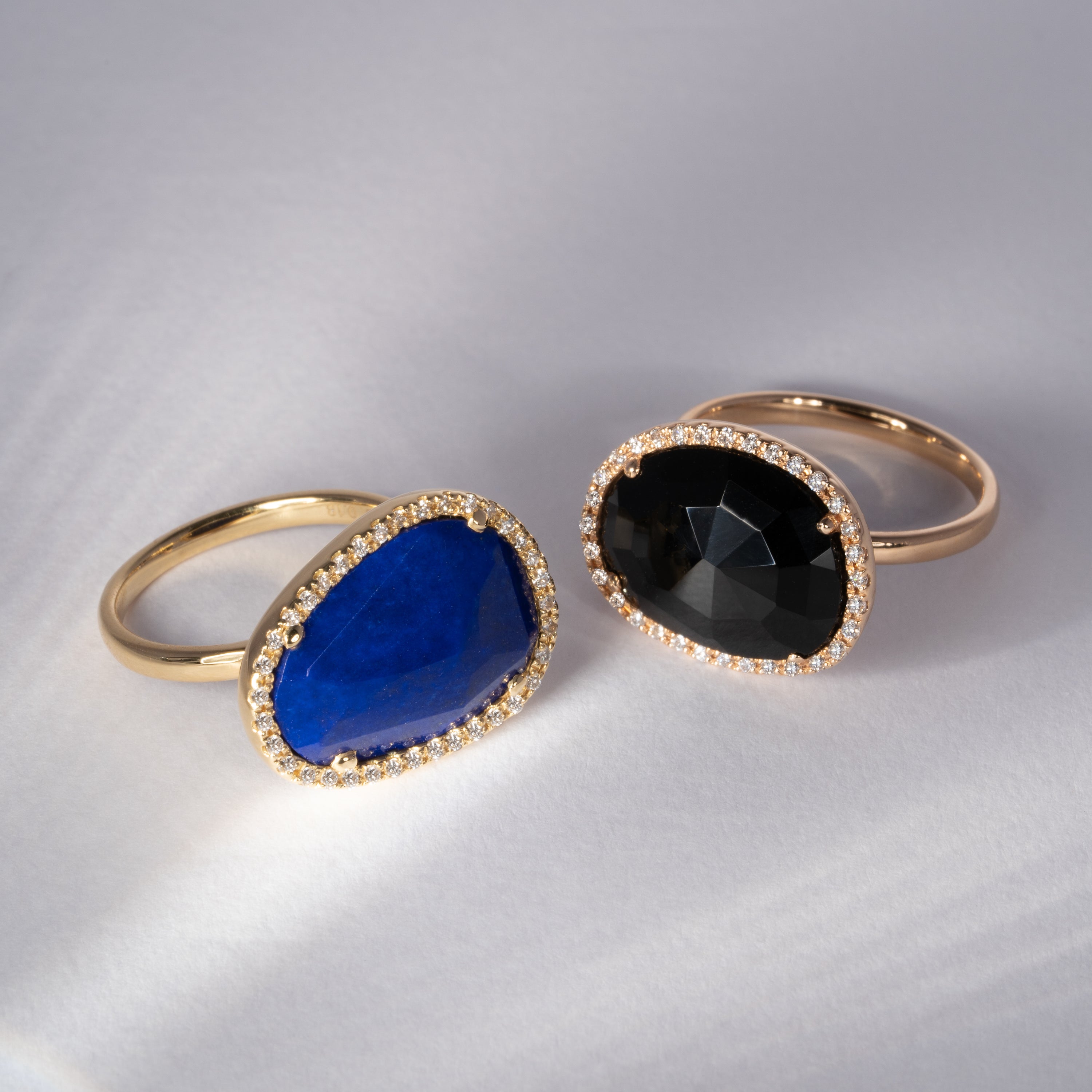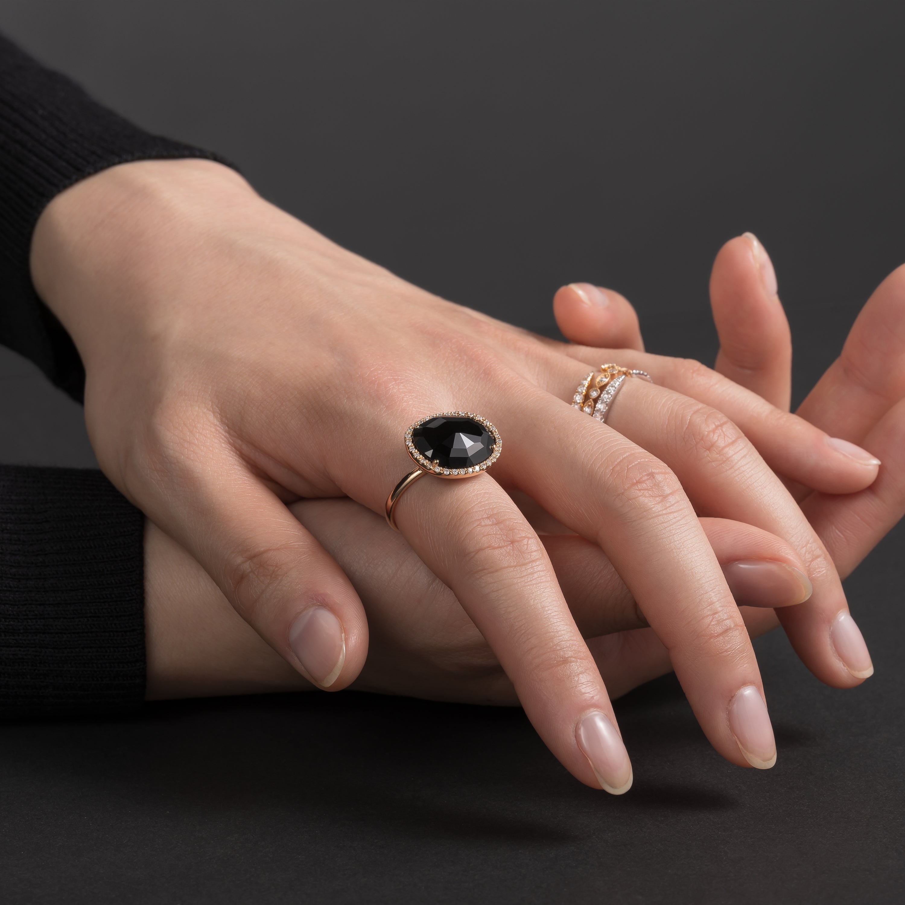 漆黒に輝くオニキスと、繊細に輝くメレダイヤモンドのコントラストが美しいリングです。シンプルでいて、宝石のユニークな形が際立つデザイン。宝石の形に合わせ、一点ずつ丁寧にお作りしています。