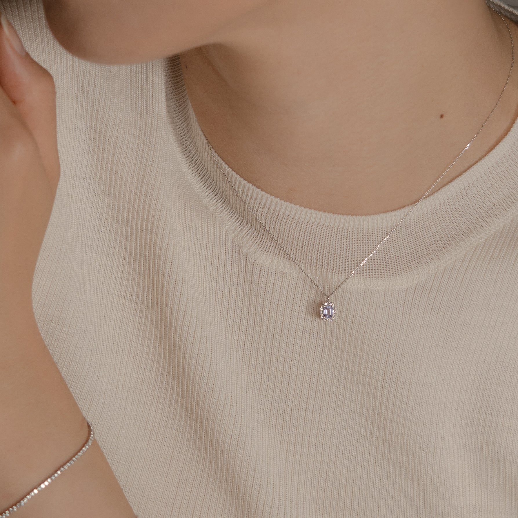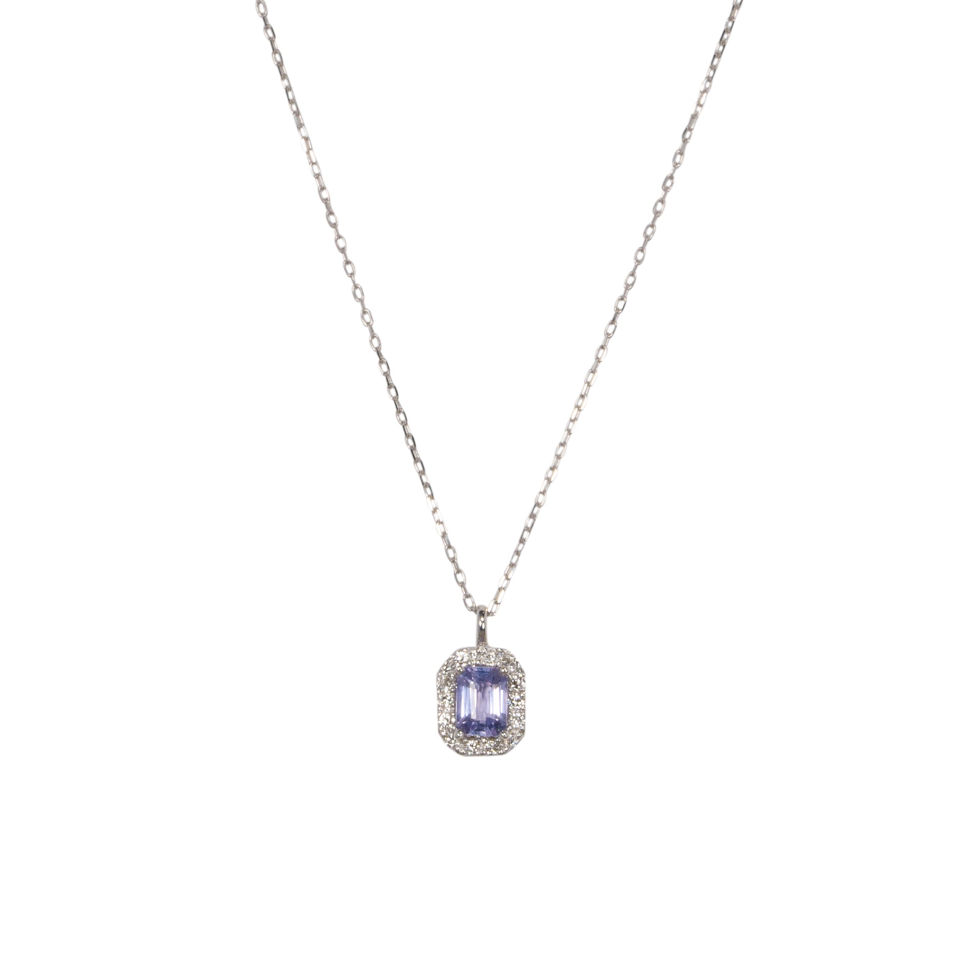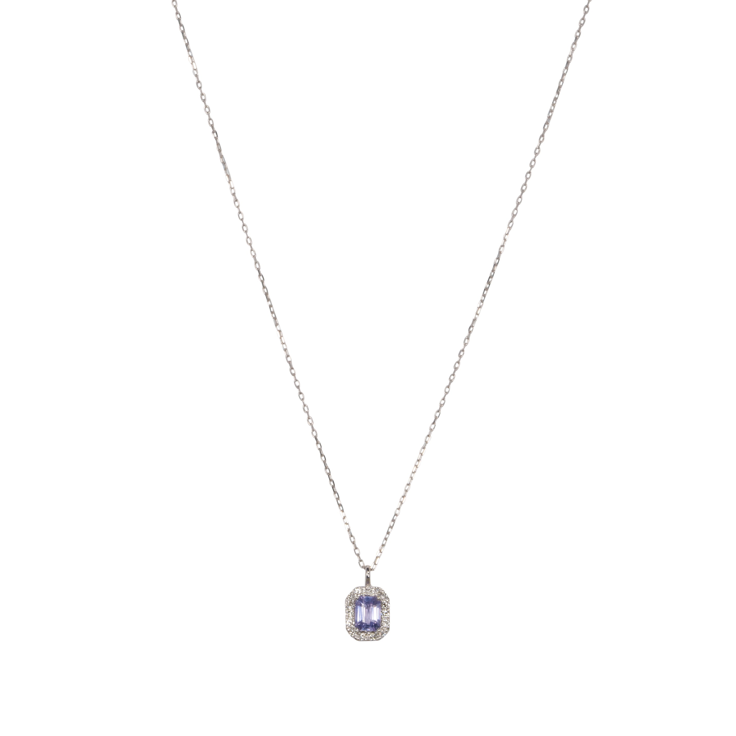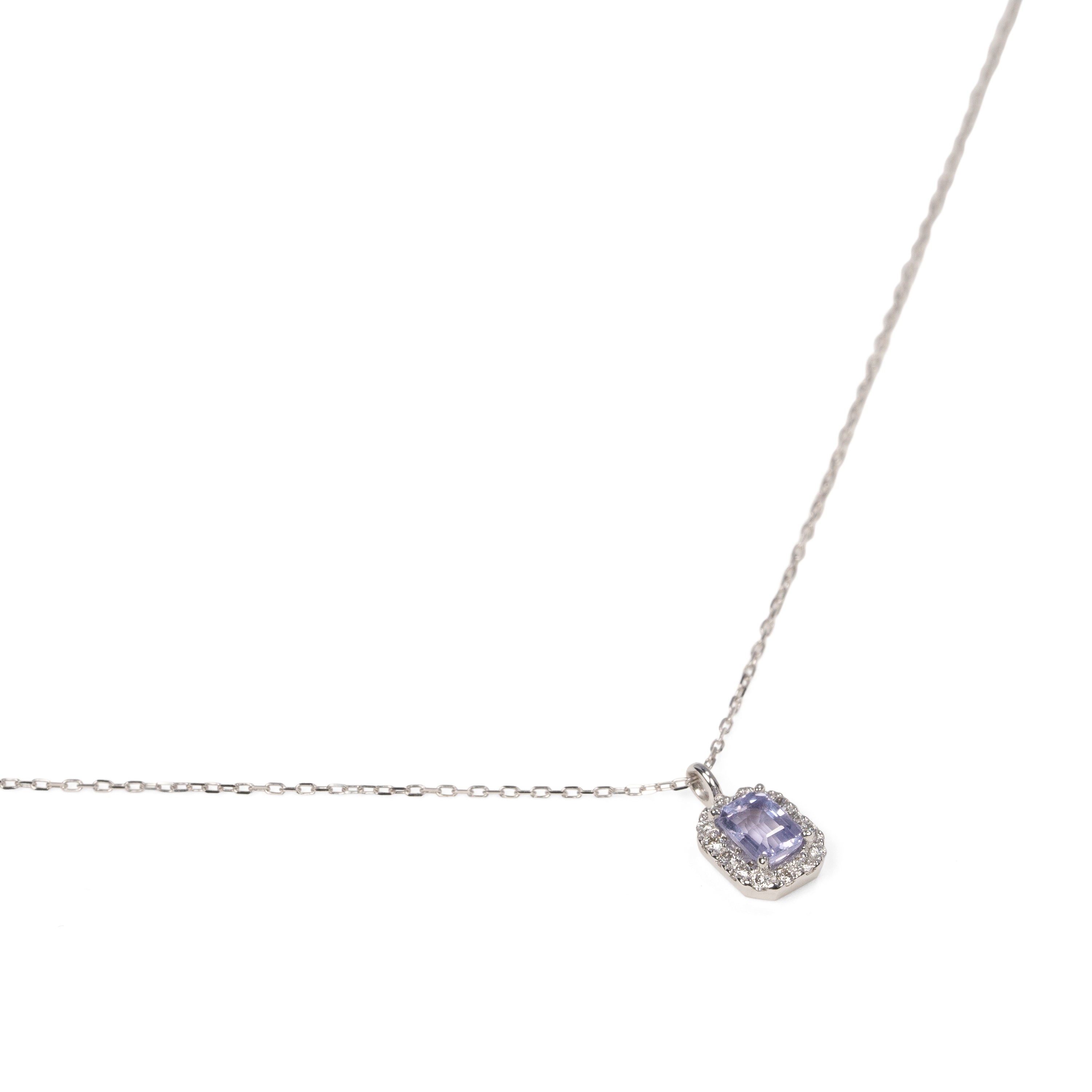 淡い青紫色のファンシーサファイアと繊細に輝くダイヤモンドで仕立てた、シンプルで存在感あるデザイン。デイリーに使えるサイズ感も魅力のネックレス。
