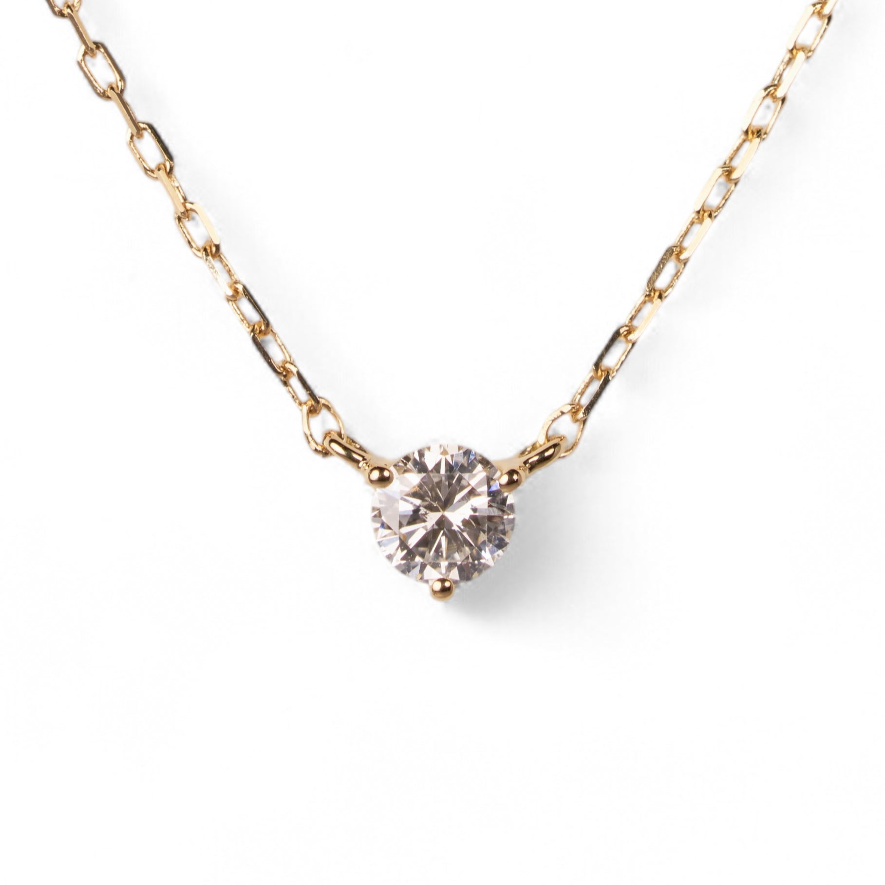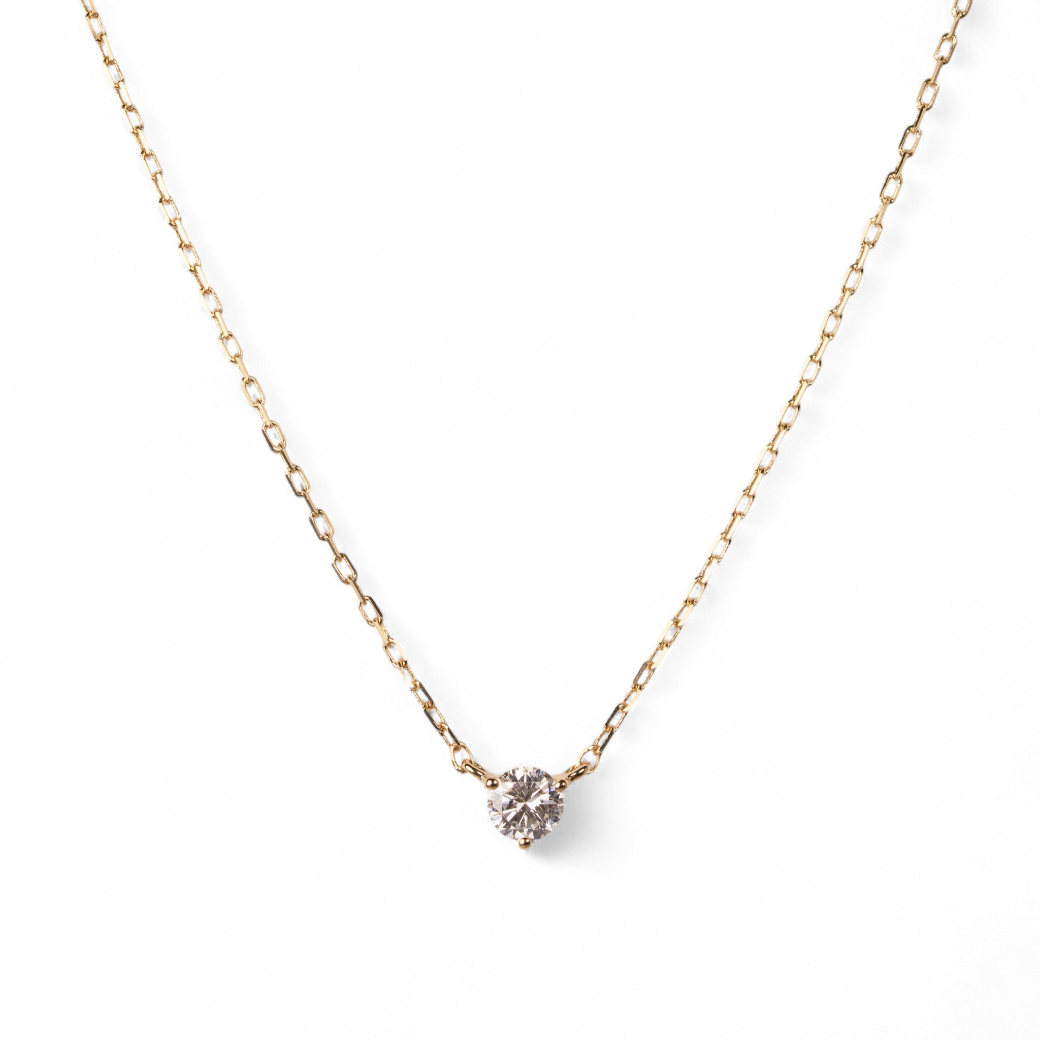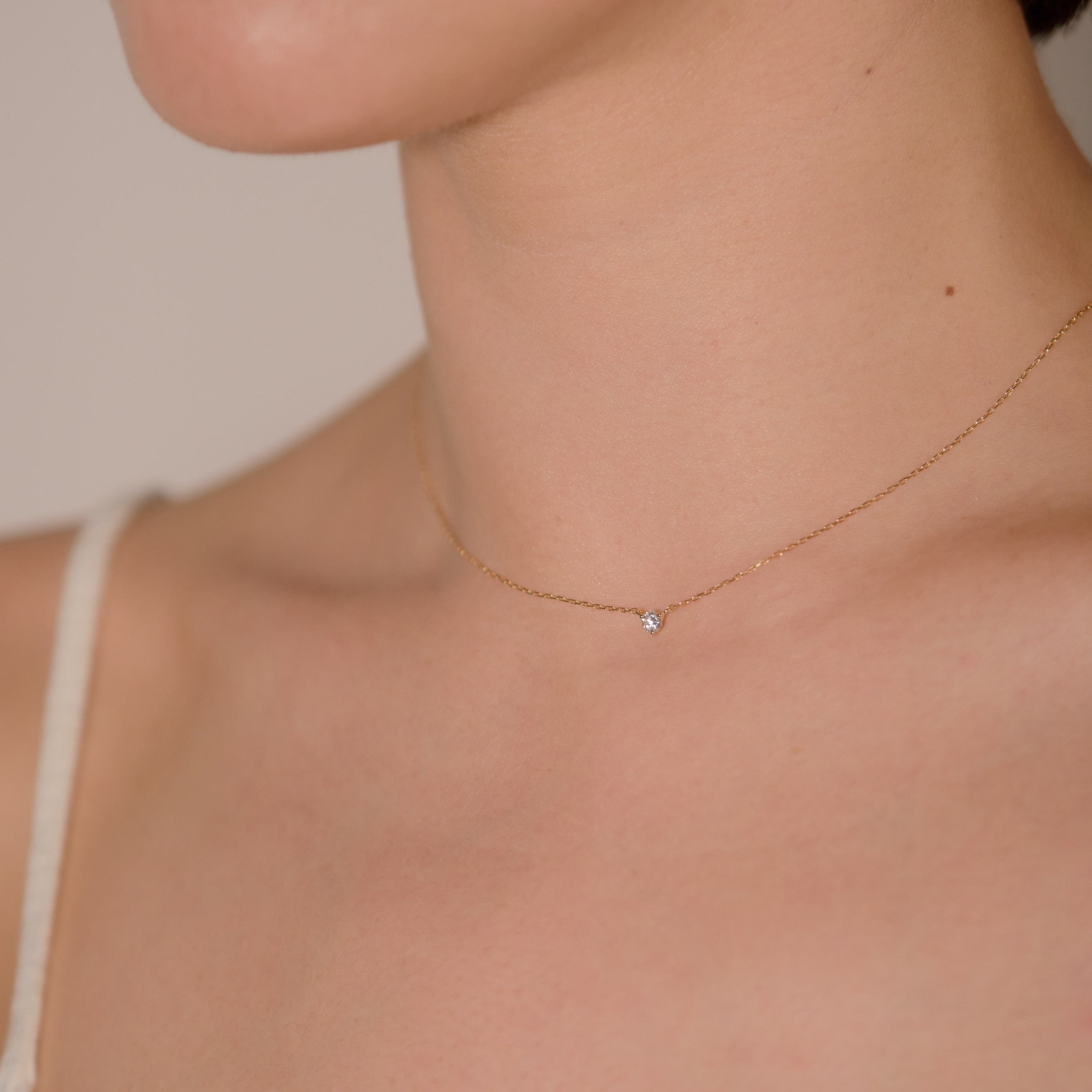 スキンジュエリーのように、さりげなくきらめく一粒ダイヤモンドネックレス。チェーンの流れに沿った3点留めのデザインが、素肌に自然と馴染み、胸元で上品な輝きを放ちます。