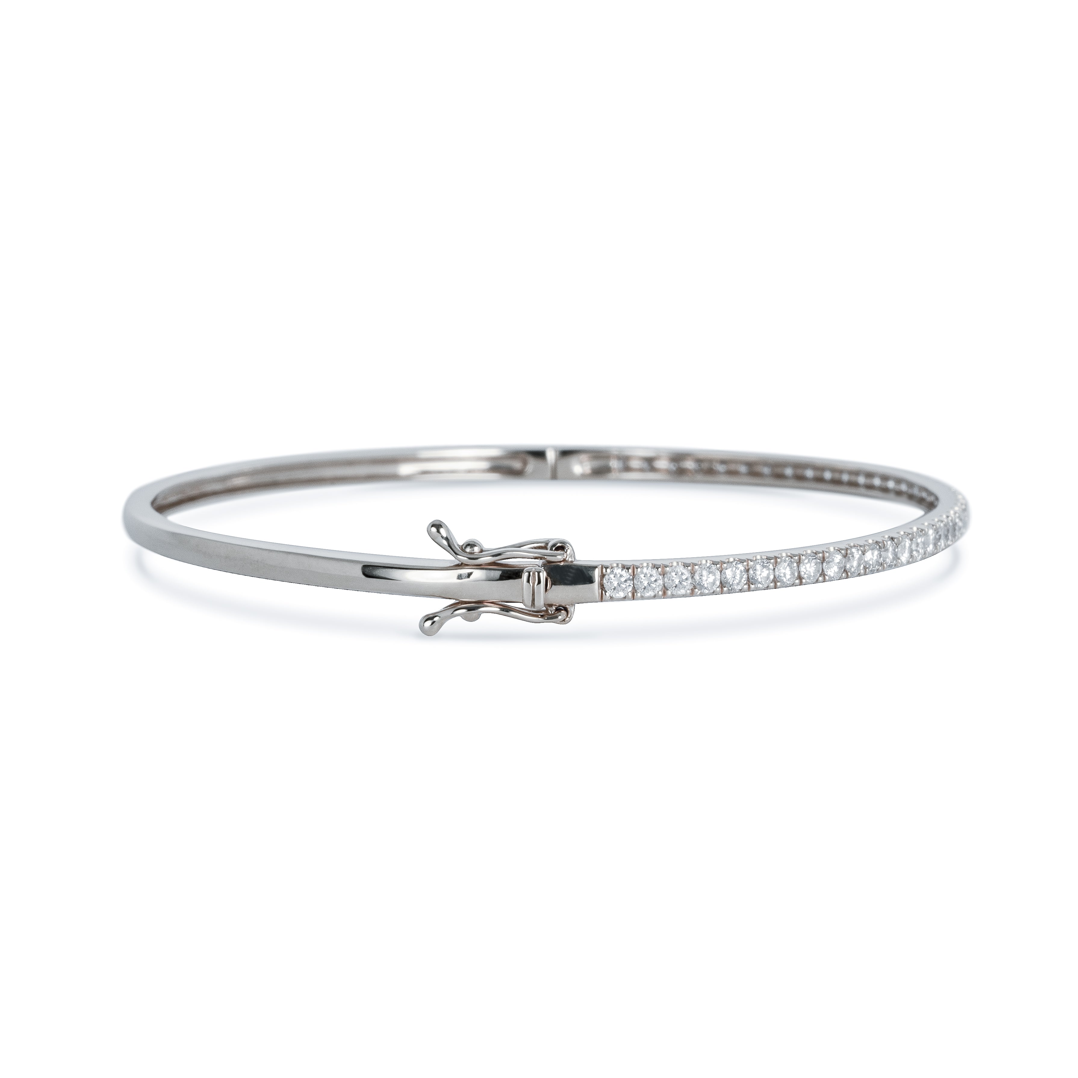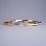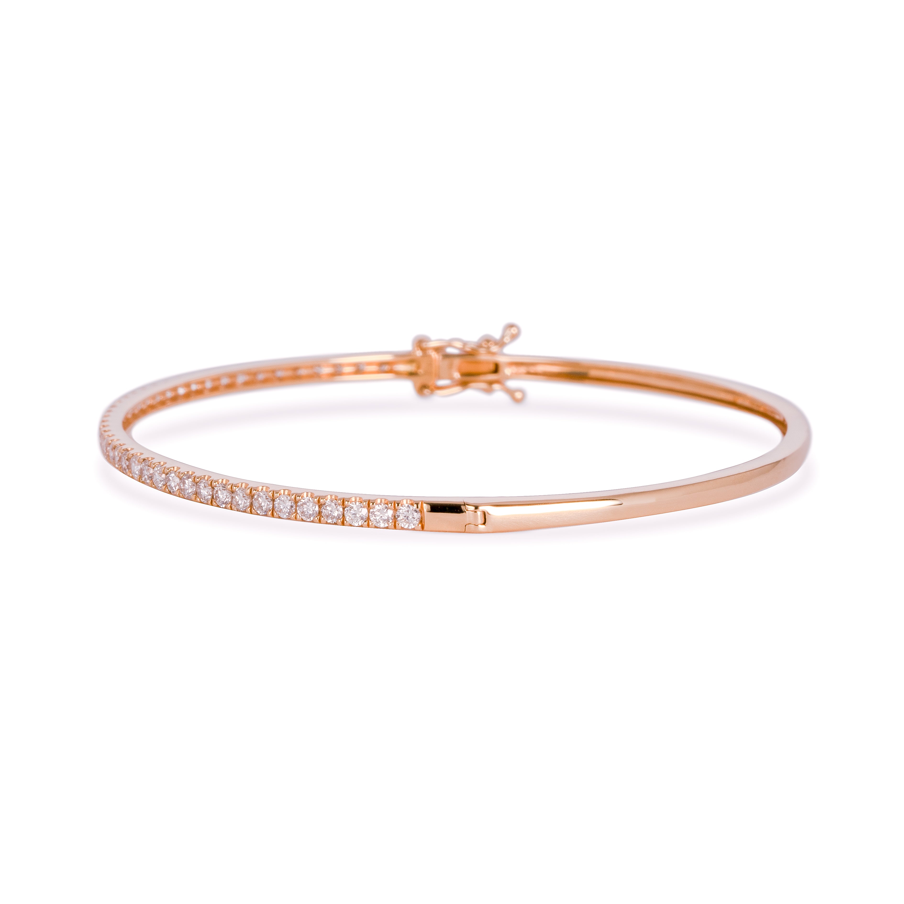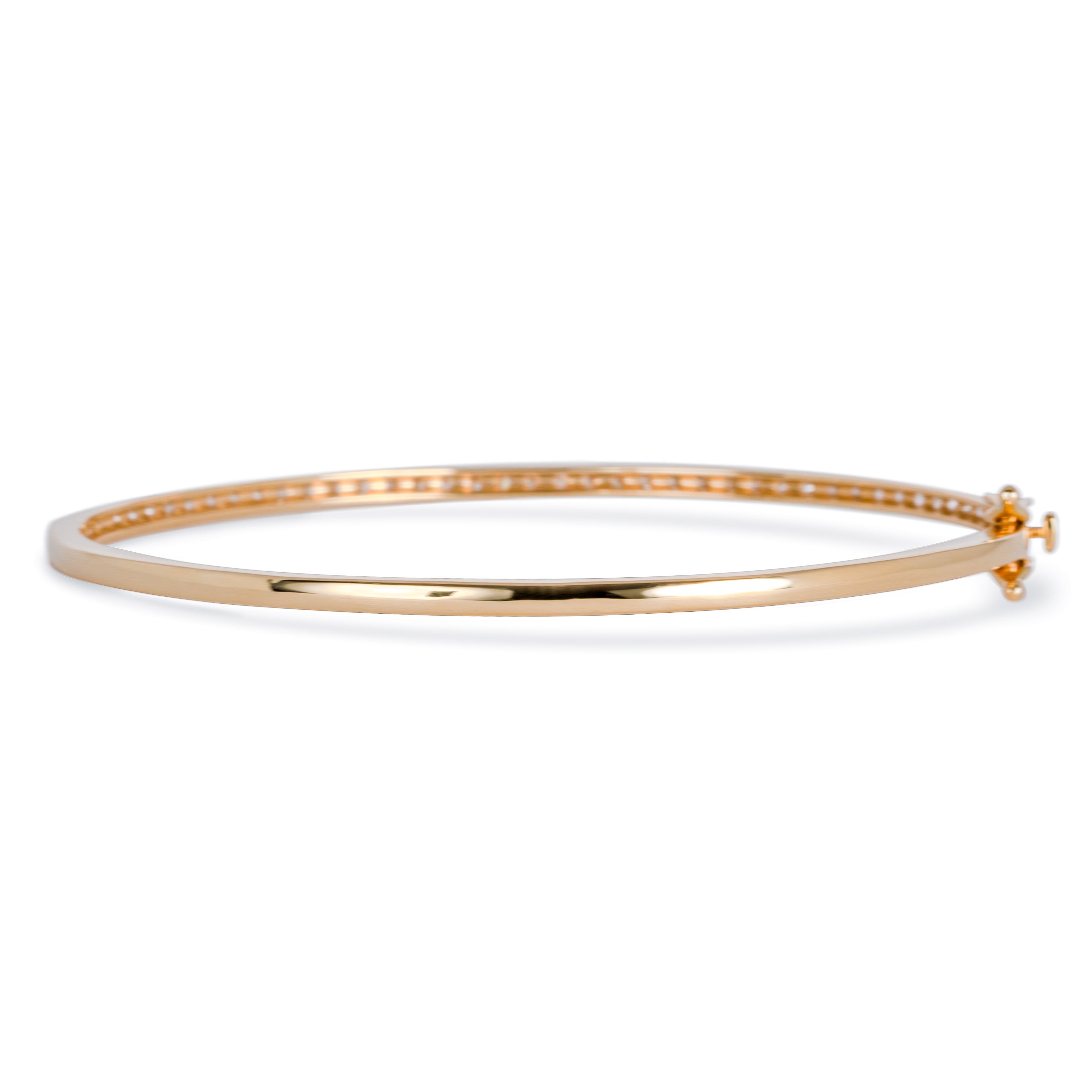 腕に自然に馴染むオーバル(楕円)形状のゴールドバングルに、トータル1カラットの上質なダイヤモンドをセッティング。あらゆるジュエリーコレクションにマッチする、こちらの万能アイテムは手にする方のスタイルを一段と引き立てます。安全かつ便利な差し込み式金具と2つのセーフティ機能を備え、日常の華やぎをしっかりとサポートします。