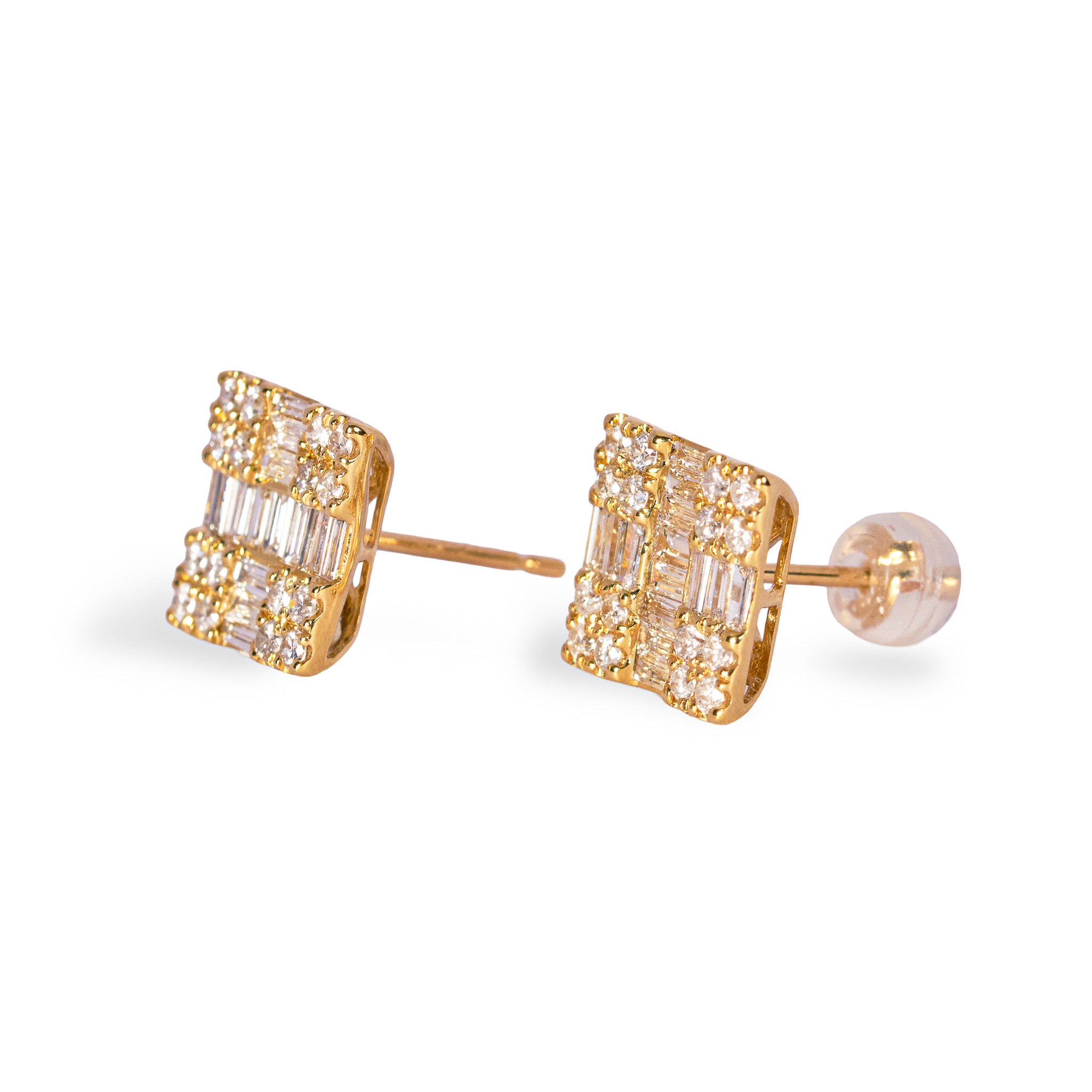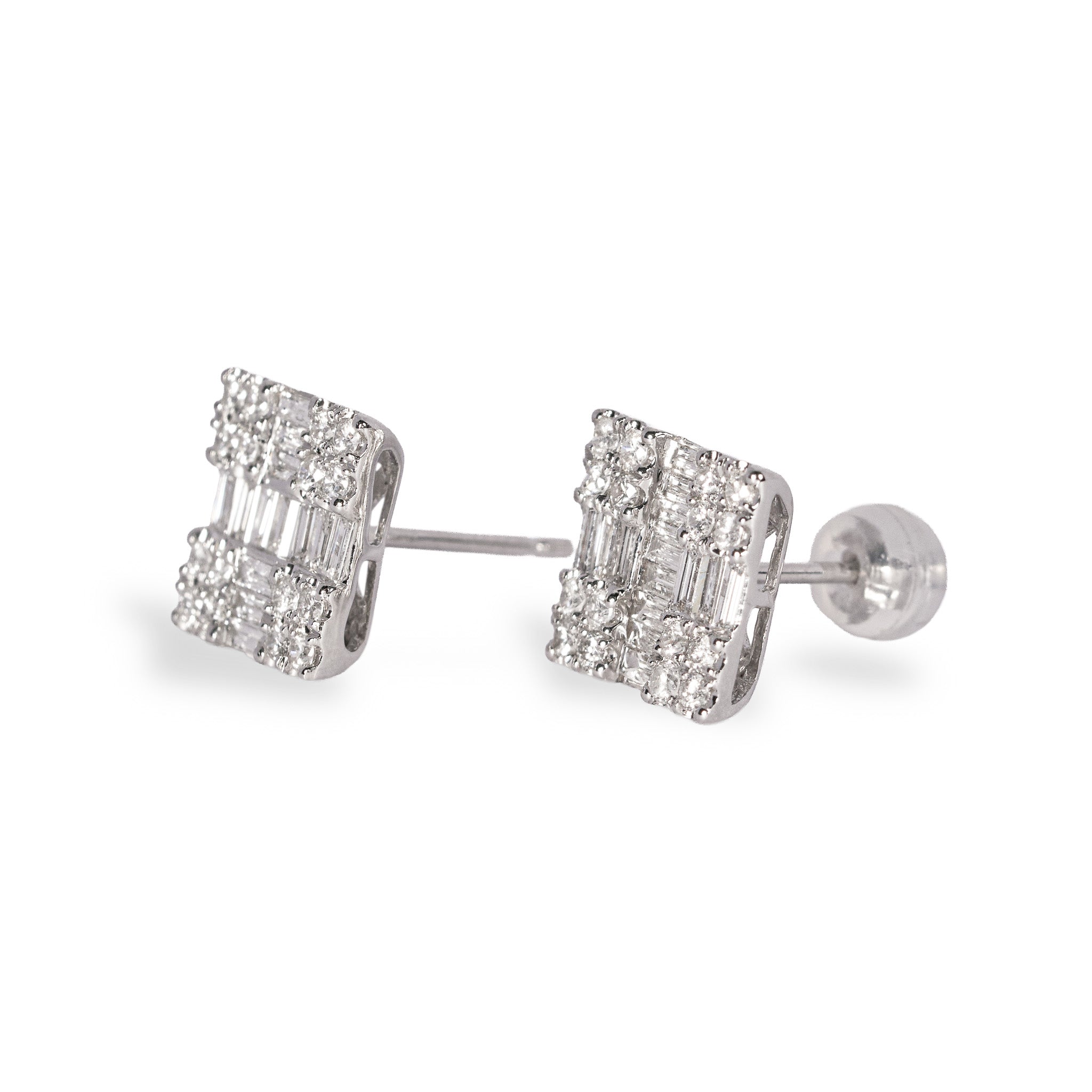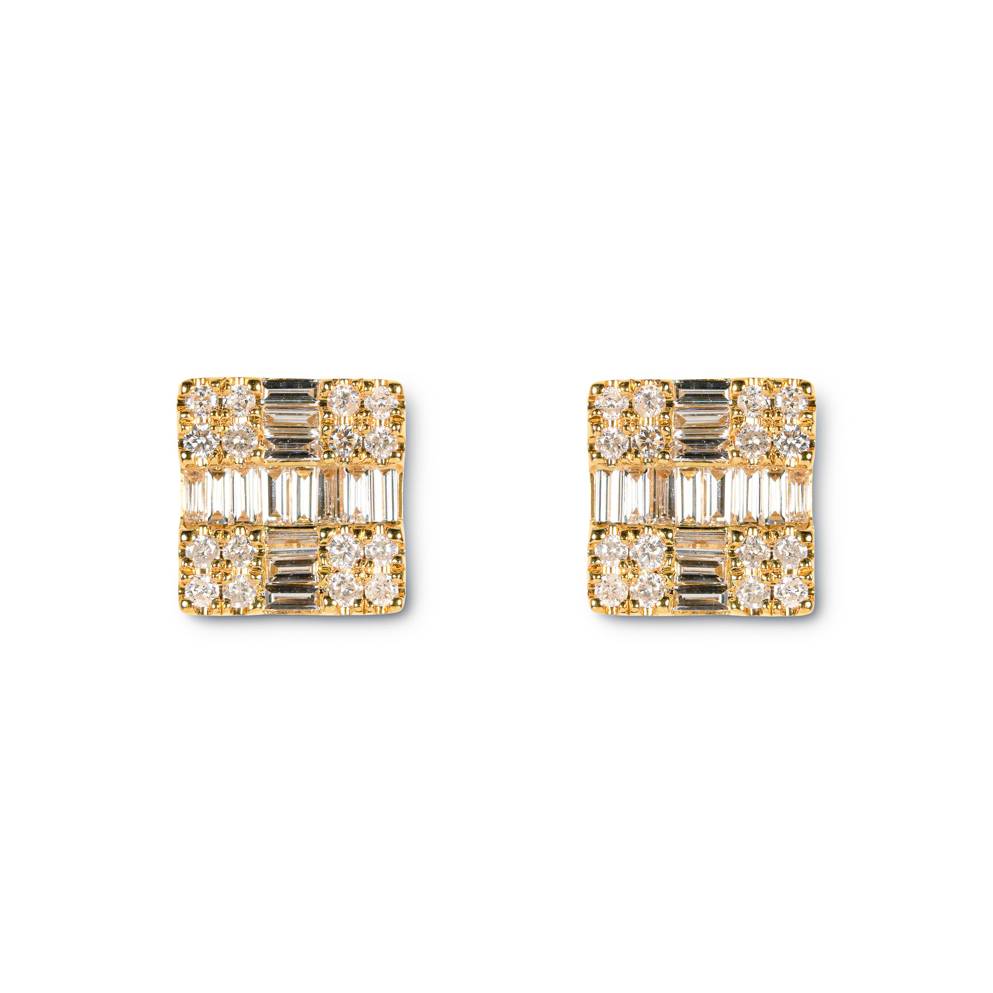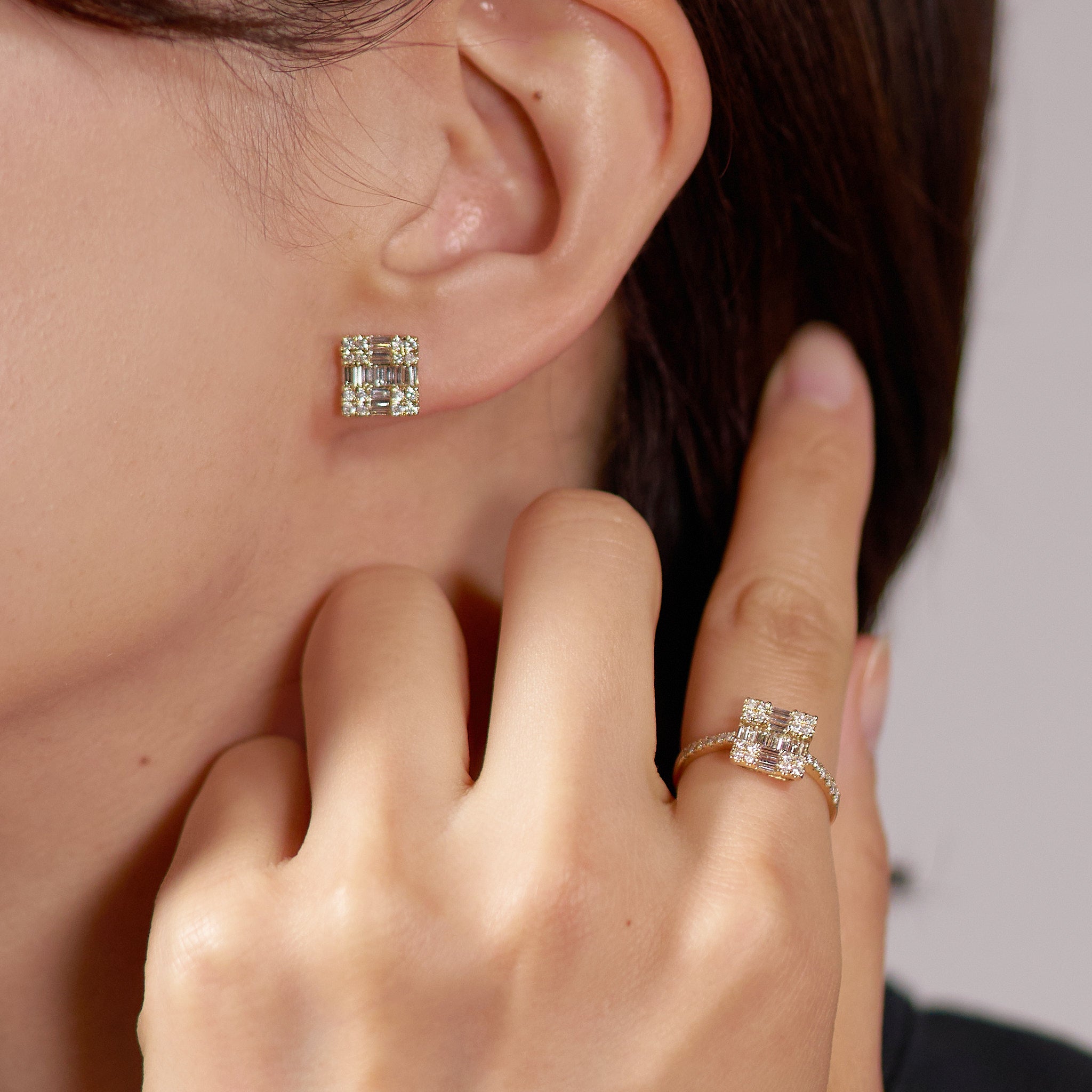 落ち着いた輝きを放つバゲットカットと、きらりと強い光を放つラウンドカット。まるで対照的な2つの個性がひとつになった、ユニークなダイヤモンドピアスです。スクエアフォルムにミックスカットのアクセントを添えた絶妙なバランスで、どの角度から見ても、とびきりクールな存在感を放ちます。