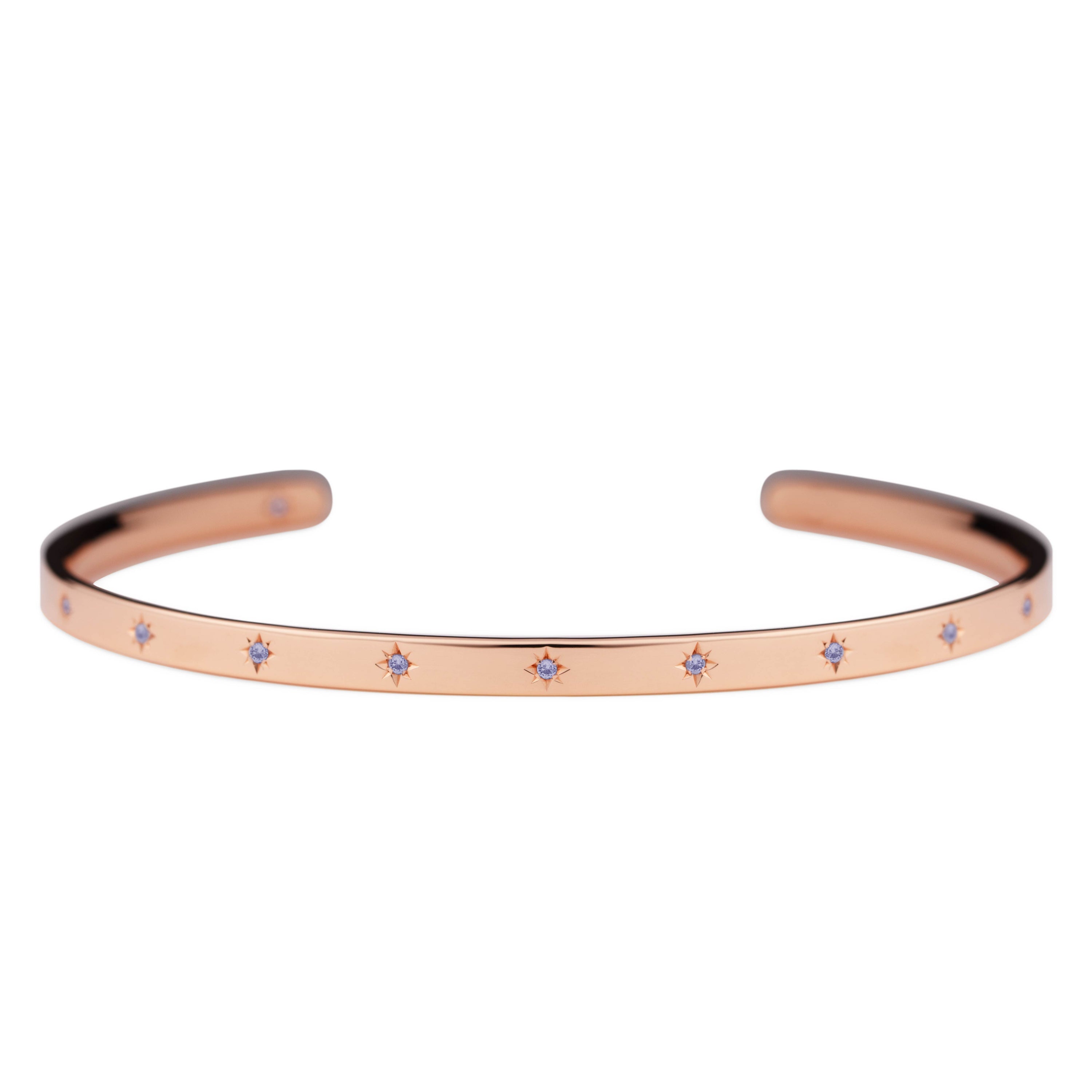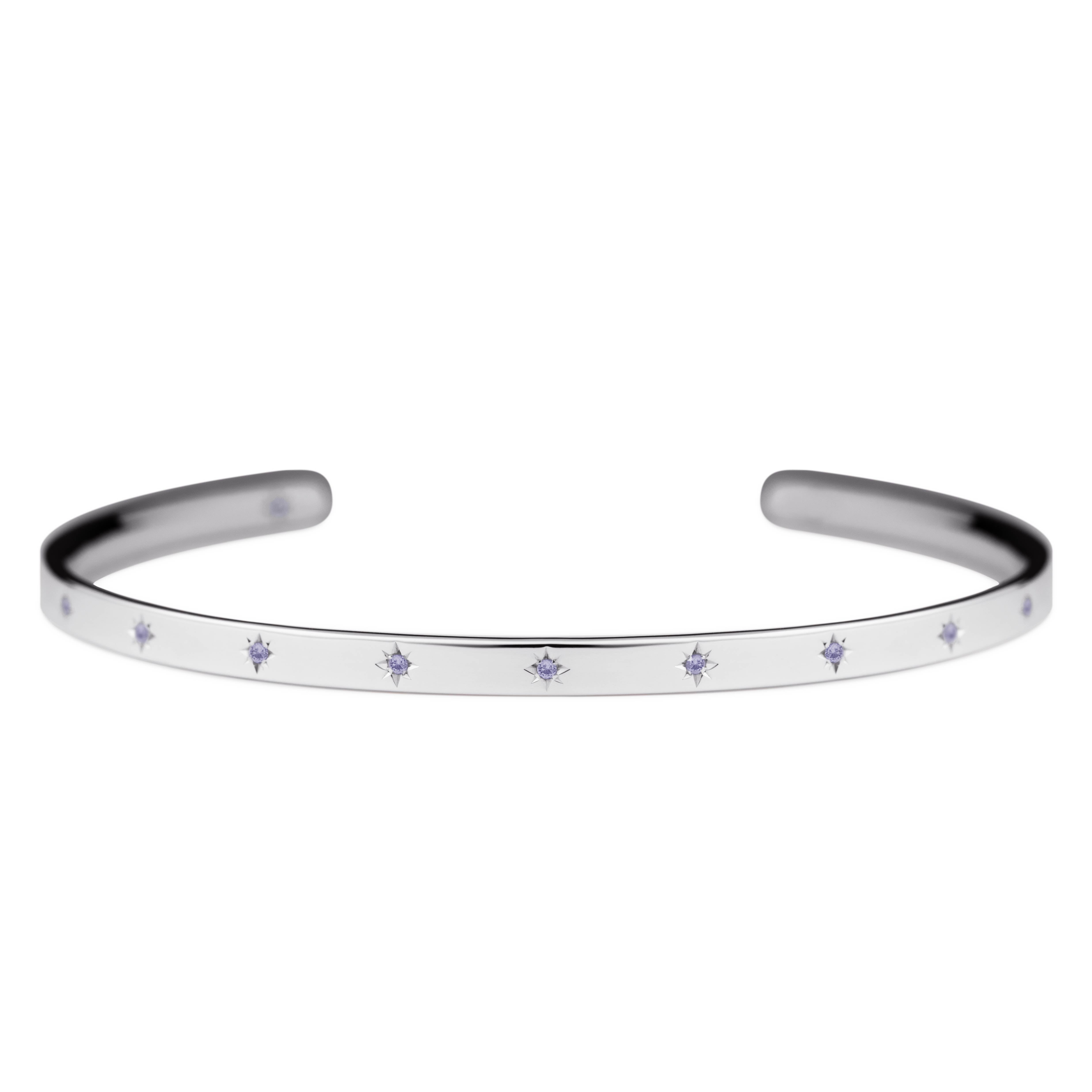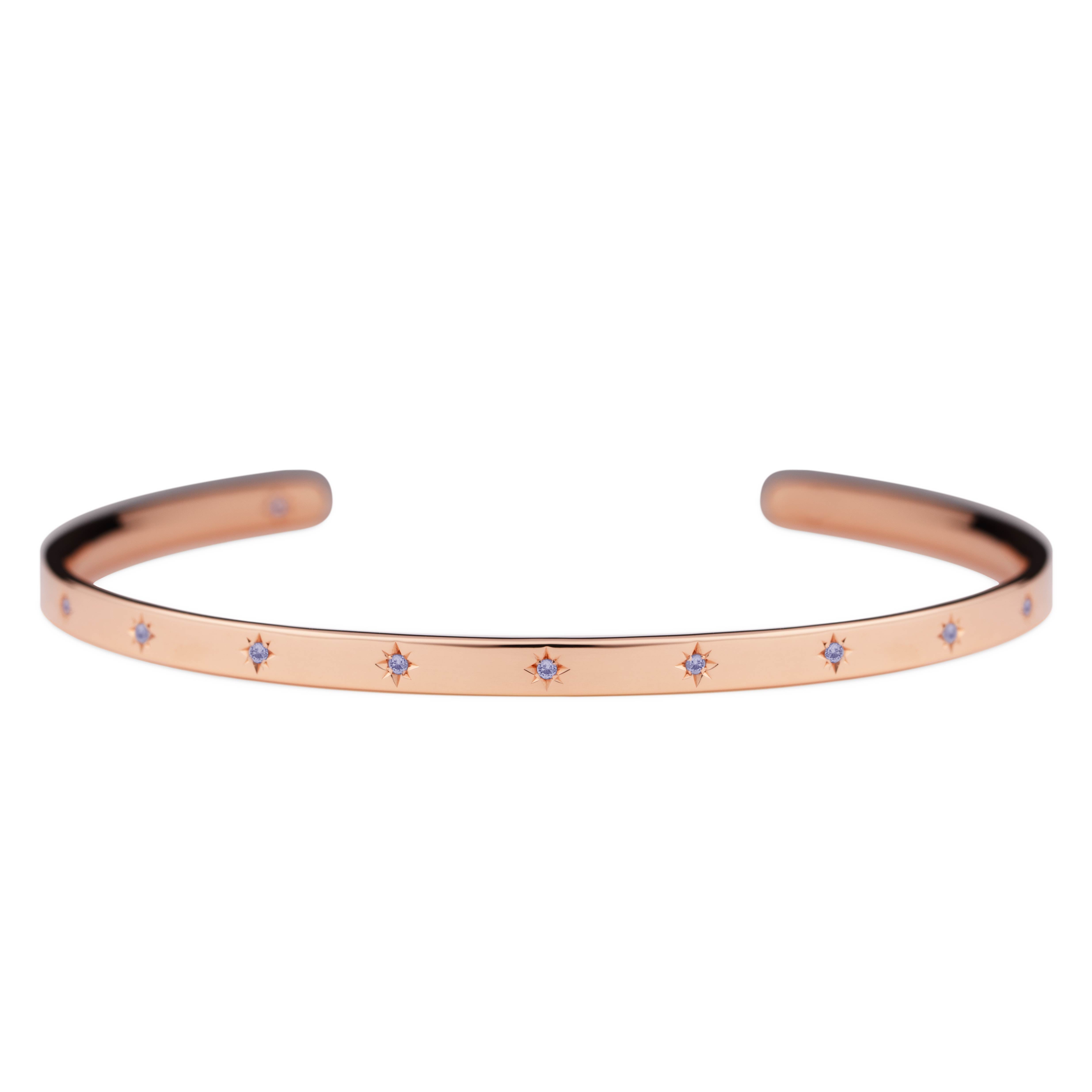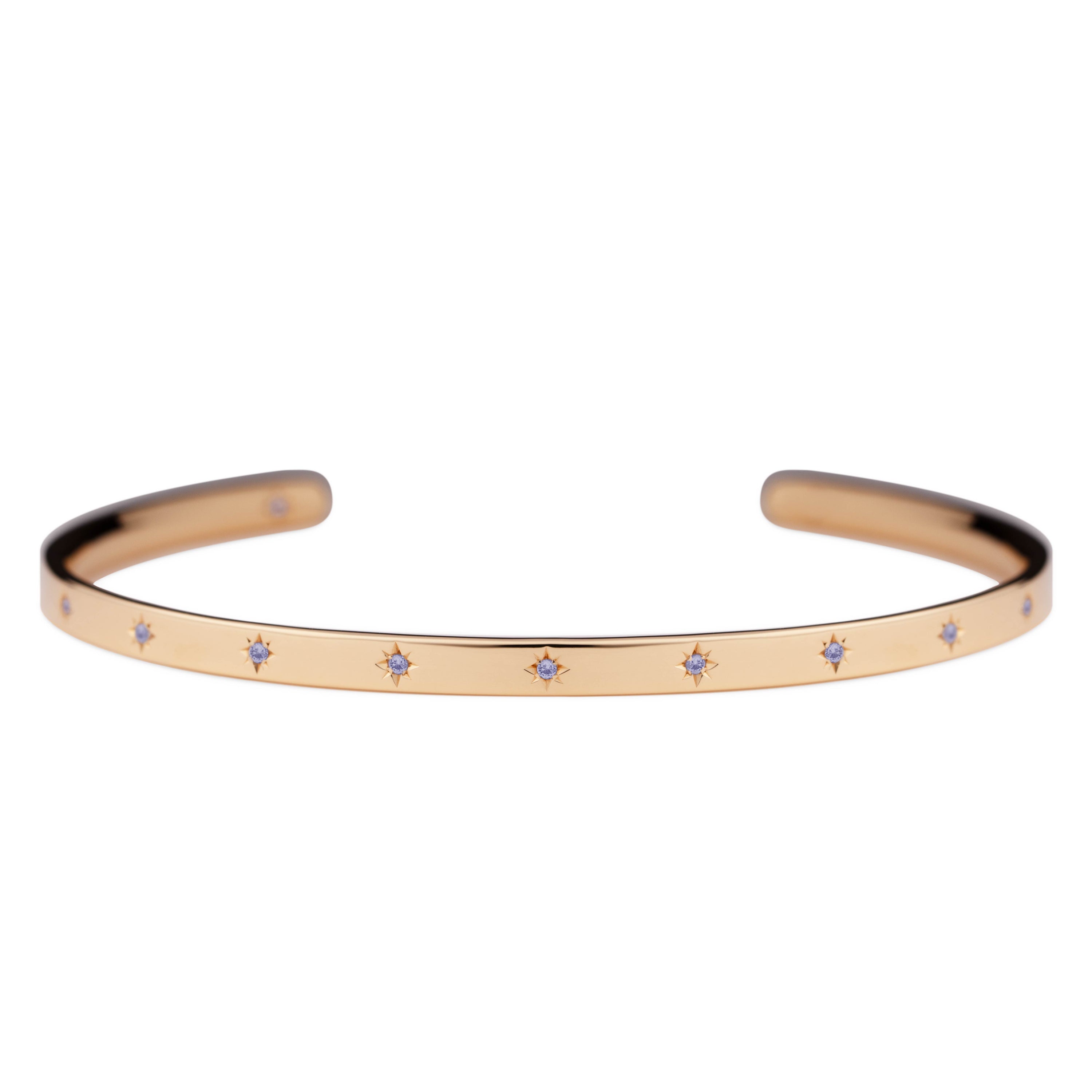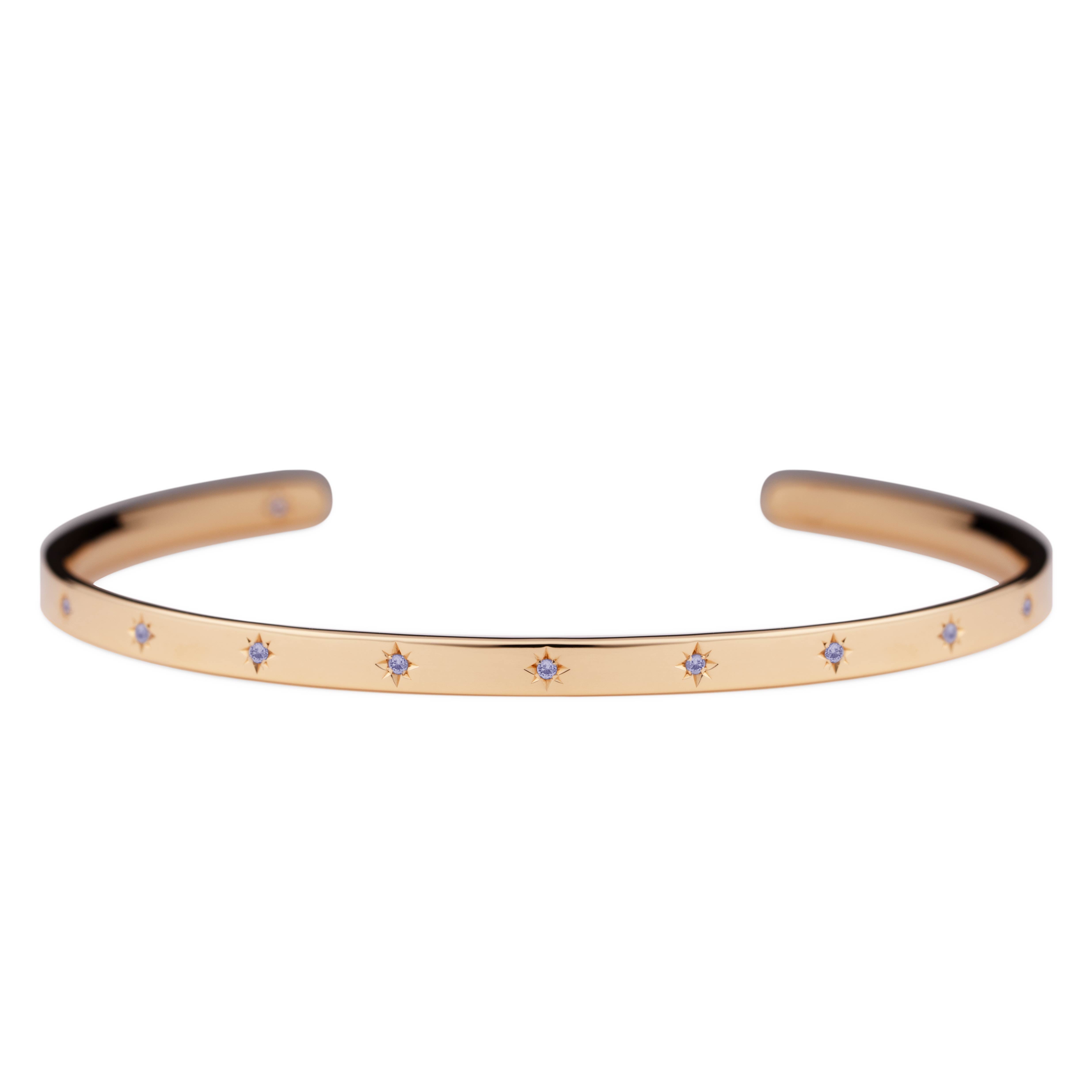 腕に自然に馴染むオーバル(楕円)形状のオープンバングル。12月の誕生石であるタンザナイトが、星型に手彫りで丁寧に留められています。表面には11の星が輝き、バングルの内側には1つの星がそっと隠れ、身に着ける方を優しく守ります。
