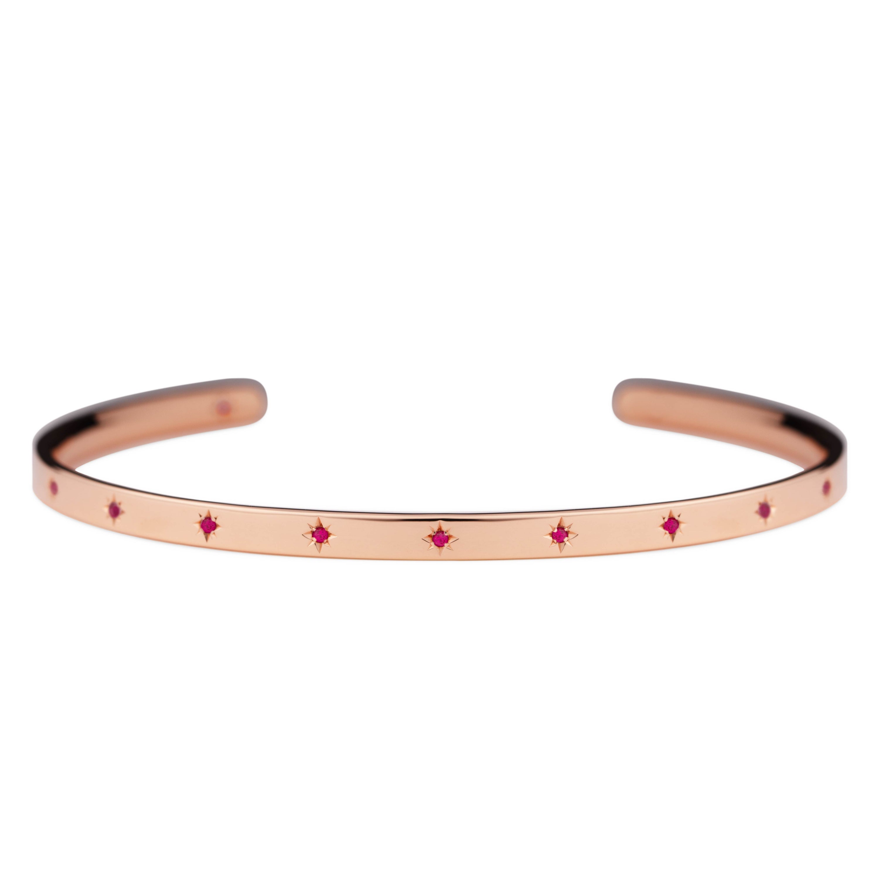 腕に自然に馴染むオーバル(楕円)形状のオープンバングル。8月の誕生石であるピンクスピネルが、星型に手彫りで丁寧に留められています。表面には11の星が輝き、バングルの内側には1つの星がそっと隠れ、身に着ける方を優しく守ります。自分自身を大切にするためのお守りとして。あるいは、パートナーとお揃いで選ぶ、大切な約束の証として。12の星が、どんな日常にも優しく寄り添い、あなたのお手元をそっと輝かせます。オープンバングルは、留め具なしで手首に滑らせるだけで簡単に装着できる実用性と、ユニセックスで楽しめるシンプルなデザインも魅力。