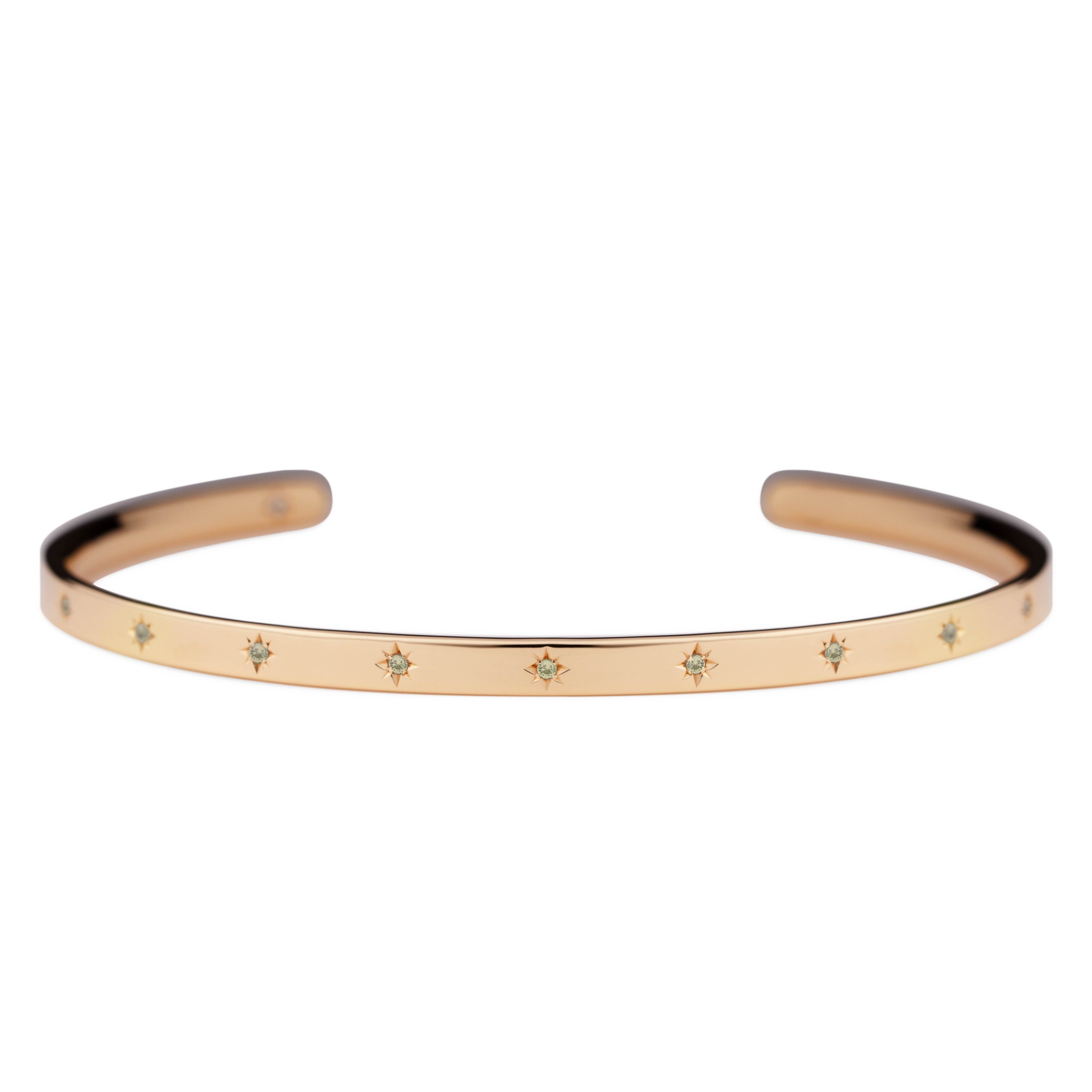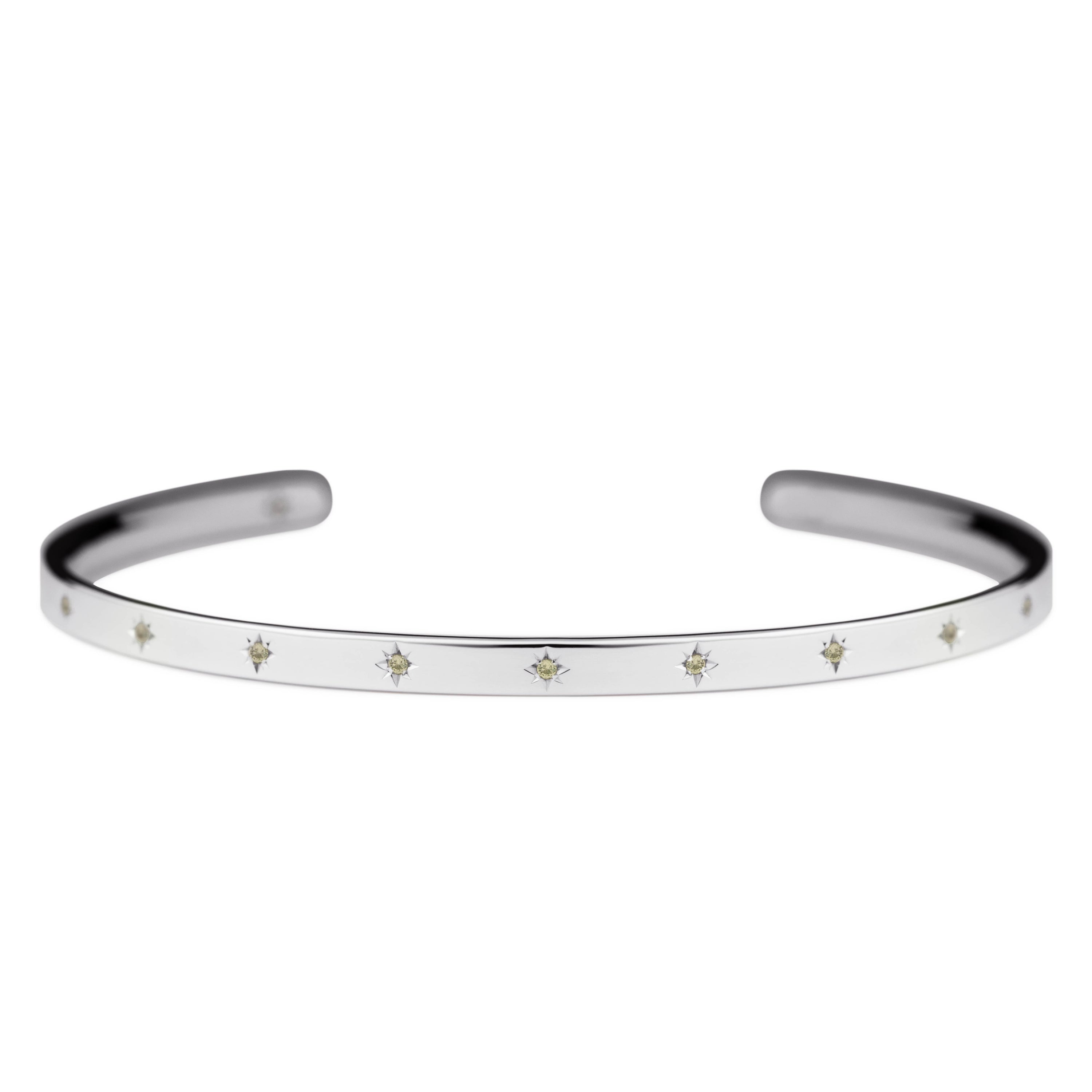 腕に自然に馴染むオーバル(楕円)形状のオープンバングル。8月の誕生石であるペリドットが、星型に手彫りで丁寧に留められています。表面には11の星が輝き、バングルの内側には1つの星がそっと隠れ、身に着ける方を優しく守ります。自分自身を大切にするためのお守りとして。あるいは、パートナーとお揃いで選ぶ、大切な約束の証として。12の星が、どんな日常にも優しく寄り添い、あなたのお手元をそっと輝かせます。オープンバングルは、留め具なしで手首に滑らせるだけで簡単に装着できる実用性と、ユニセックスで楽しめるシンプルなデザインも魅力。