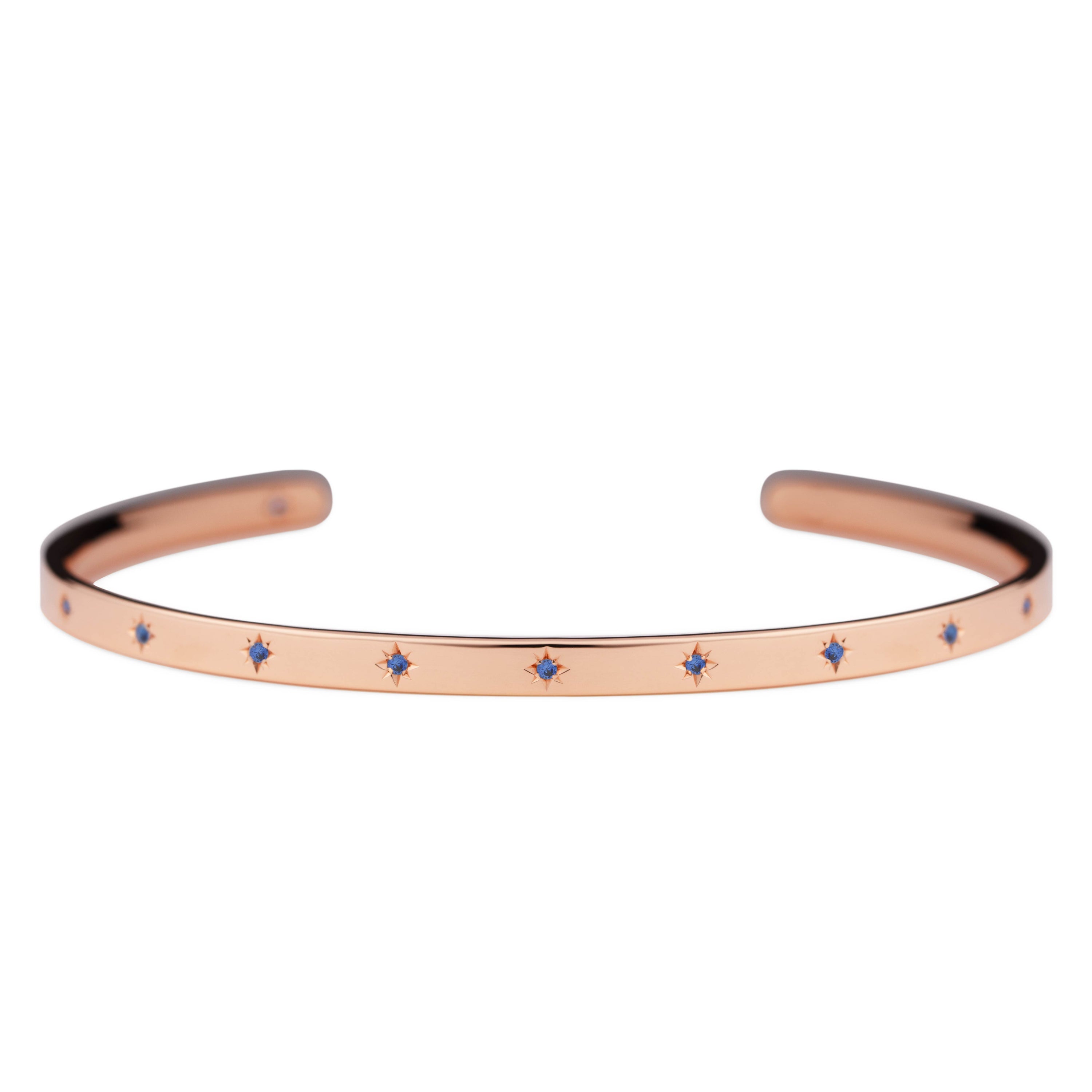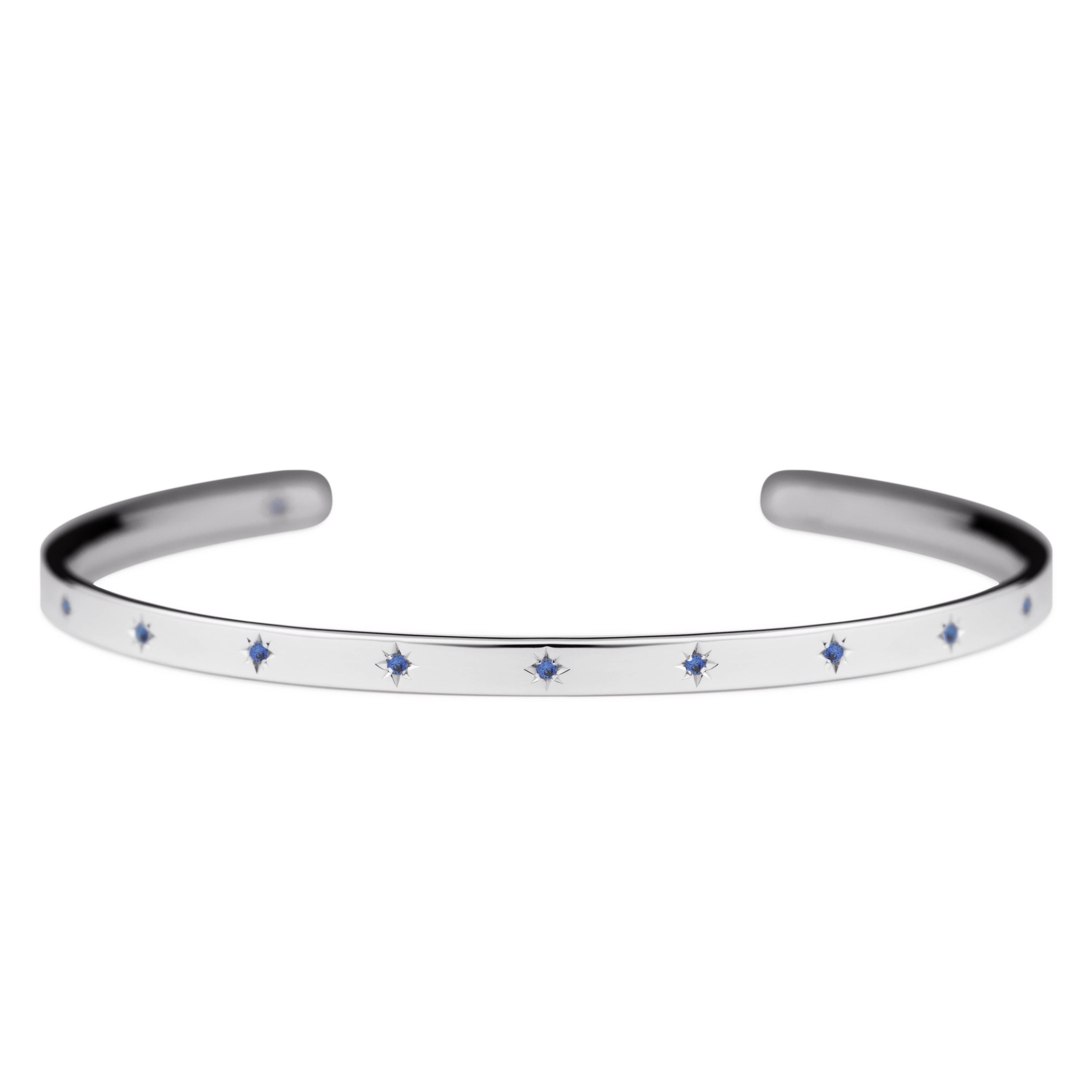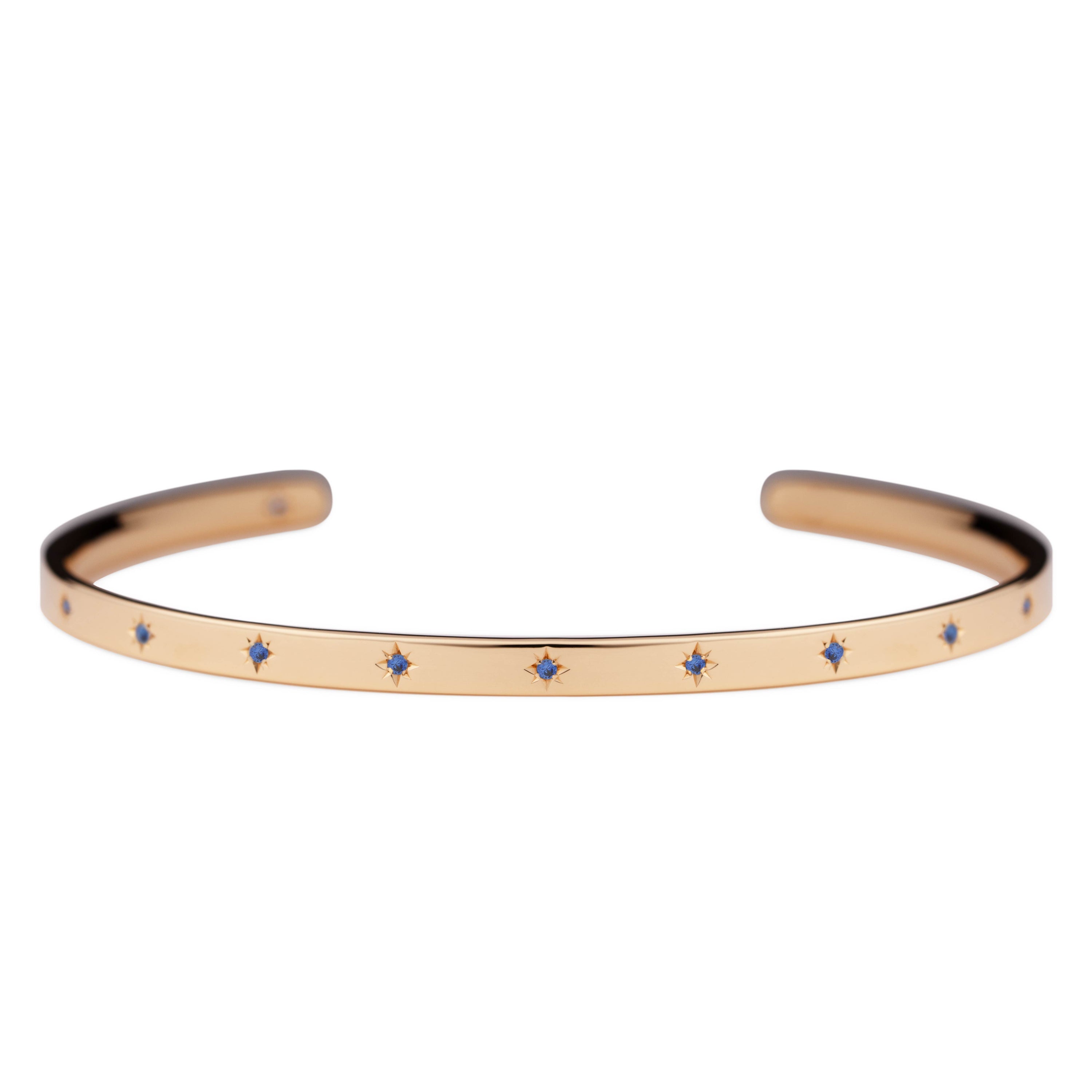 腕に自然に馴染むオーバル(楕円)形状のオープンバングル。9月の誕生石であるサファイアが、星型に手彫りで丁寧に留められています。表面には11の星が輝き、バングルの内側には1つの星がそっと隠れ、身に着ける方を優しく守ります。自分自身を大切にするためのお守りとして。あるいは、パートナーとお揃いで選ぶ、大切な約束の証として。12の星が、どんな日常にも優しく寄り添い、あなたのお手元をそっと輝かせます。オープンバングルは、留め具なしで手首に滑らせるだけで簡単に装着できる実用性と、ユニセックスで楽しめるシンプルなデザインも魅力。