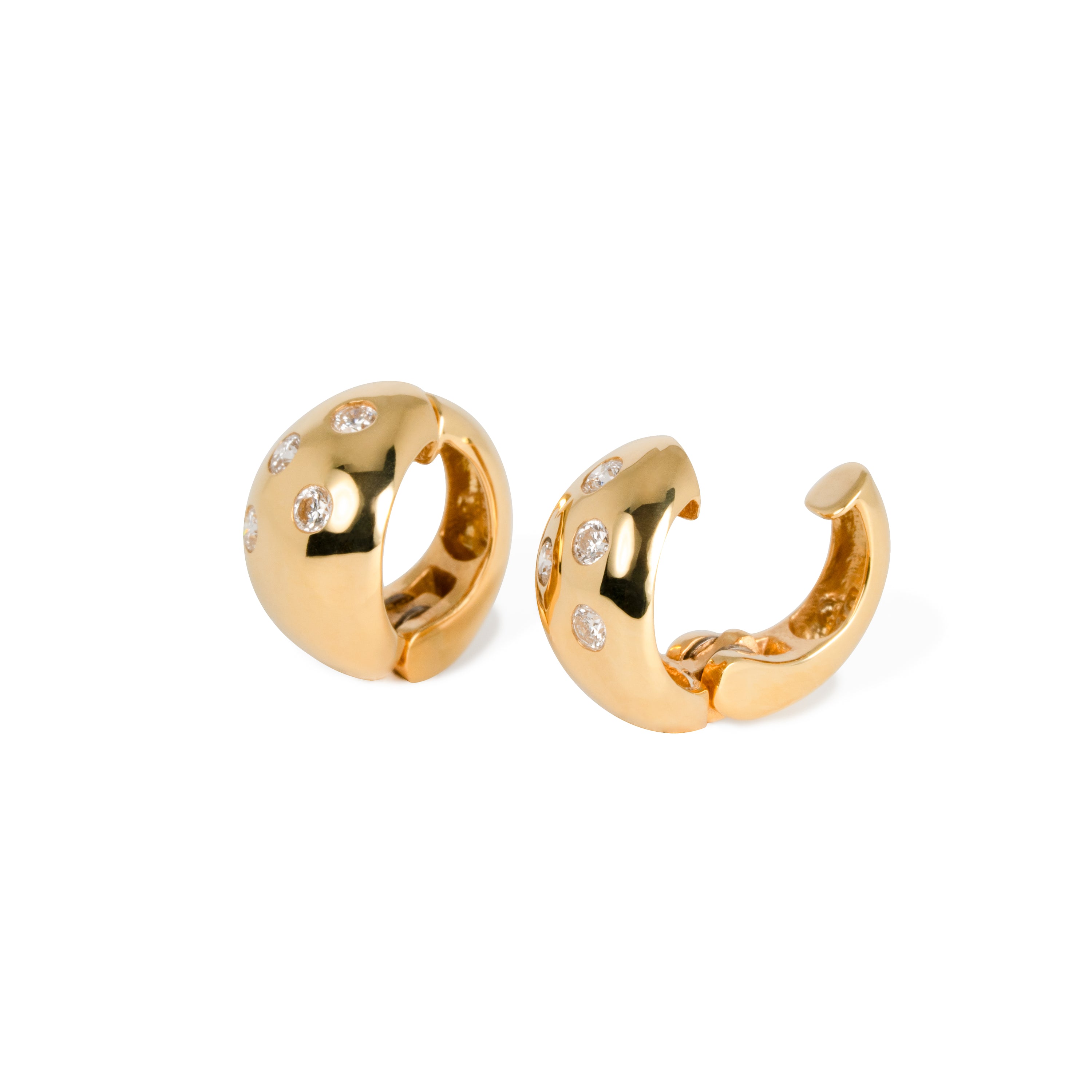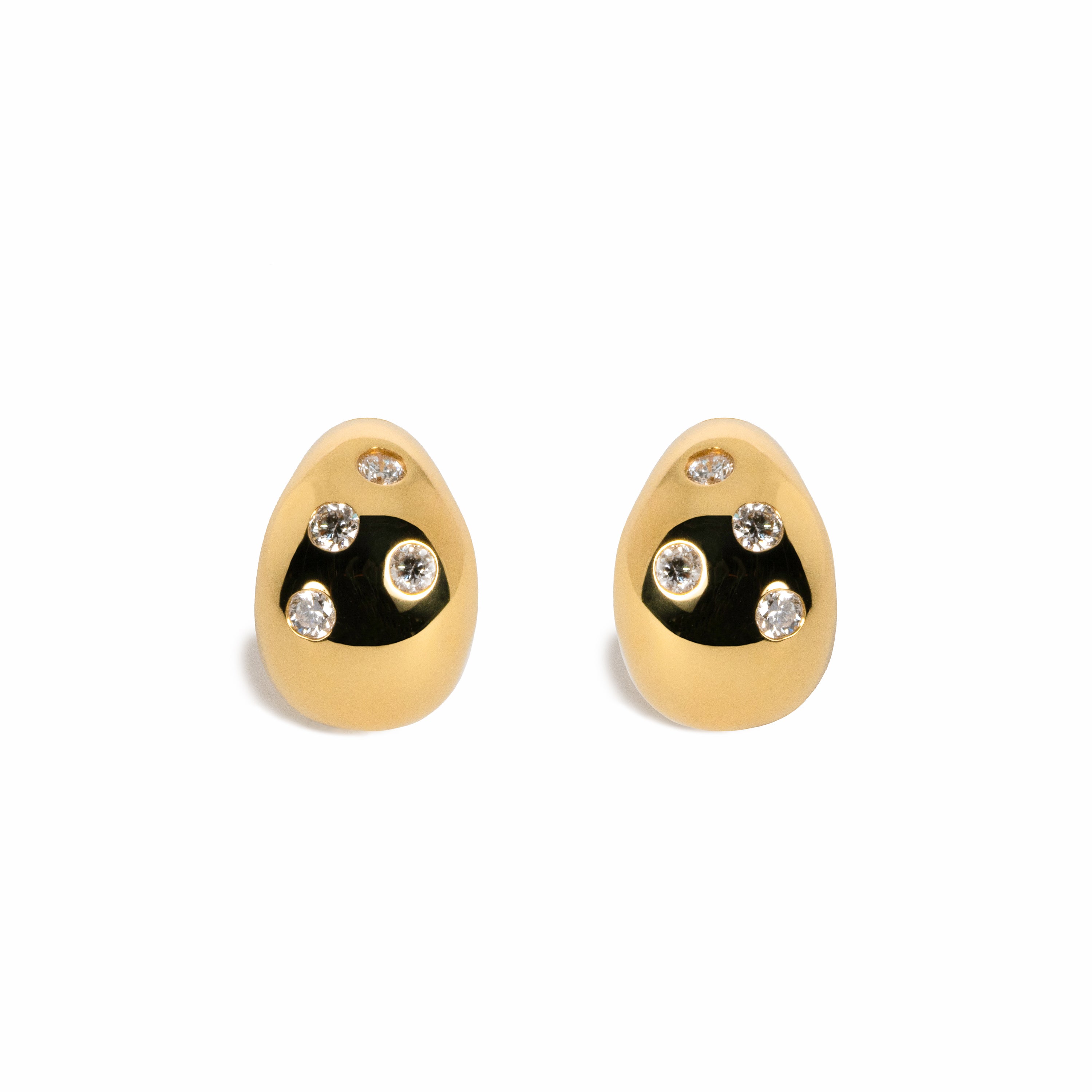 豊かなボリュームと重量感のある丸みを帯びたデザインが特徴のイヤリング。ゴールドの艶やかなボディが上質さを演出し、強い輝きを放つダイヤモンドをあしらいました。日常から特別な日まで、シンプルでいてエレガントに合わせられるアイテムです。