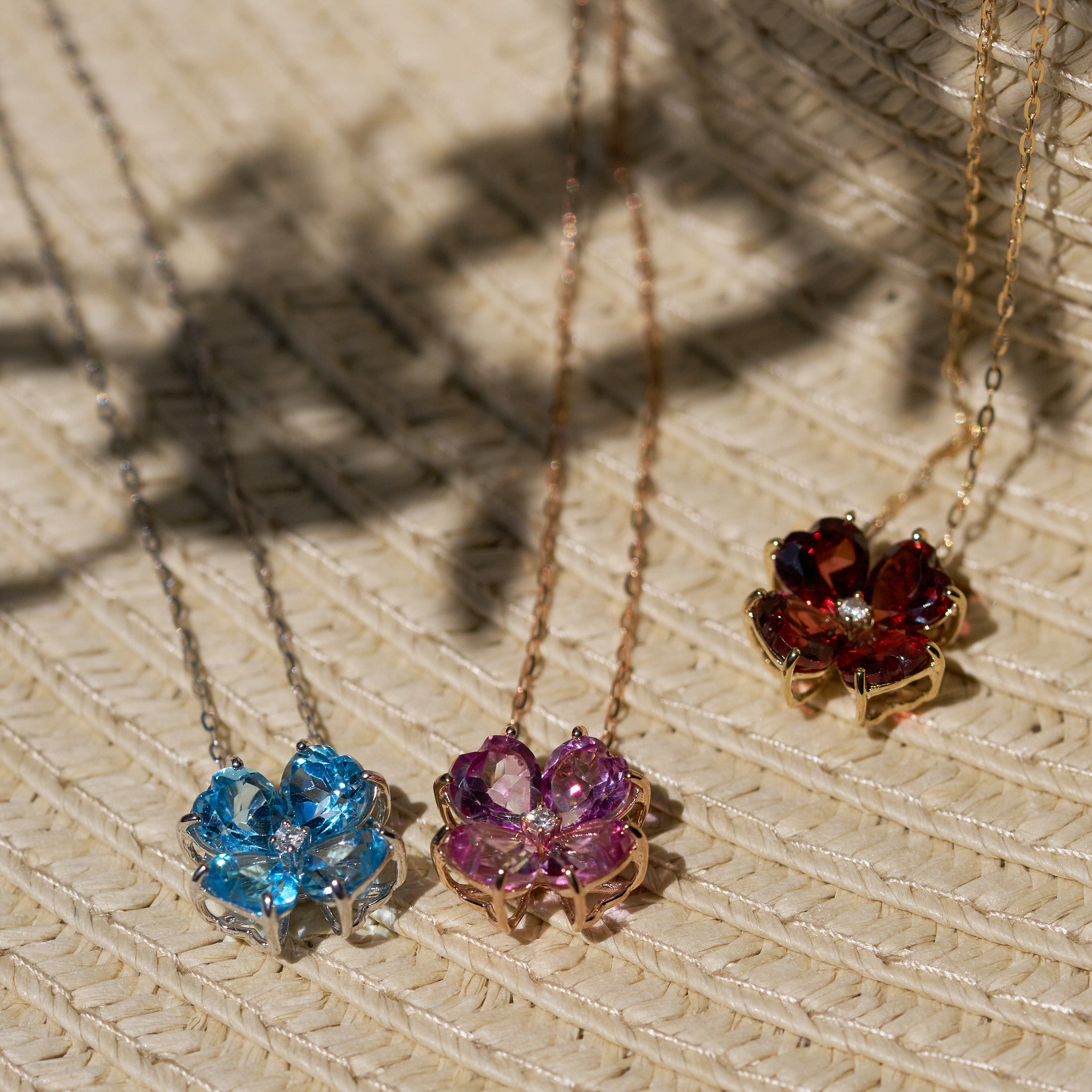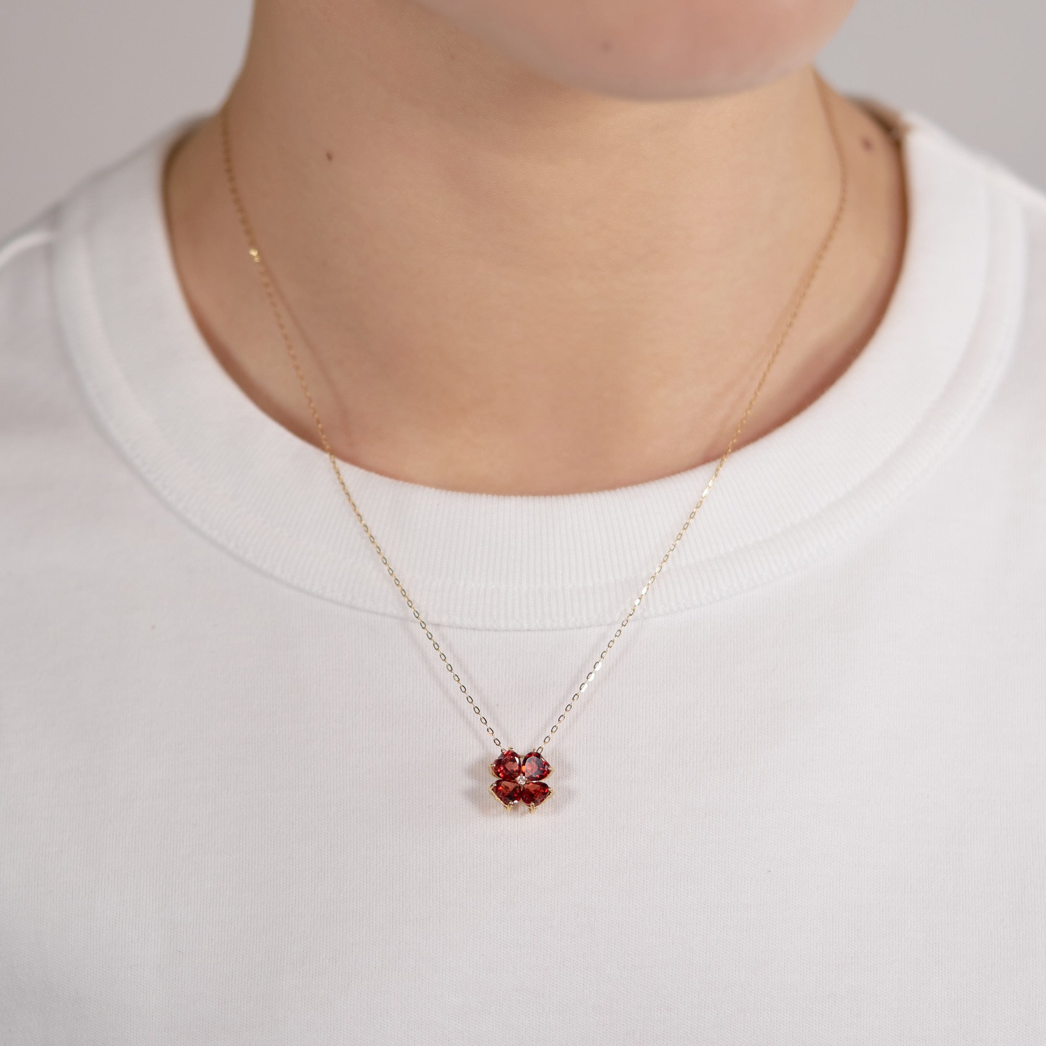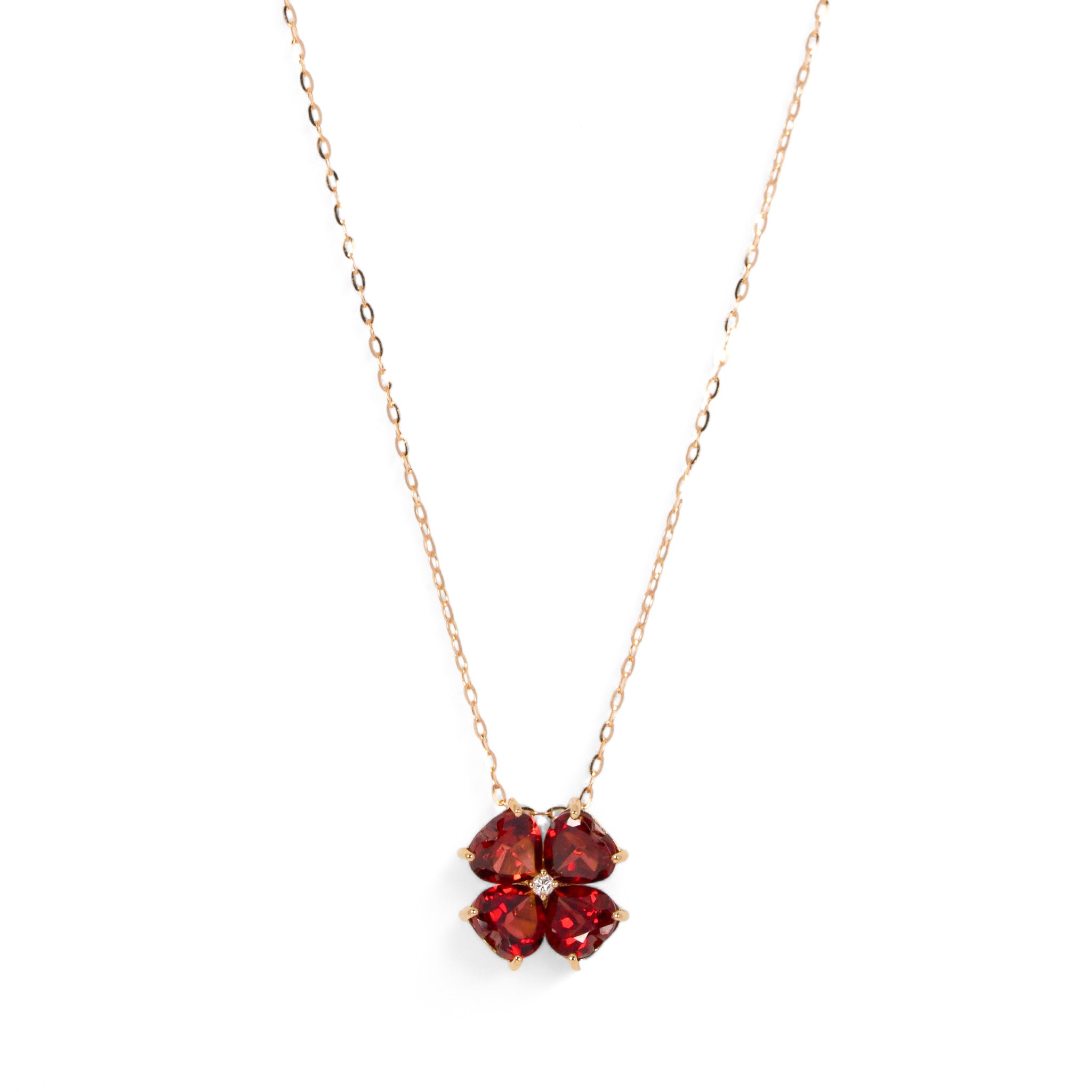 4枚のハートシェイプのガーネットの花びらが咲き誇り、生命を宿したネックレス。花びら一枚一枚の角度にこだわり、華やかさの中にも奥行きのある印象を演出します。お首元にそっと咲く、凛とした可憐さが魅力です。