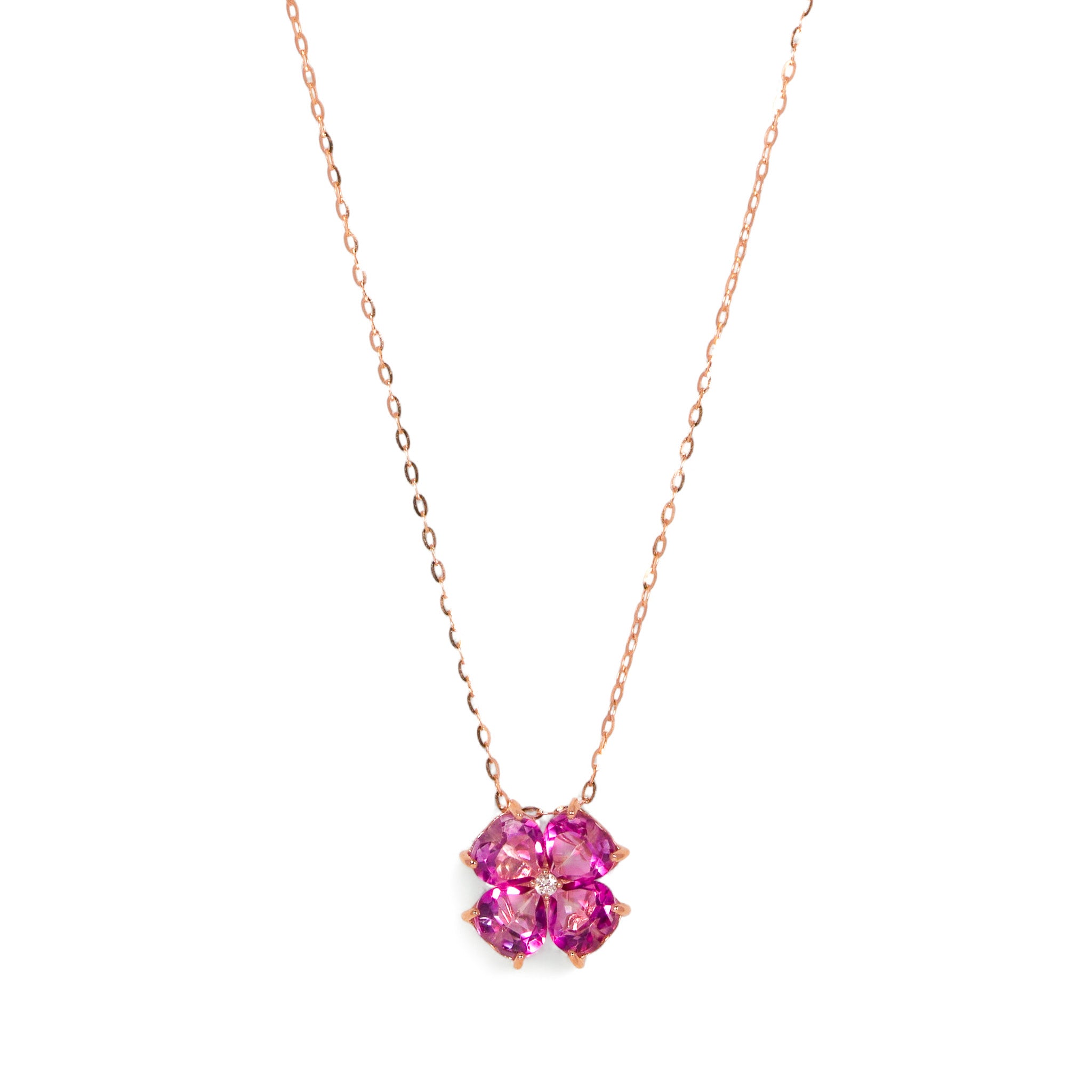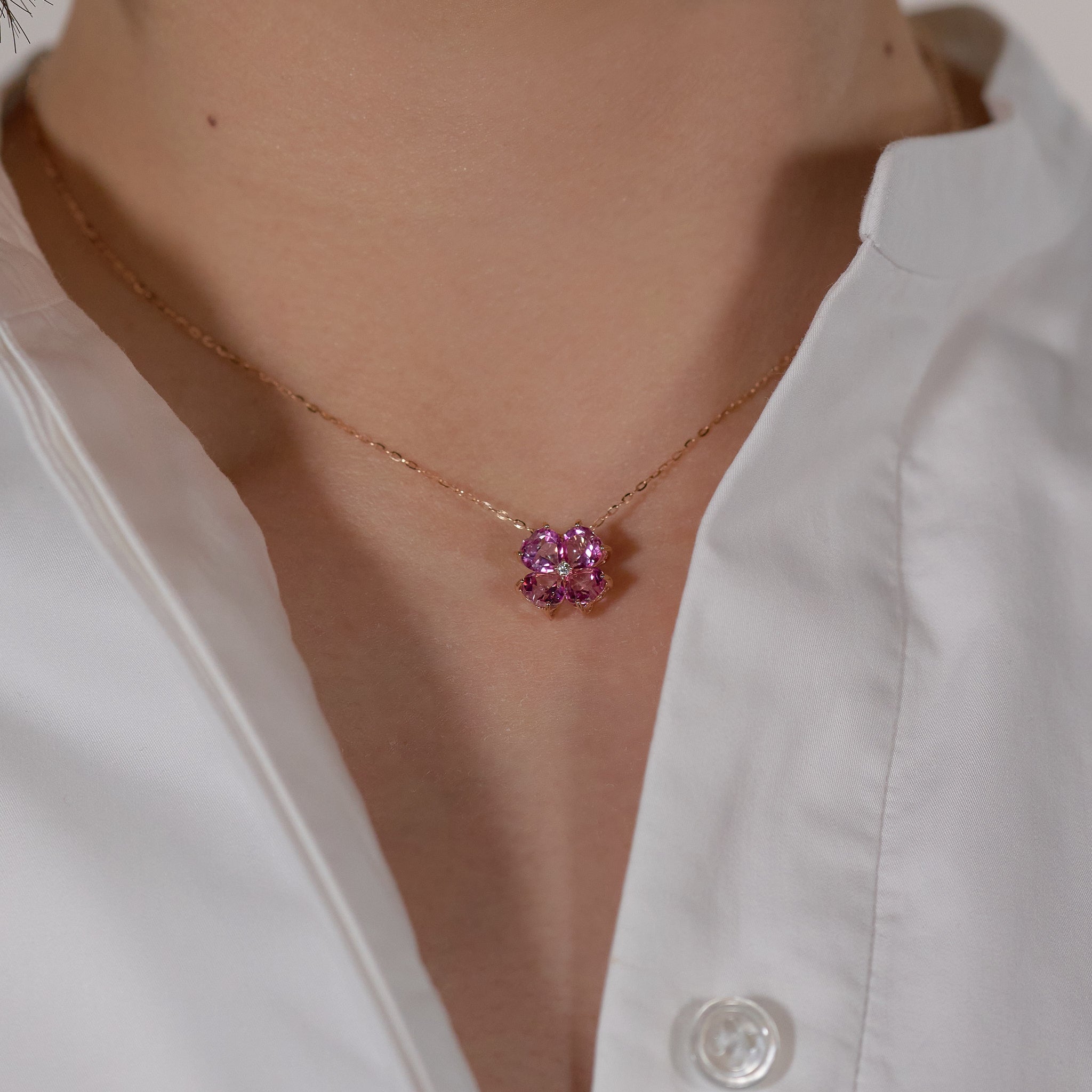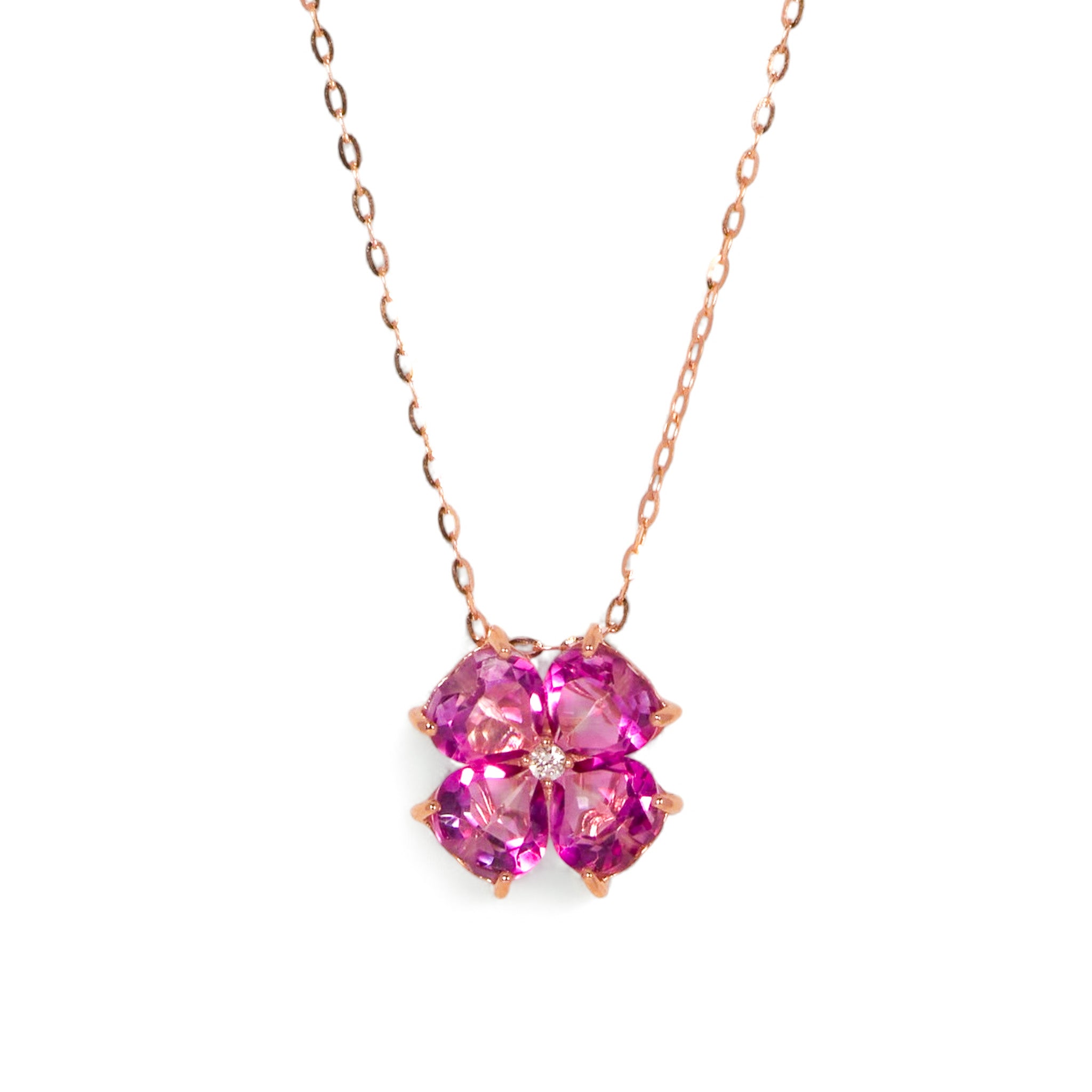 4枚のハートシェイプのピンクトパーズの花びらが咲き誇り、生命を宿したネックレス。花びら一枚一枚の角度にこだわり、華やかさの中にも奥行きのある印象を演出します。