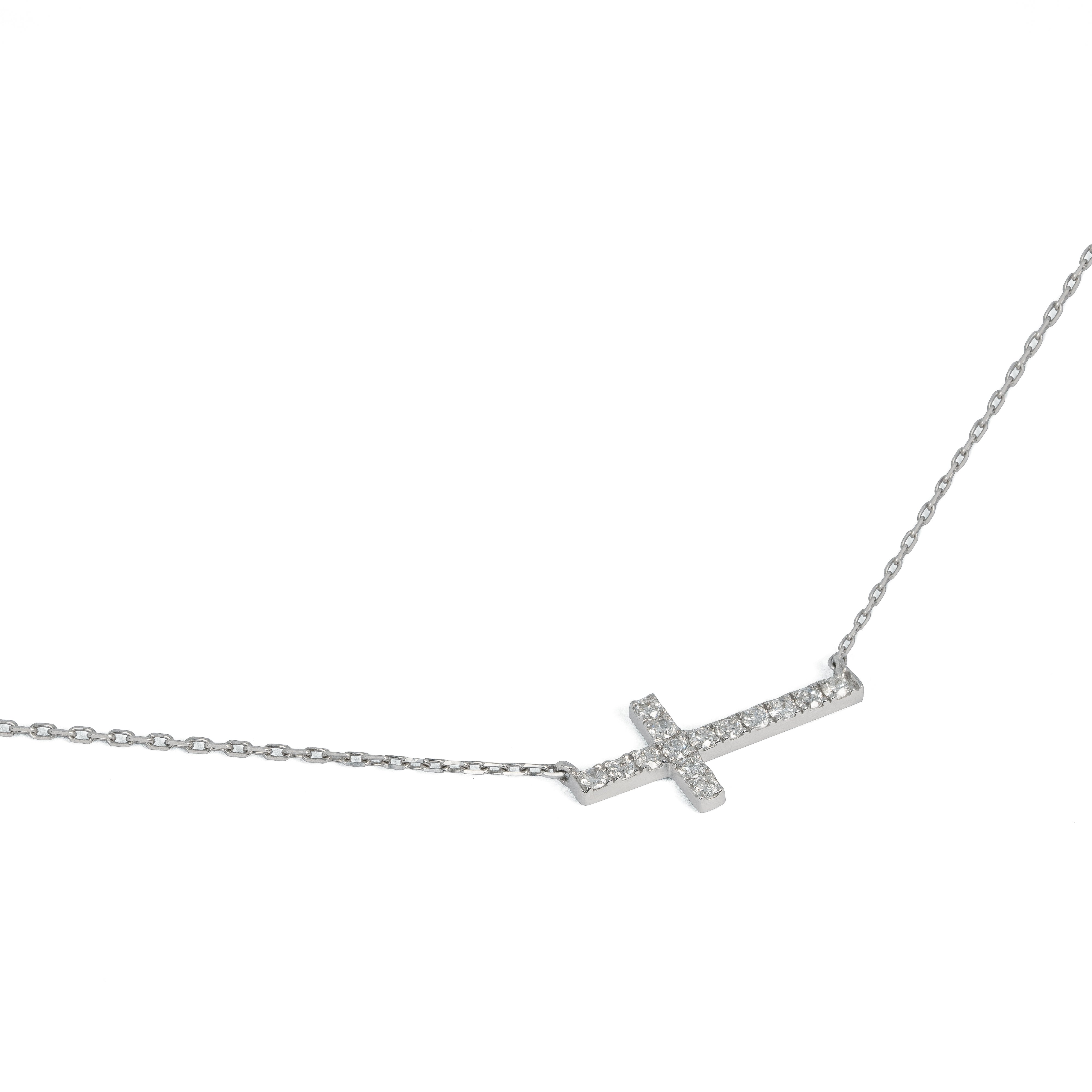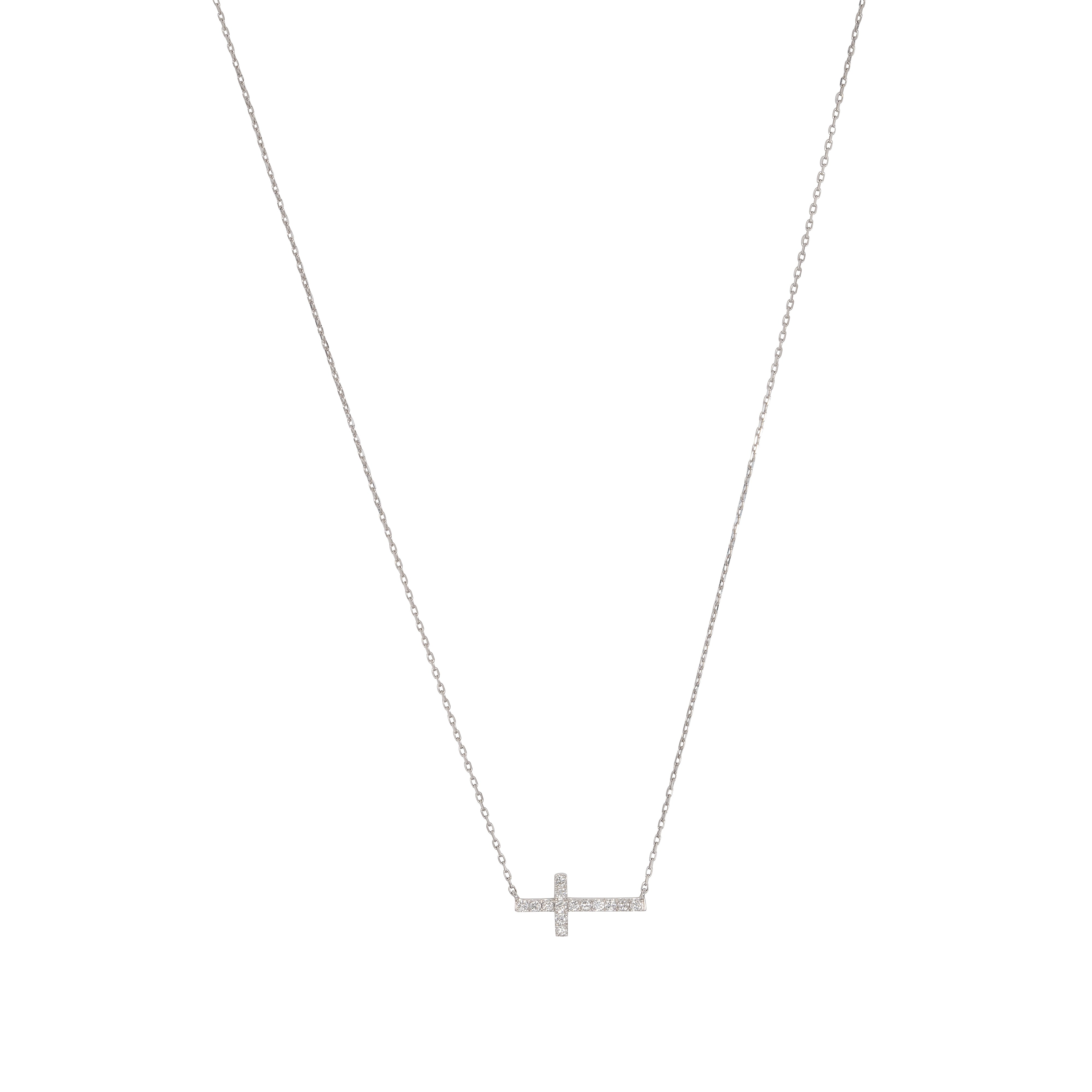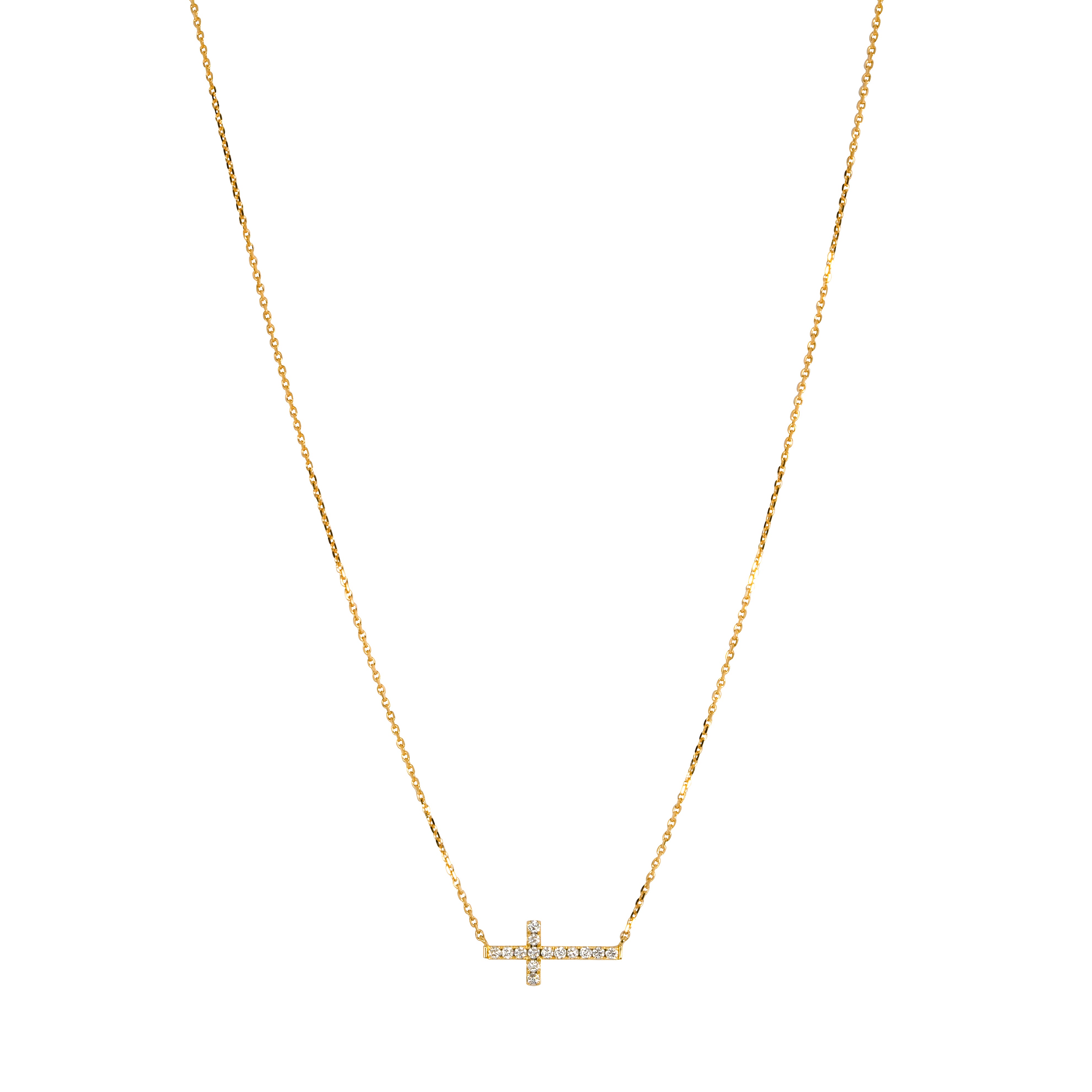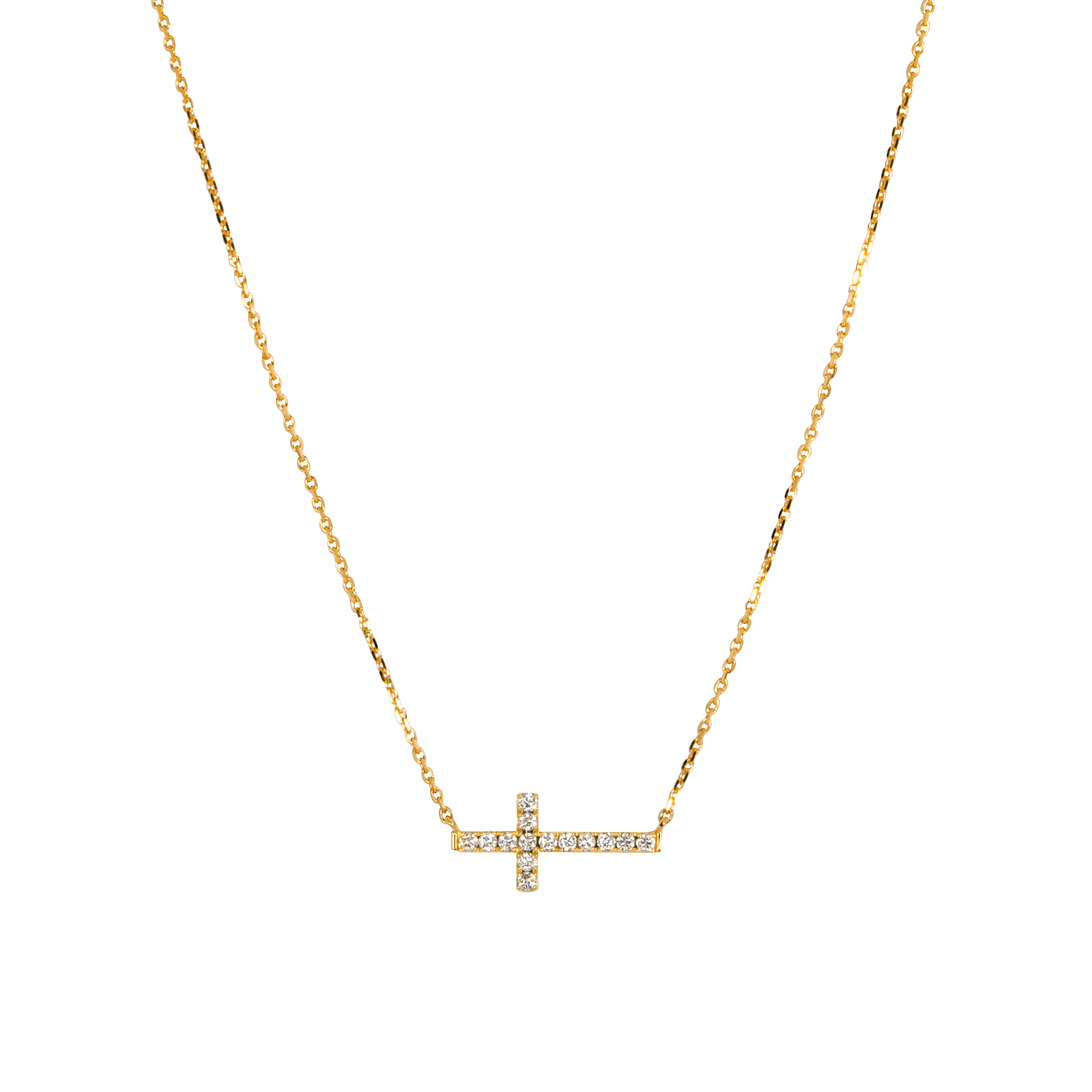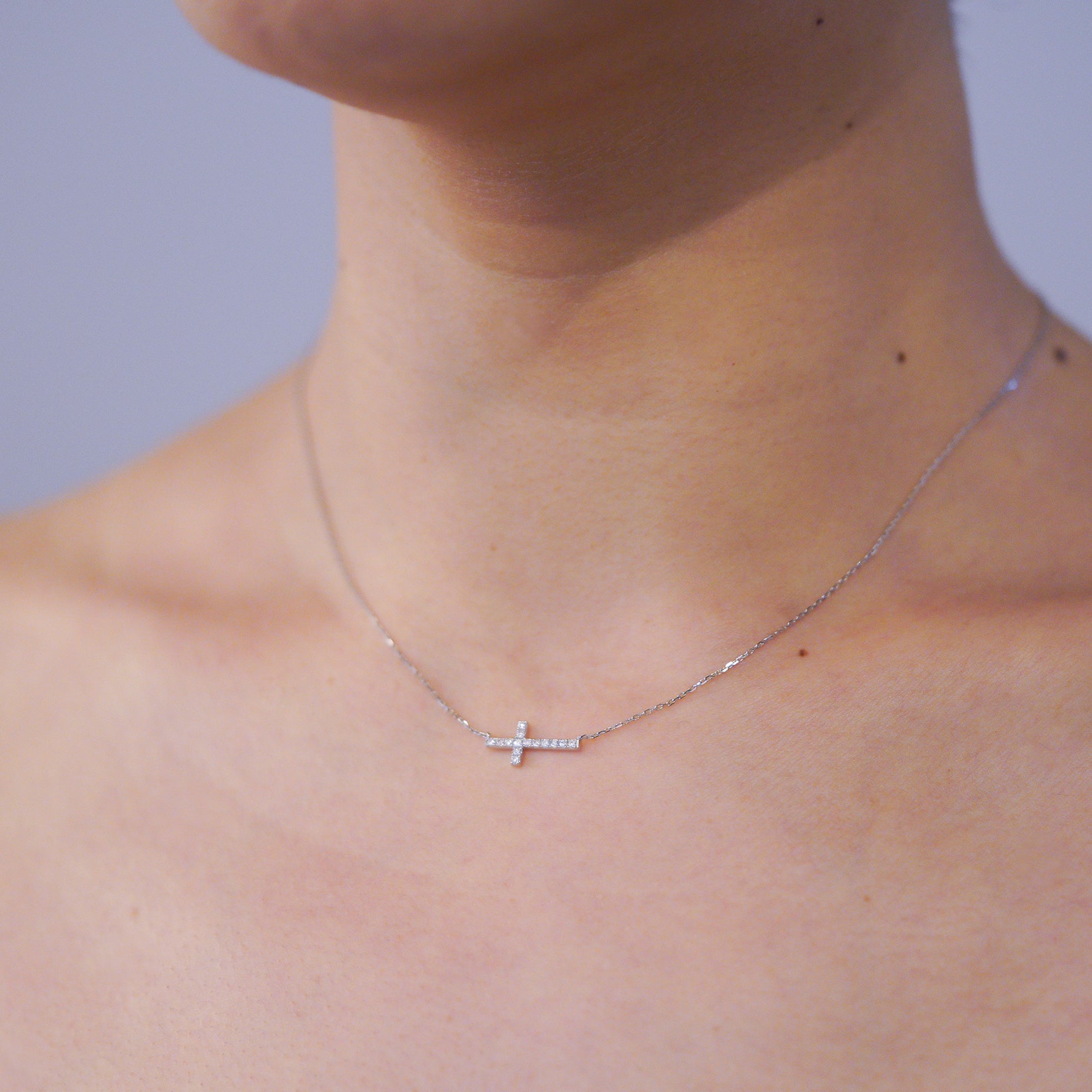 チェーンの流れに沿うようにデザインした繊細なクロス。どんなファッションにも合わせやすいさりげなさと、メレダイヤモンドの華やかな輝きを兼ね備え、大人のベーシックアイテムとしておすすめです。