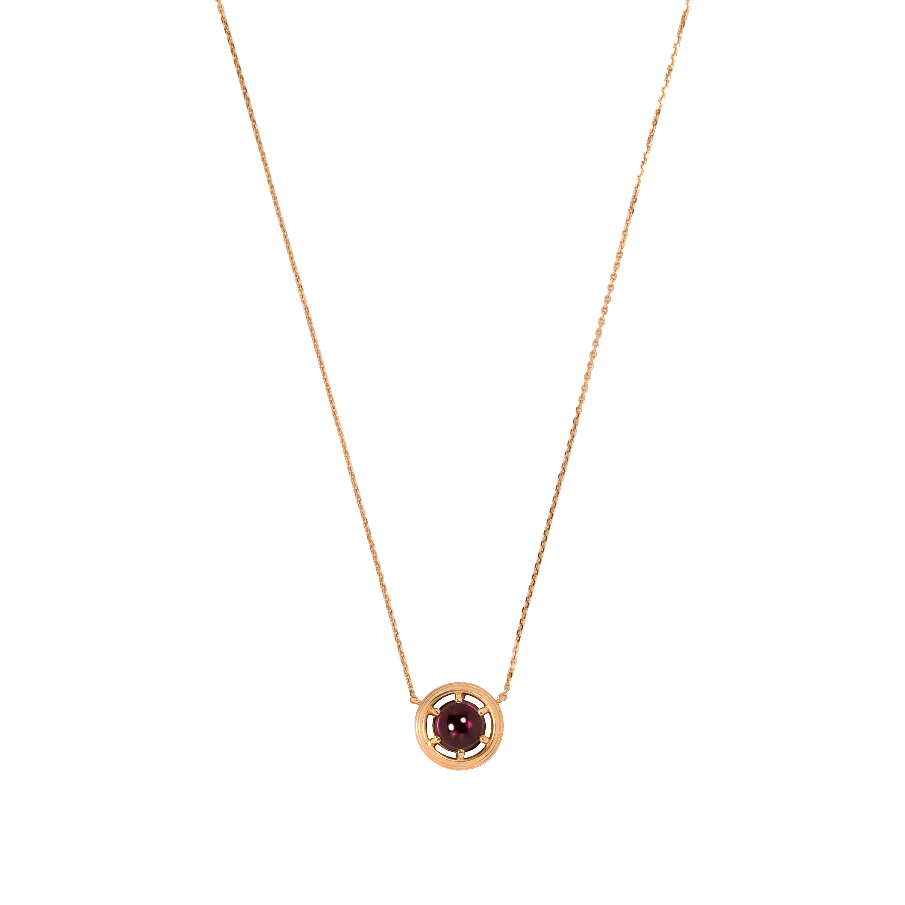 幾重にも重なるメタルの輪と中央のカボションカットのロードライトガーネットの有機的な繋がりを感じさせるネックレスです。メタルの輪とロードライトガーネットの間には空間を持たせ、宝石の存在感を際立たせています。宝石もメタルの印象も落ち着いた雰囲気で、初めてカラーストーンを手に取る方にもおすすめです。