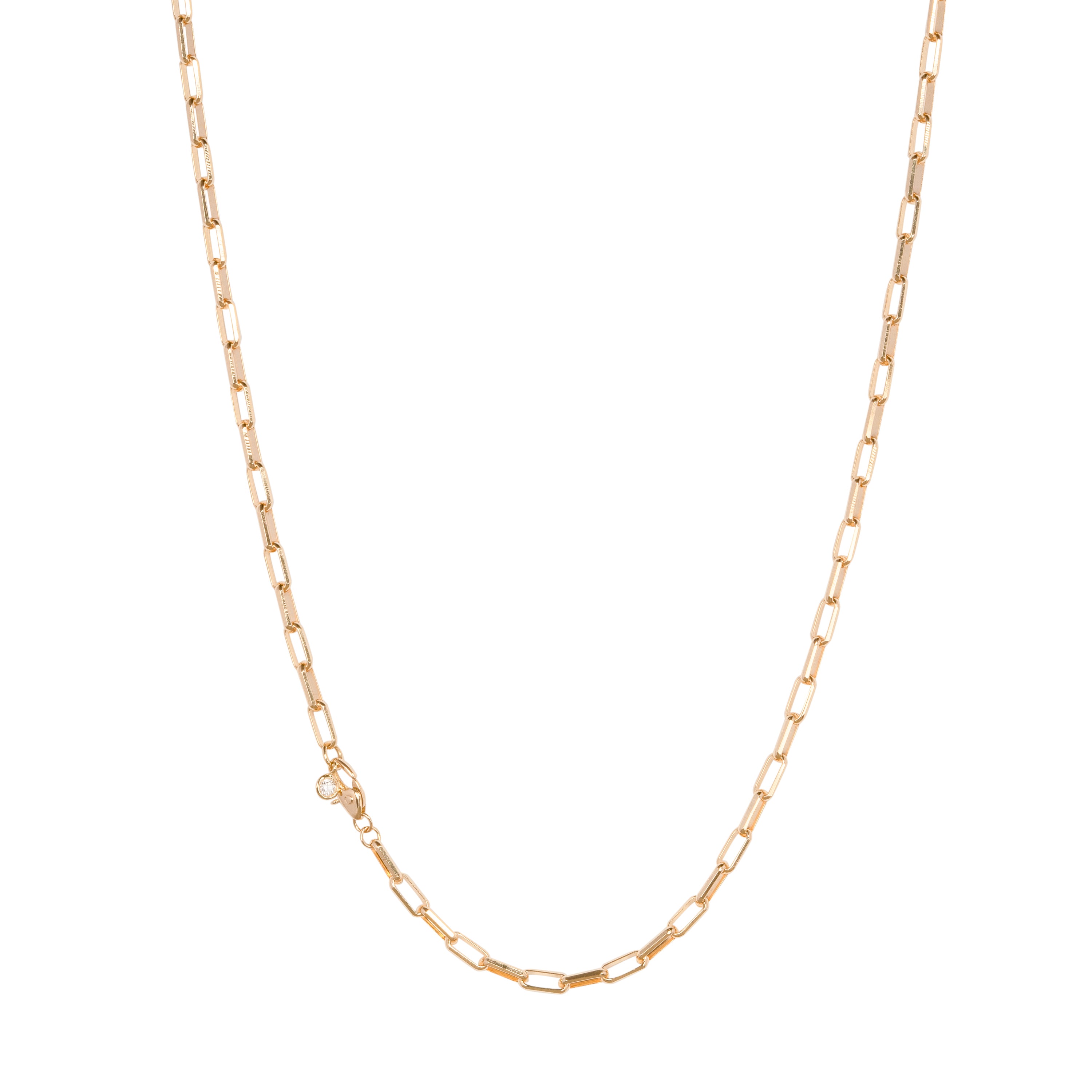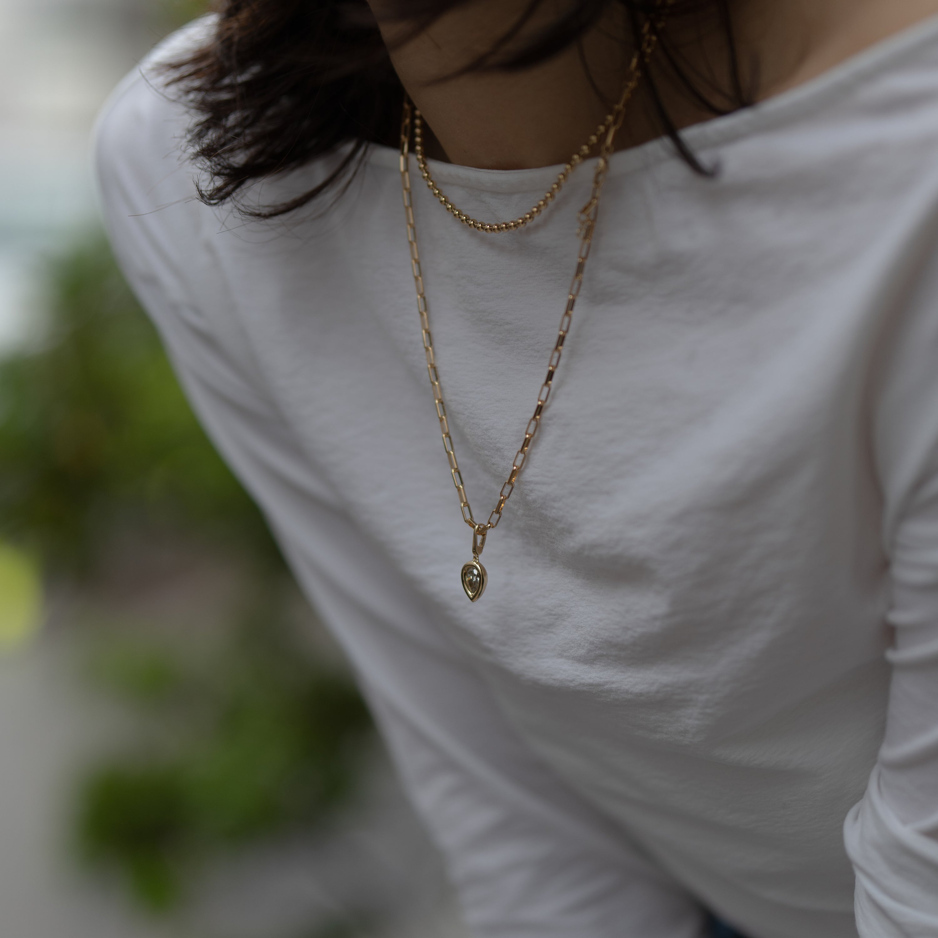 カジュアルな印象を与えながら、適度な重量感も感じられるネックレス。エンドパーツにあしらったダイヤモンドがさりげないアクセントを添えます。チェーンの輪に金具を留められるため、自由に長さを調節でき、Y字スタイルにするとダイヤモンドが引き立つ魅力的なデザインです。