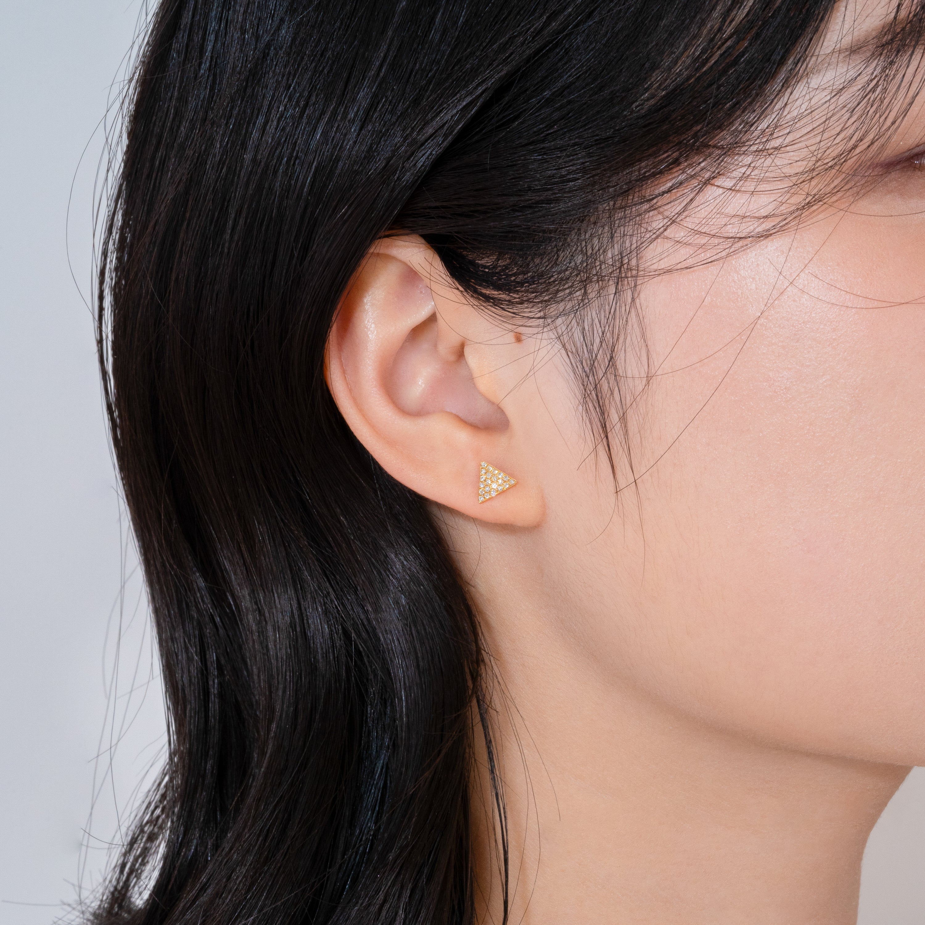 フラットな三角形のメタルにメレダイヤモンドをあしらったピアス。デザインはシンプルながらダイヤモンドの繊細な輝きが美しいジュエリーです。ペアでのお作りです。