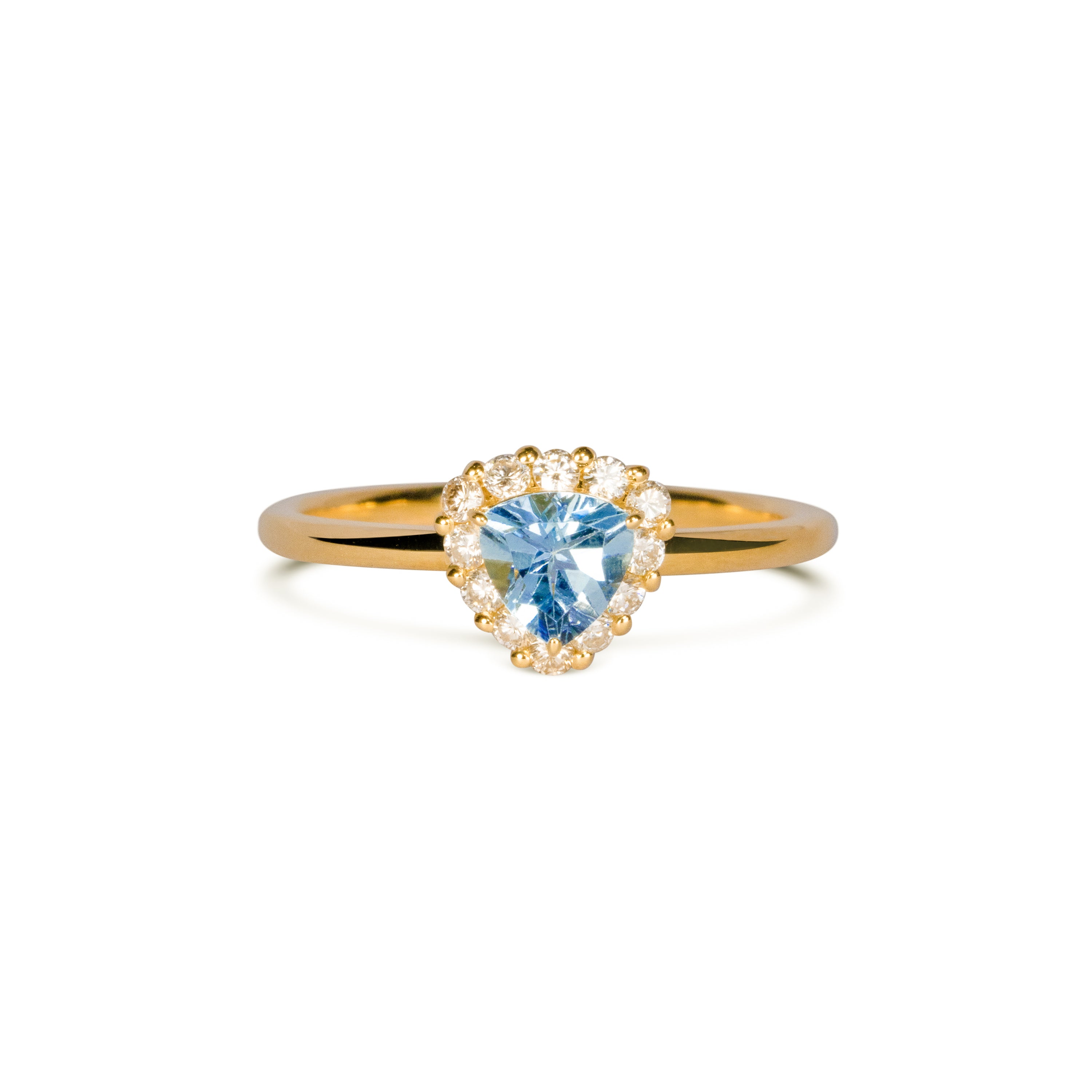 爽やかな水色のトリリアントカットのアクアマリンを華やかに彩ったリング。バレリーナのチュチュを思わせるダイヤモンドの絶妙な角度が、シンプルながら他にはない気品を引き立てます。単体での着用はもちろん、厚み約2.5mmまでの他のリングとの重ね着けも楽しめるよう、細部にまでこだわり抜いています。