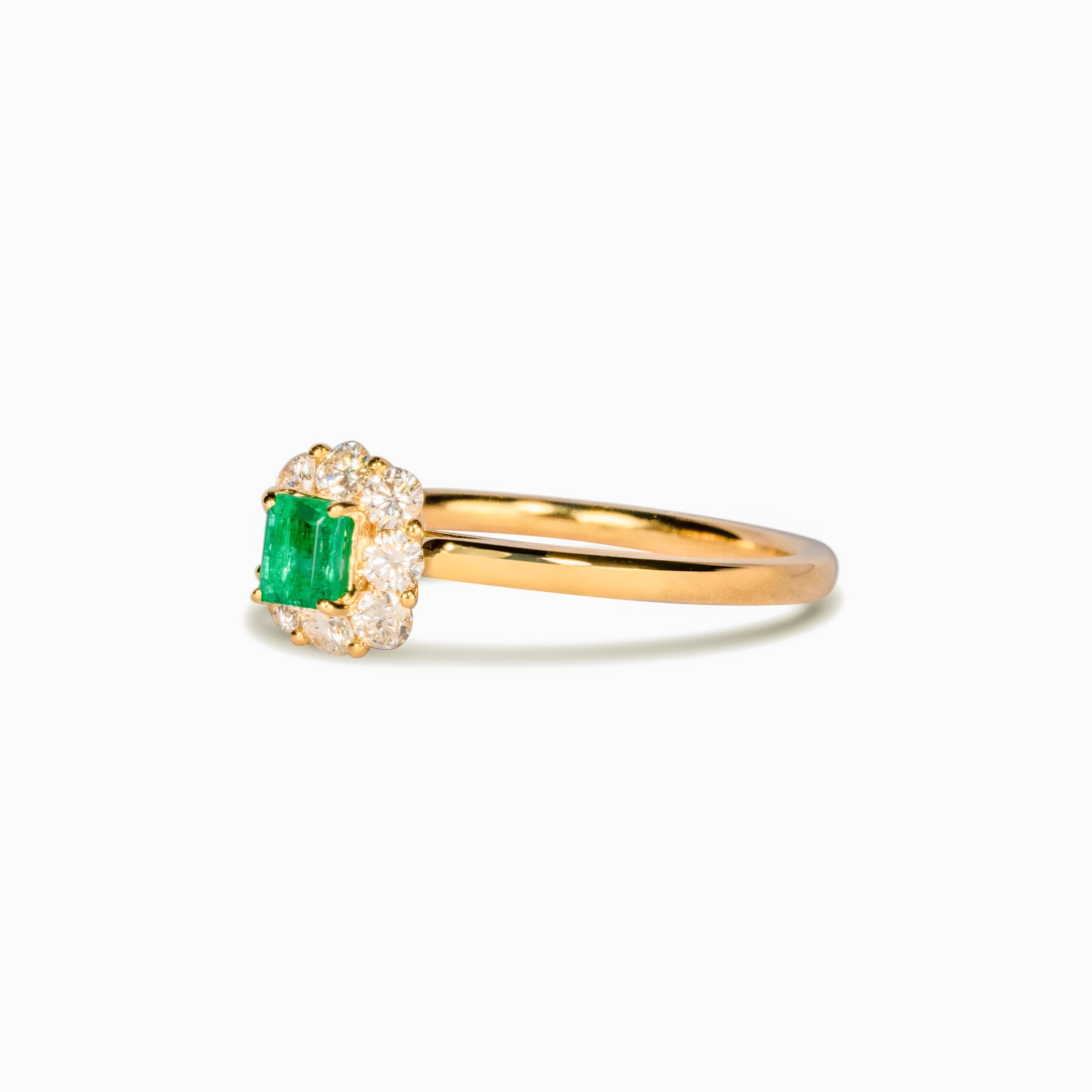 鮮やかなネオンカラーのエメラルドを華やかに彩ったリング。バレリーナのチュチュを思わせるダイヤモンドの絶妙な角度が、シンプルながら他にはない気品を引き立てます。単体での着用はもちろん、厚み約2.5mmまでの他のリングとの重ね着けも楽しめるよう、細部にまでこだわり抜いています。