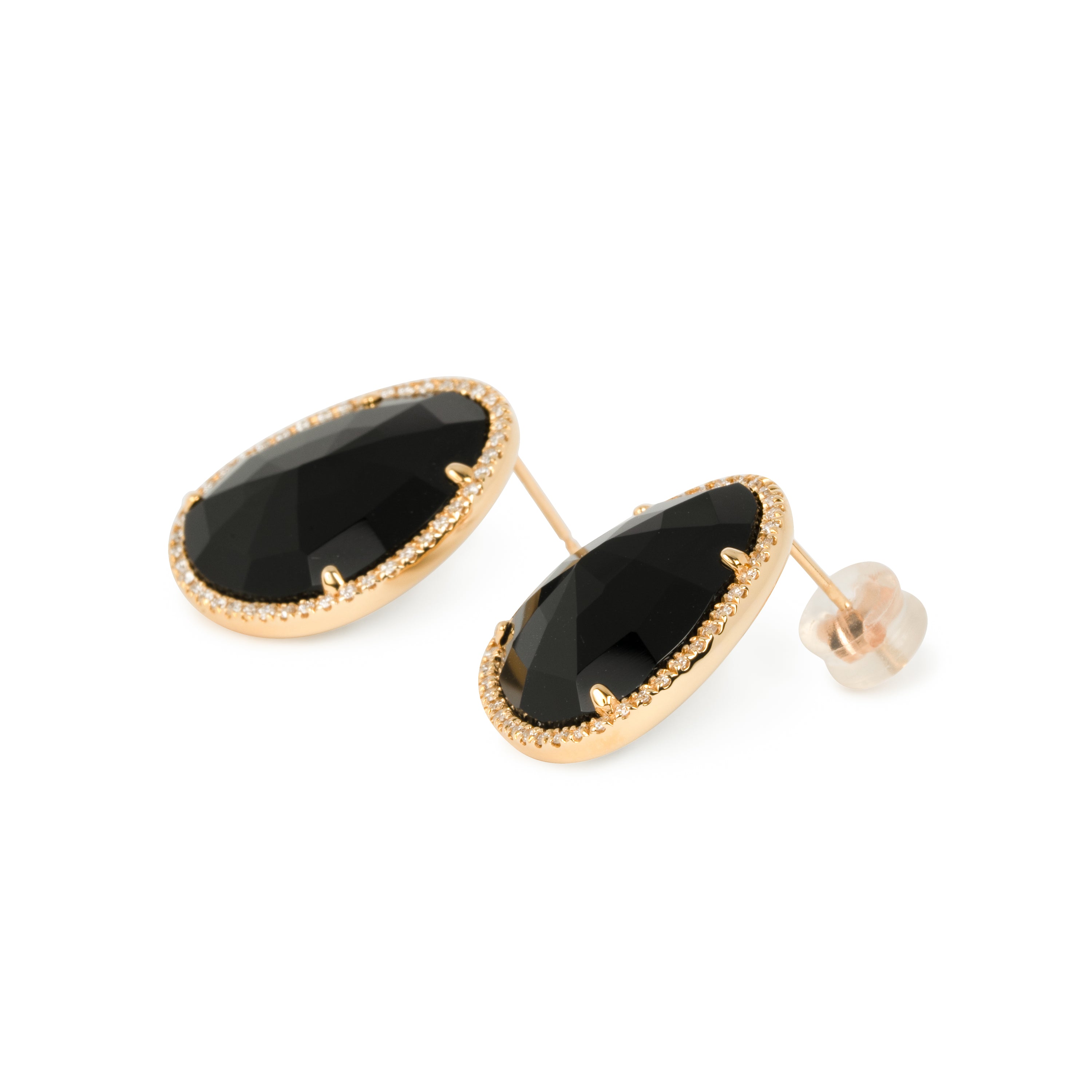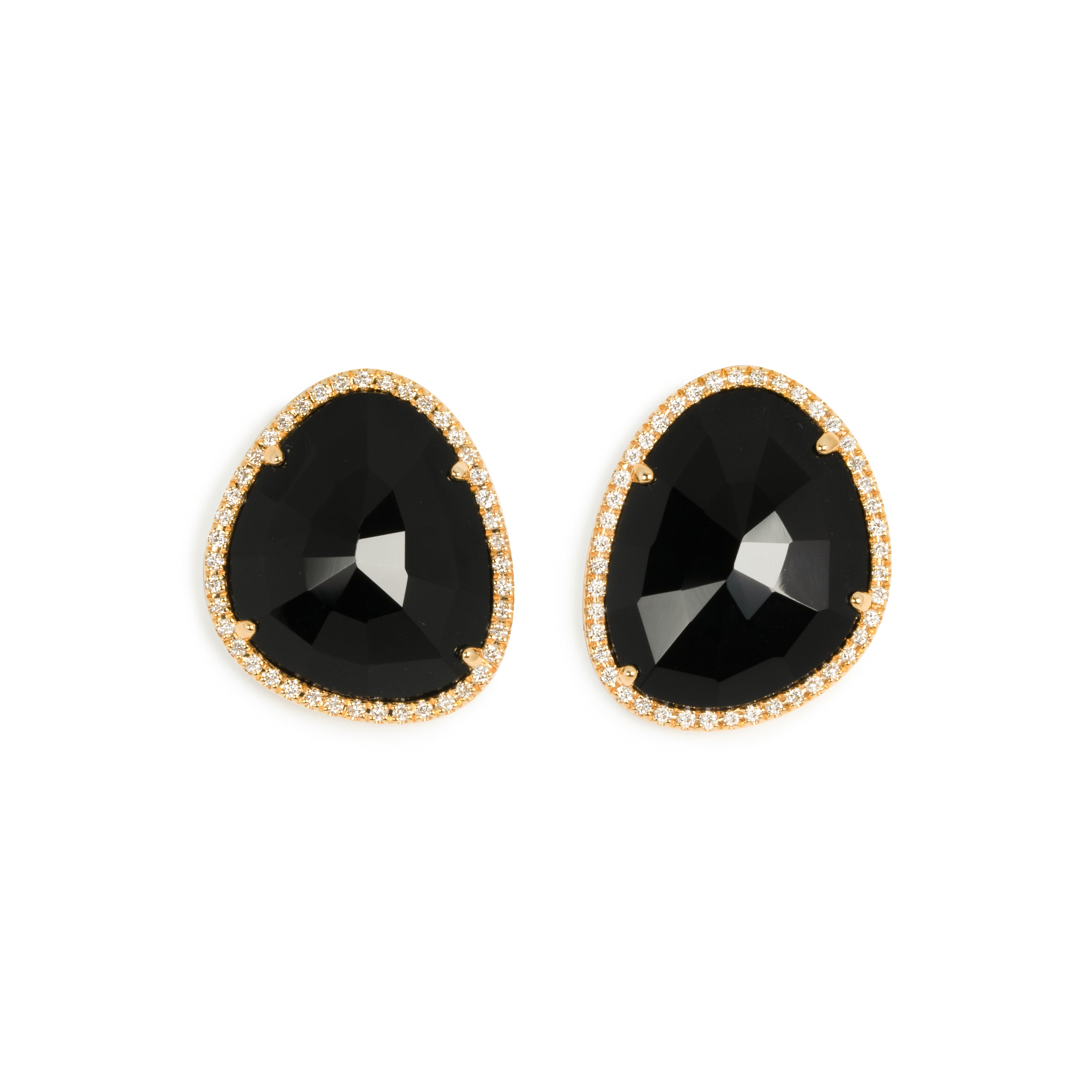 漆黒に輝くオニキスに繊細に輝くメレダイヤモンドを取り巻きました。シンプルでいて、宝石のユニークな形が際立つデザイン。 宝石の形に合わせ、一点ずつ丁寧にお作りしています。ペアでのお作りです。