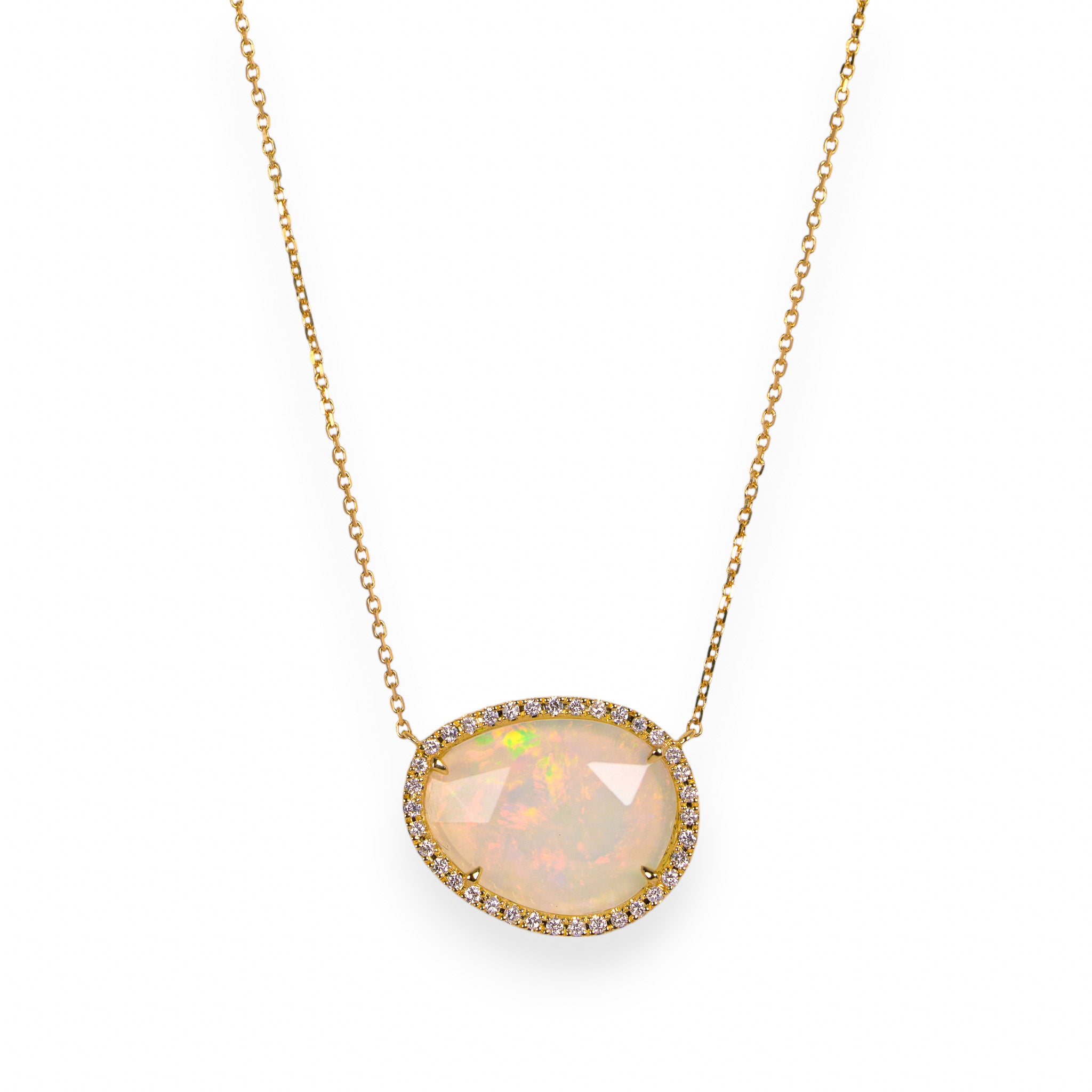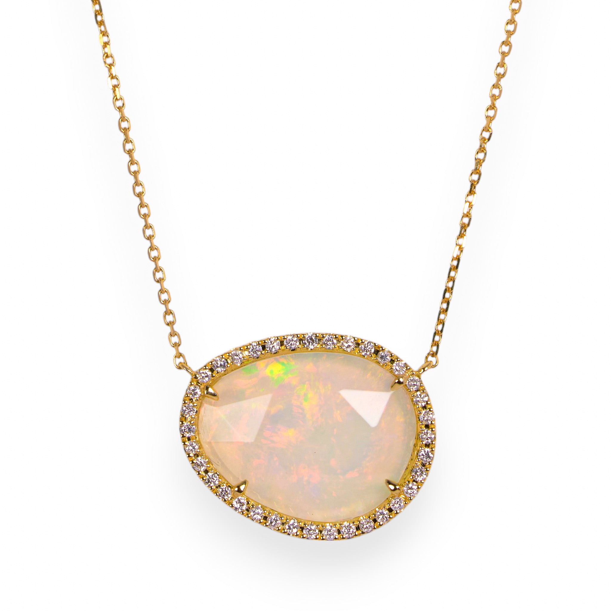 オーロラのような神秘的な輝きをたたえたエチオピアオパールと、繊細に輝くメレダイヤモンドのコントラストが美しいネックレスです。シンプルでいて、宝石のユニークな形が際立つデザイン。