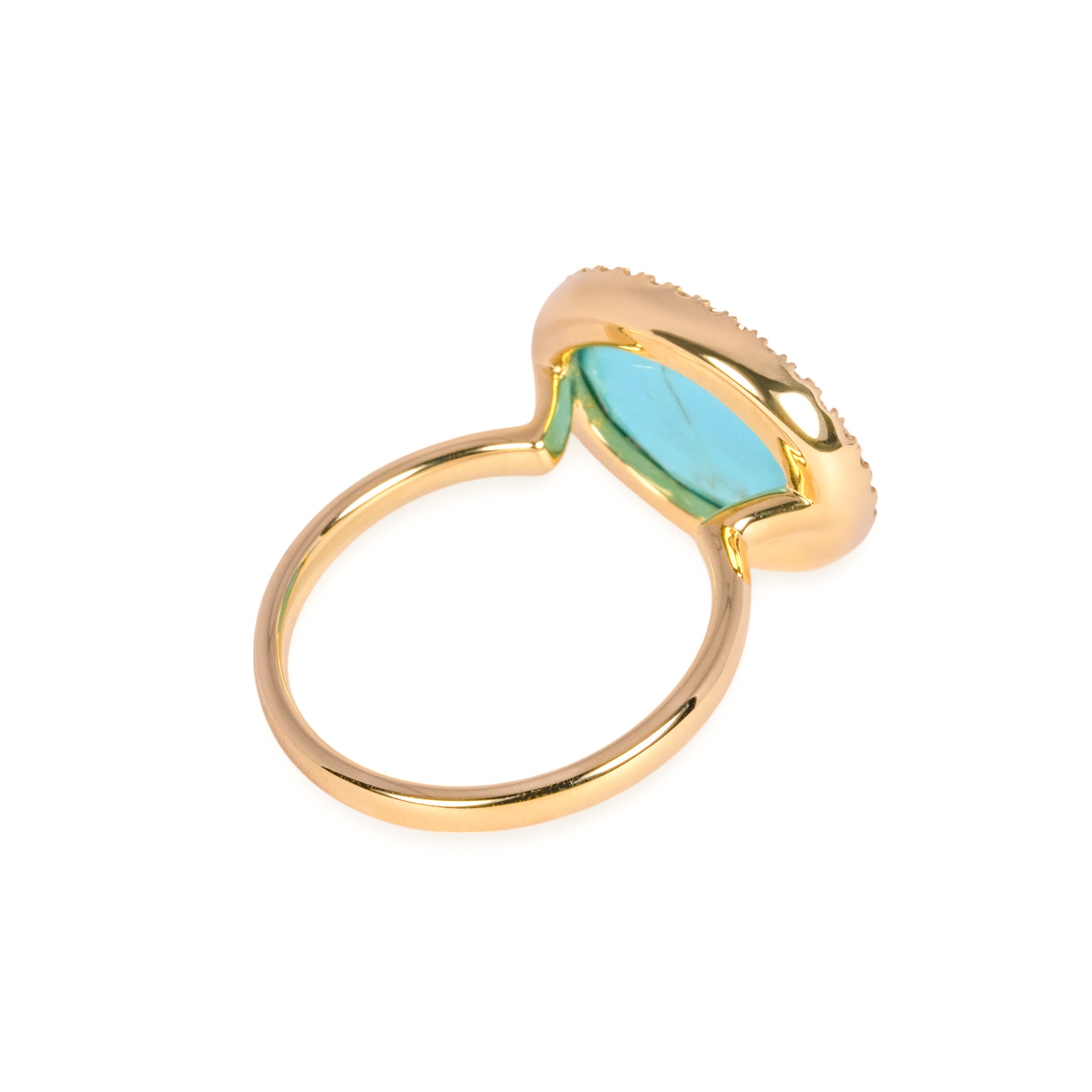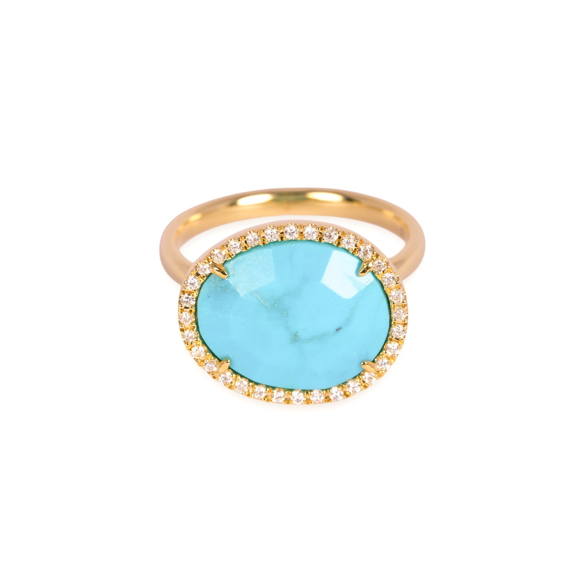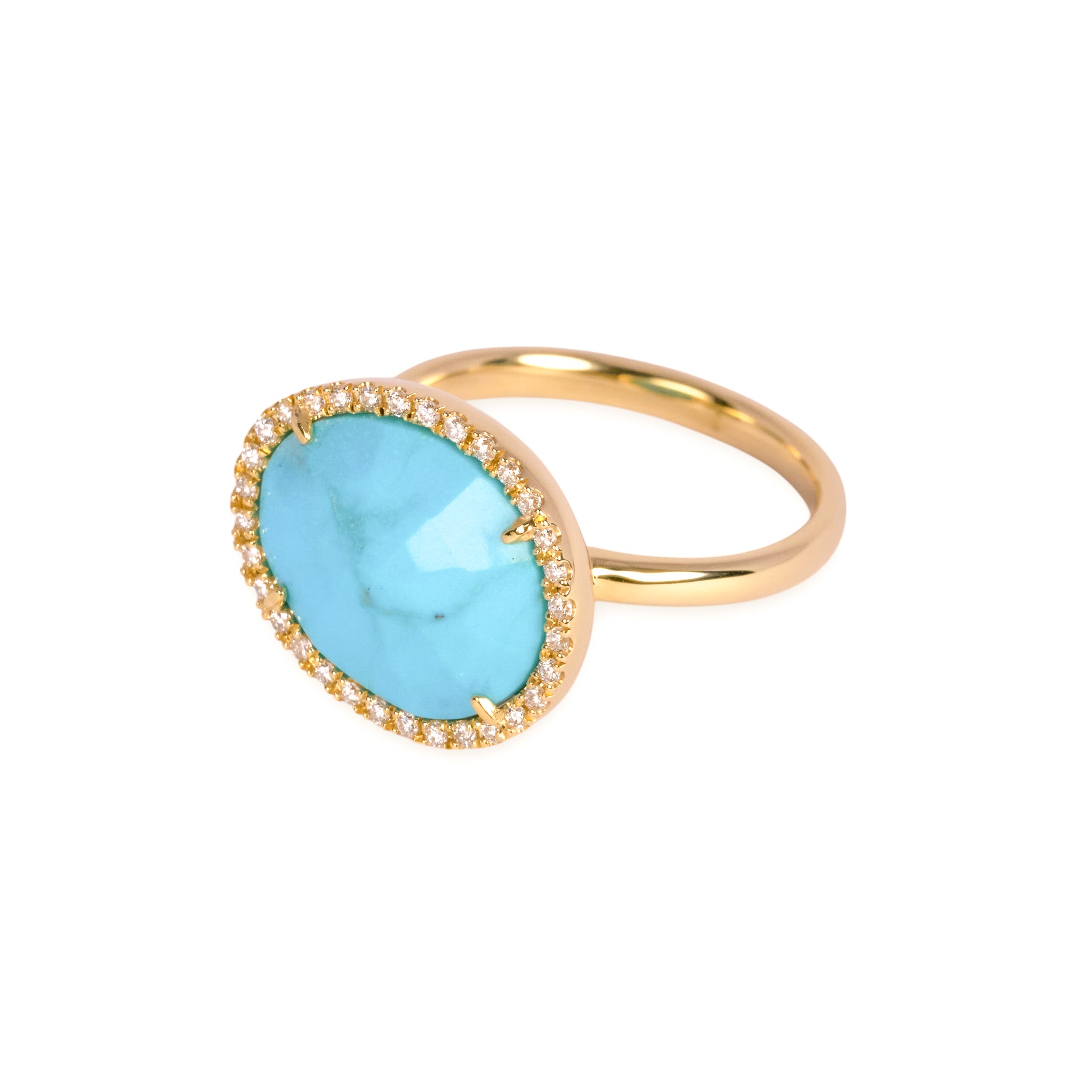 表情豊かなターコイズと、繊細に輝くメレダイヤモンドのコントラストが美しいリングです。シンプルでいて、宝石のユニークな形が際立つデザイン。