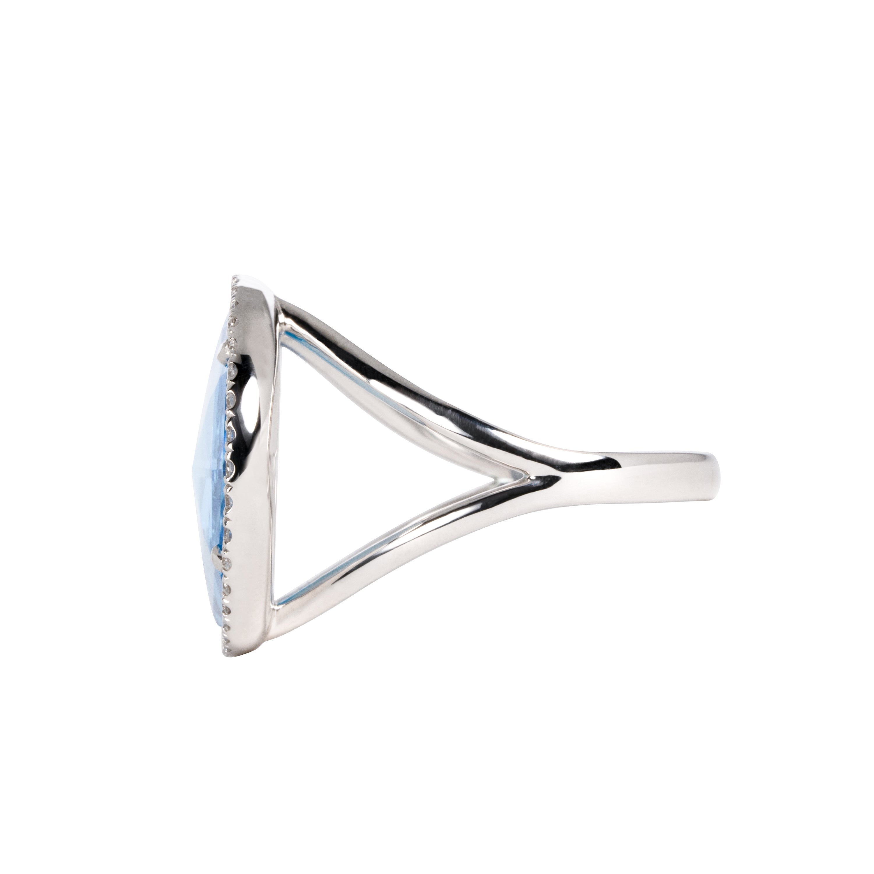 爽やかなブルートパーズに繊細に輝くメレダイヤモンドを取り巻きました。シンプルでいて、宝石のユニークな形が際立つデザイン。大きなセンターストーンを支えるアームは一本から二本に分岐し、指をしっかりとホールドする安心感も特徴です。宝石の形に合わせ、一点ずつ丁寧にお作りしています。