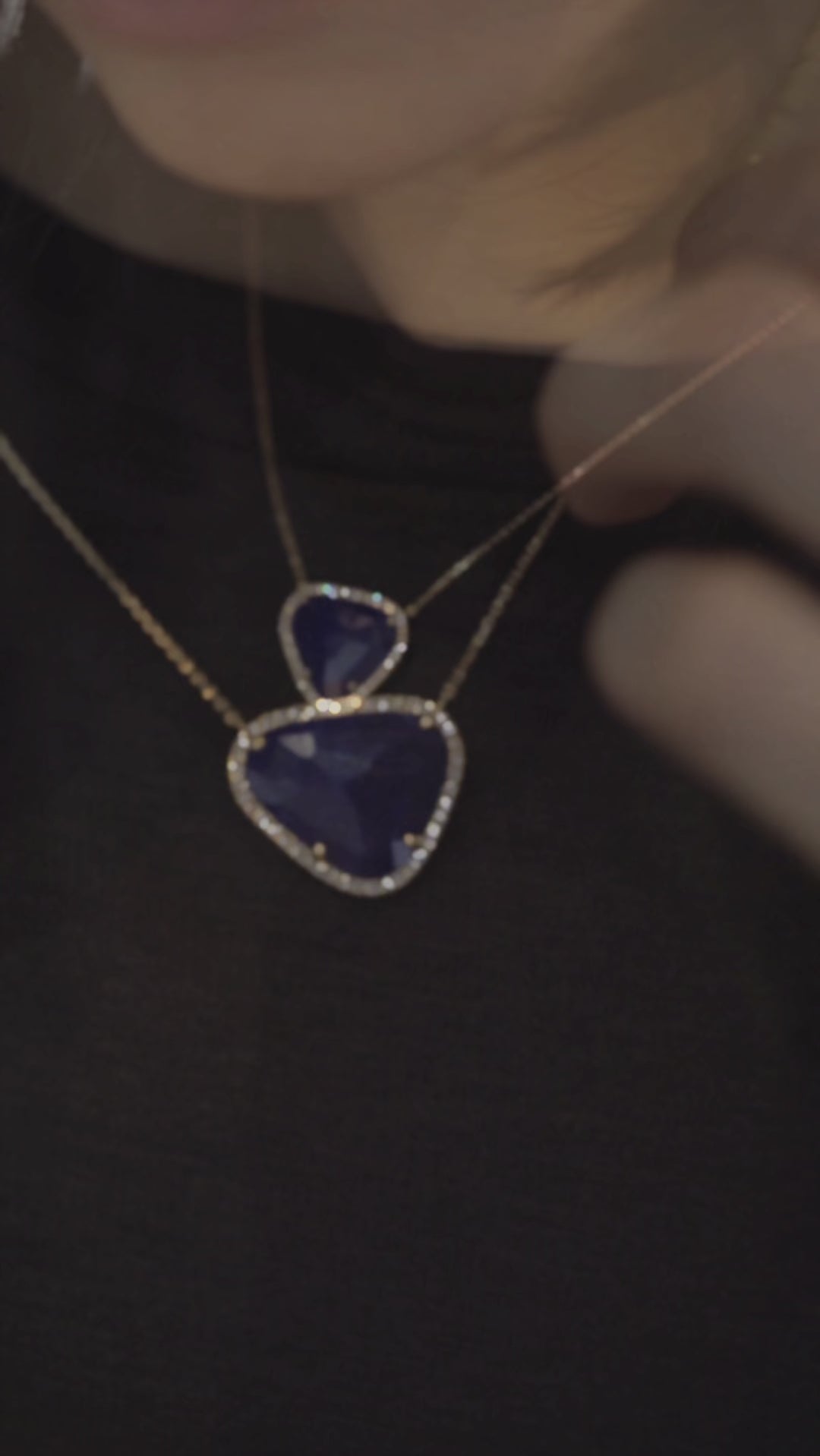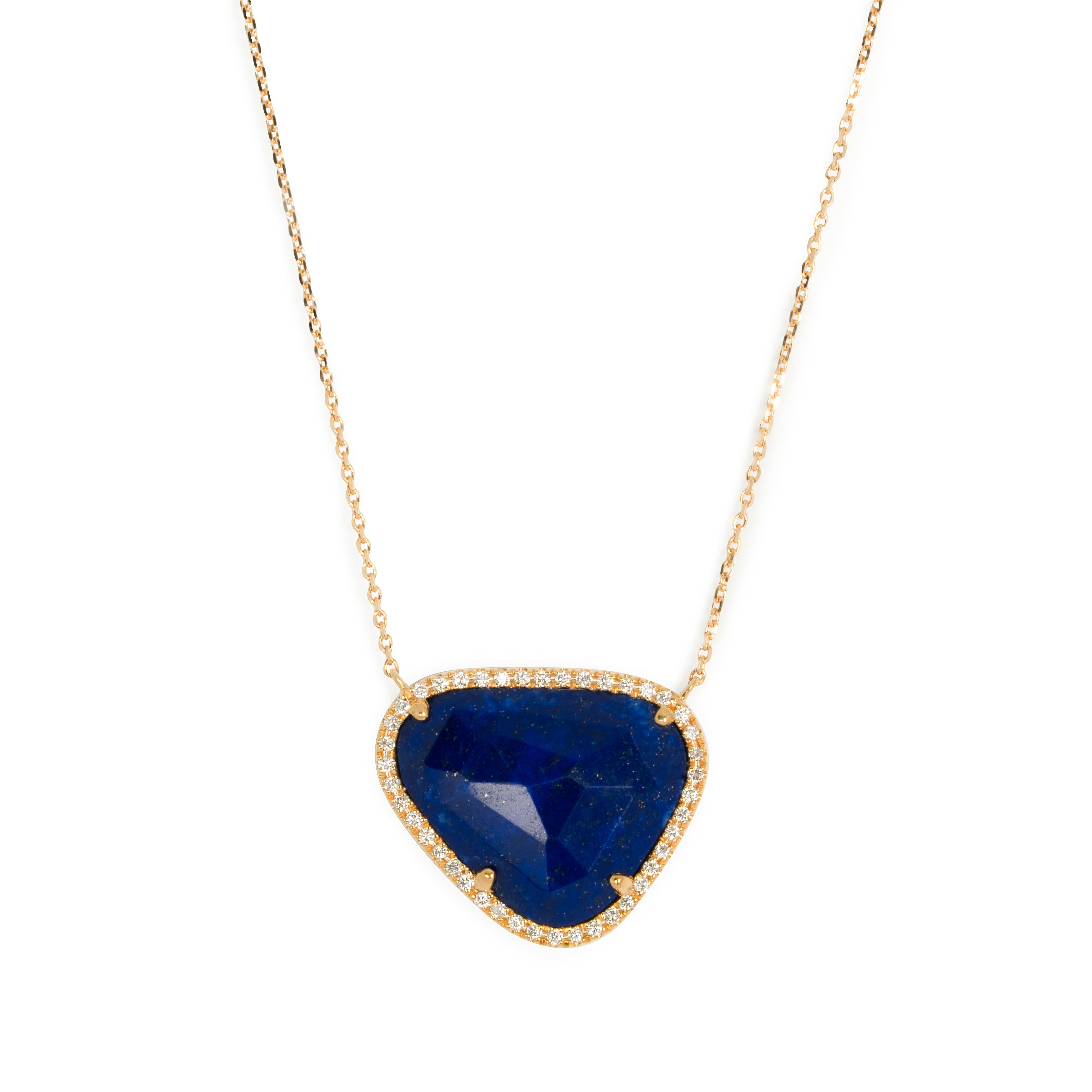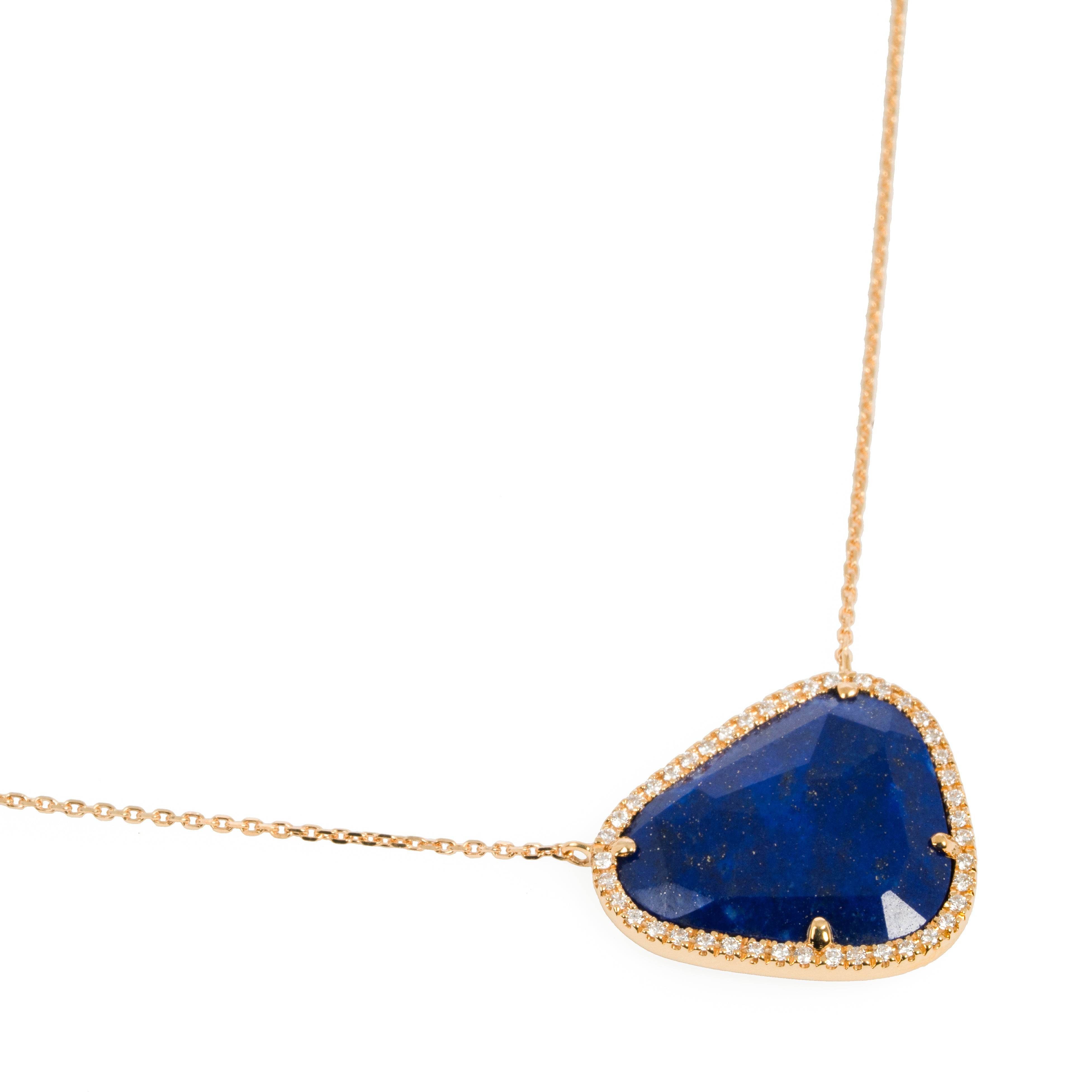 深海を思わせる深いブルーのラピスラズリと、繊細に輝くメレダイヤモンドのコントラストが美しいネックレスです。シンプルでいて、宝石のユニークな形が際立つデザイン。宝石の形に合わせ、一点ずつ丁寧にお作りしています。