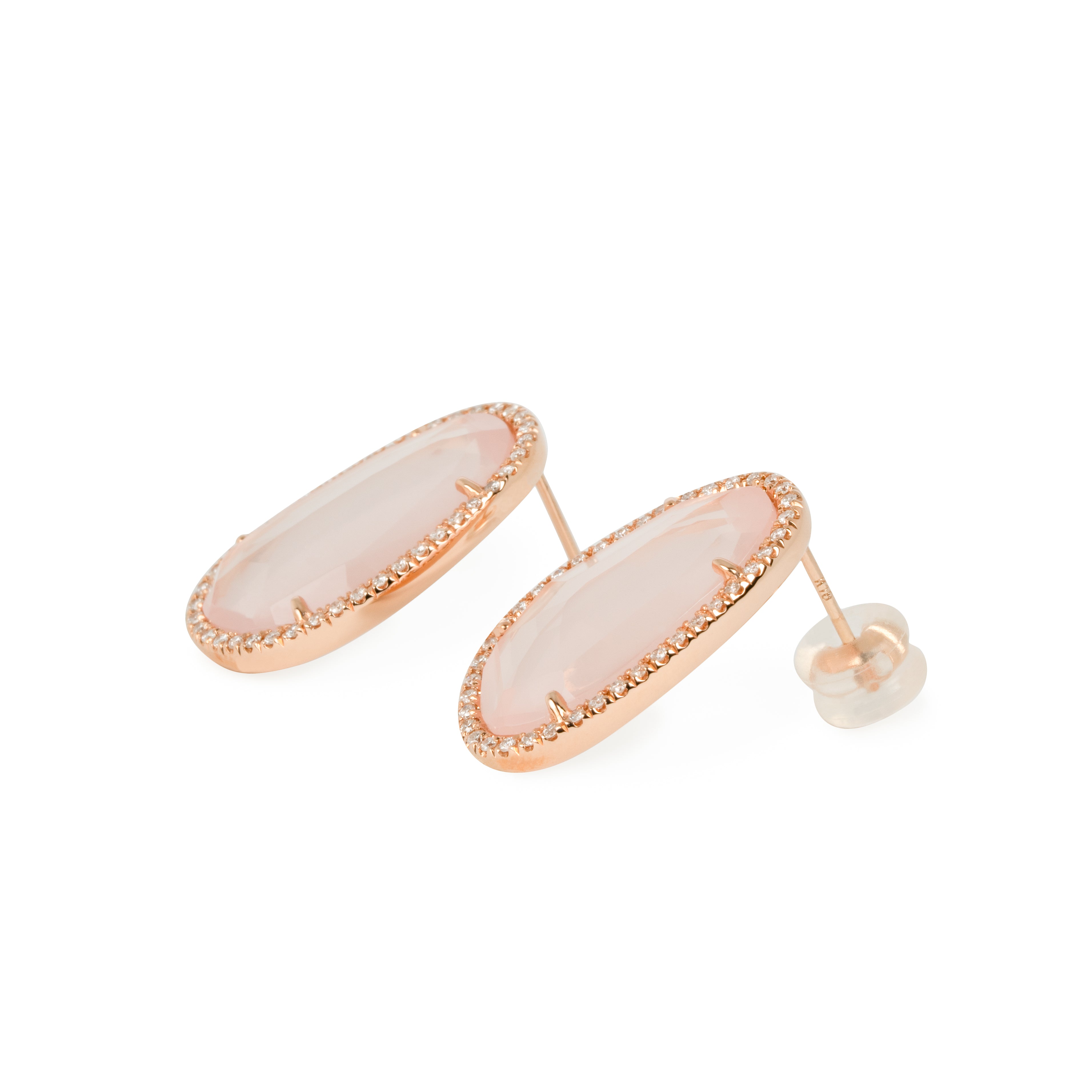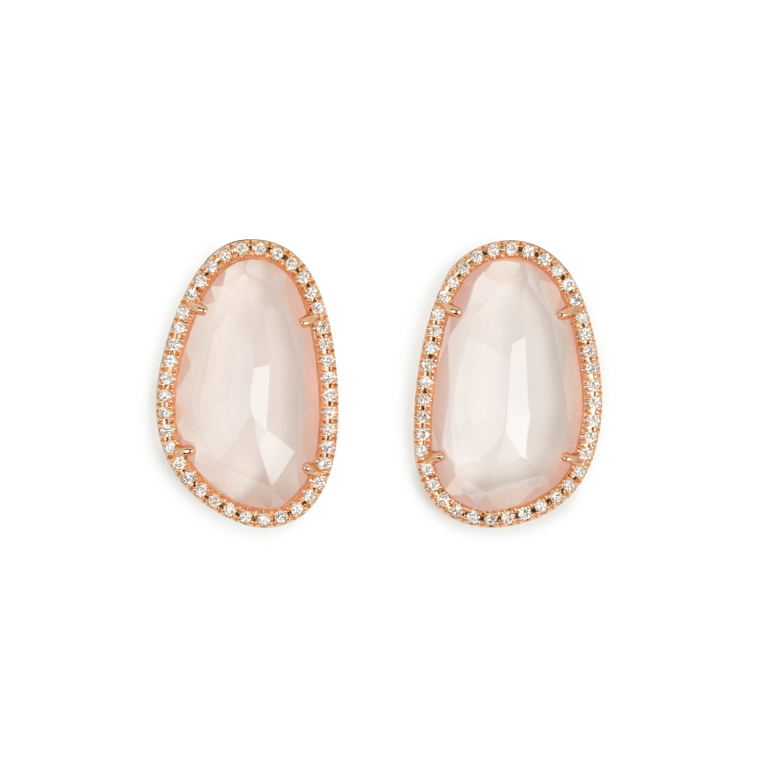 柔らかくミルキーがかったローズクォーツに繊細に輝くメレダイヤモンドを取り巻きました。シンプルでいて、宝石のユニークな形が際立つデザイン。 宝石の形に合わせ、一点ずつ丁寧にお作りしています。ペアでのお作りです。