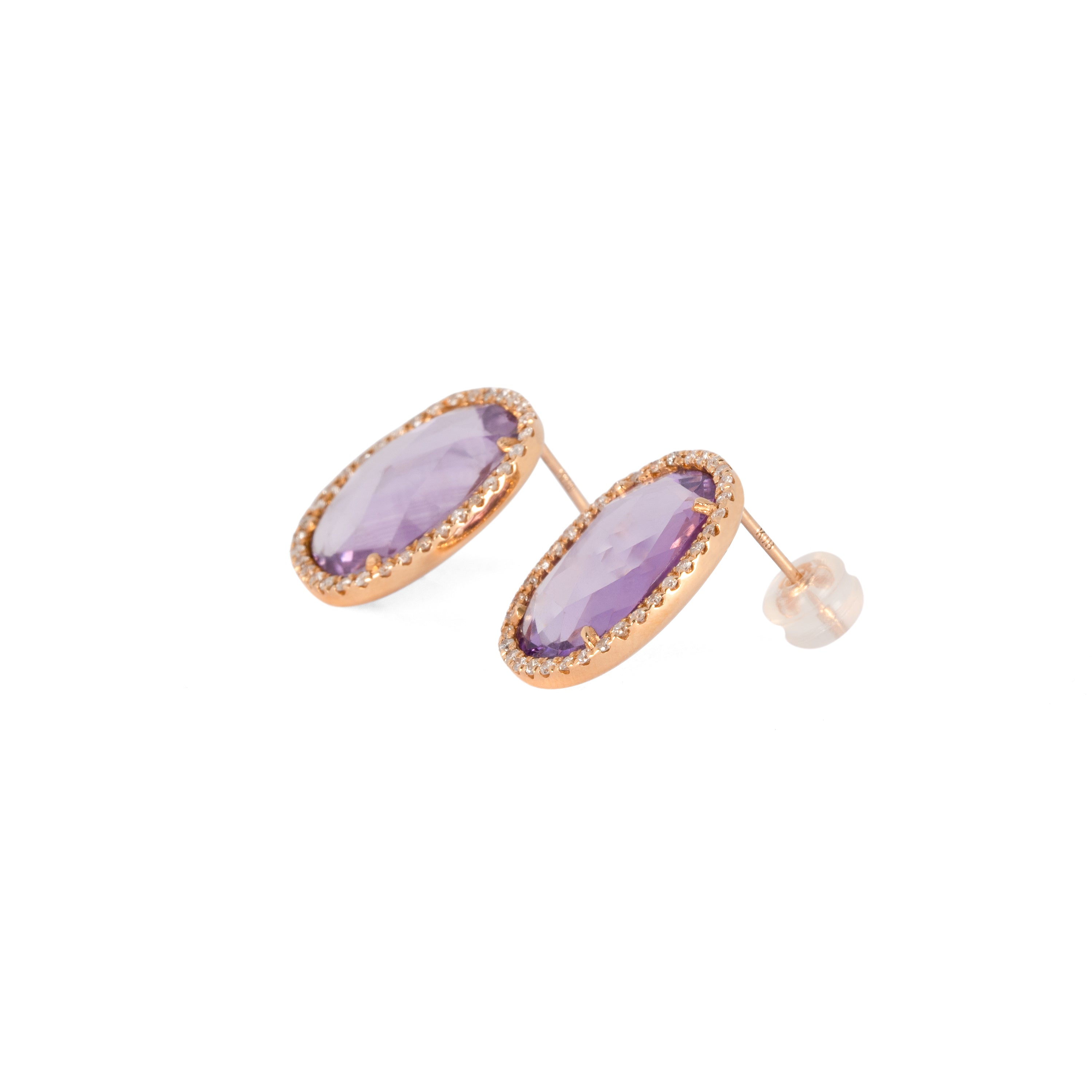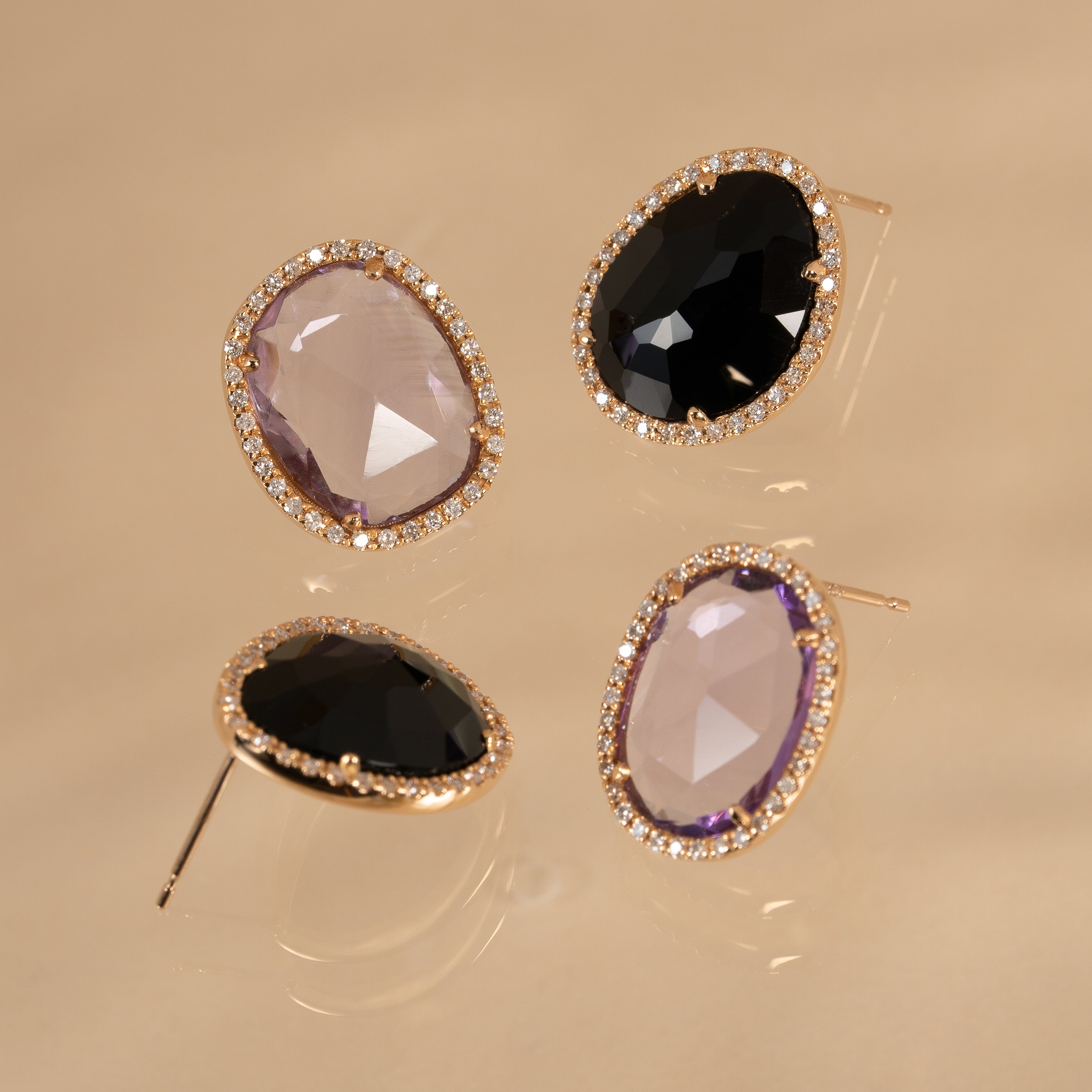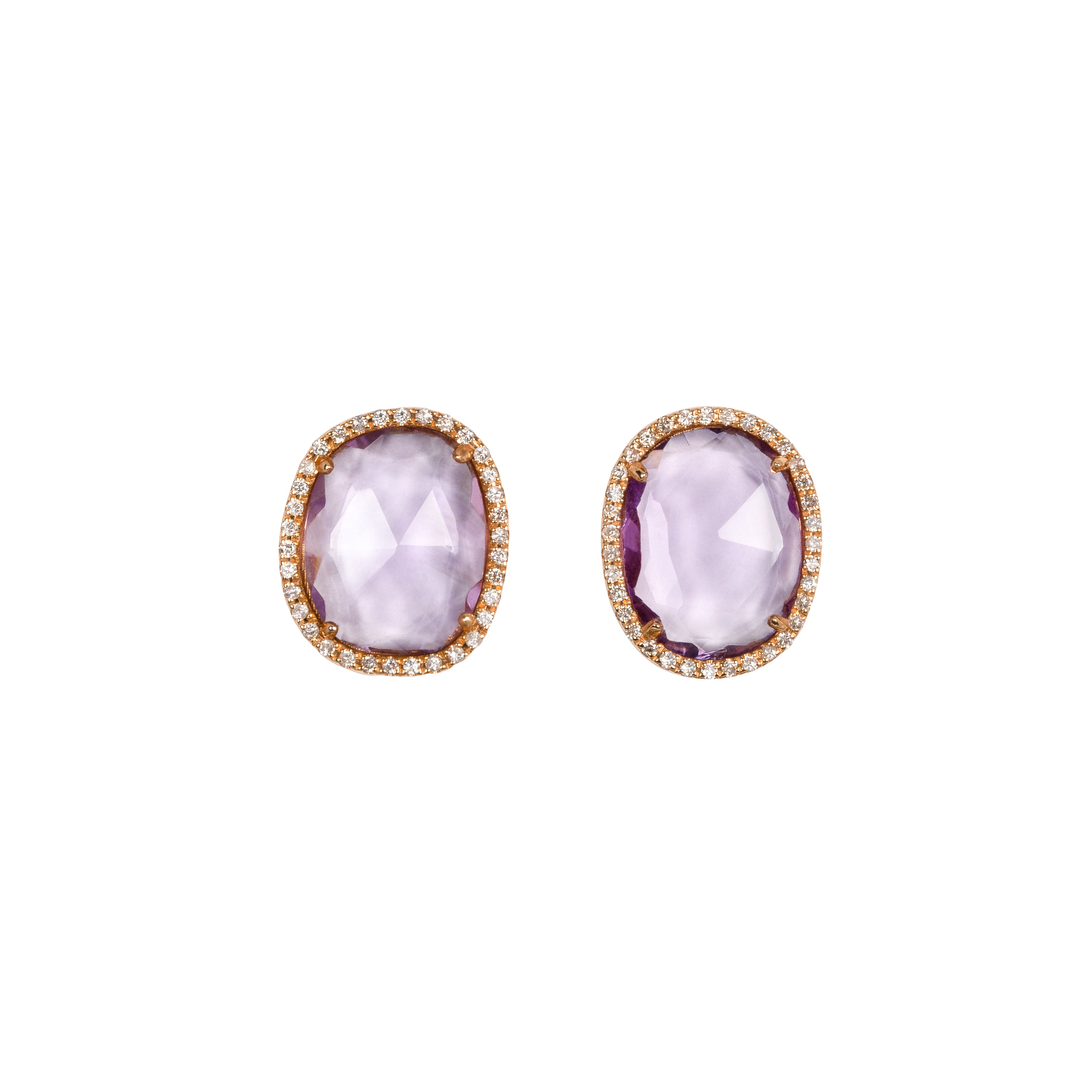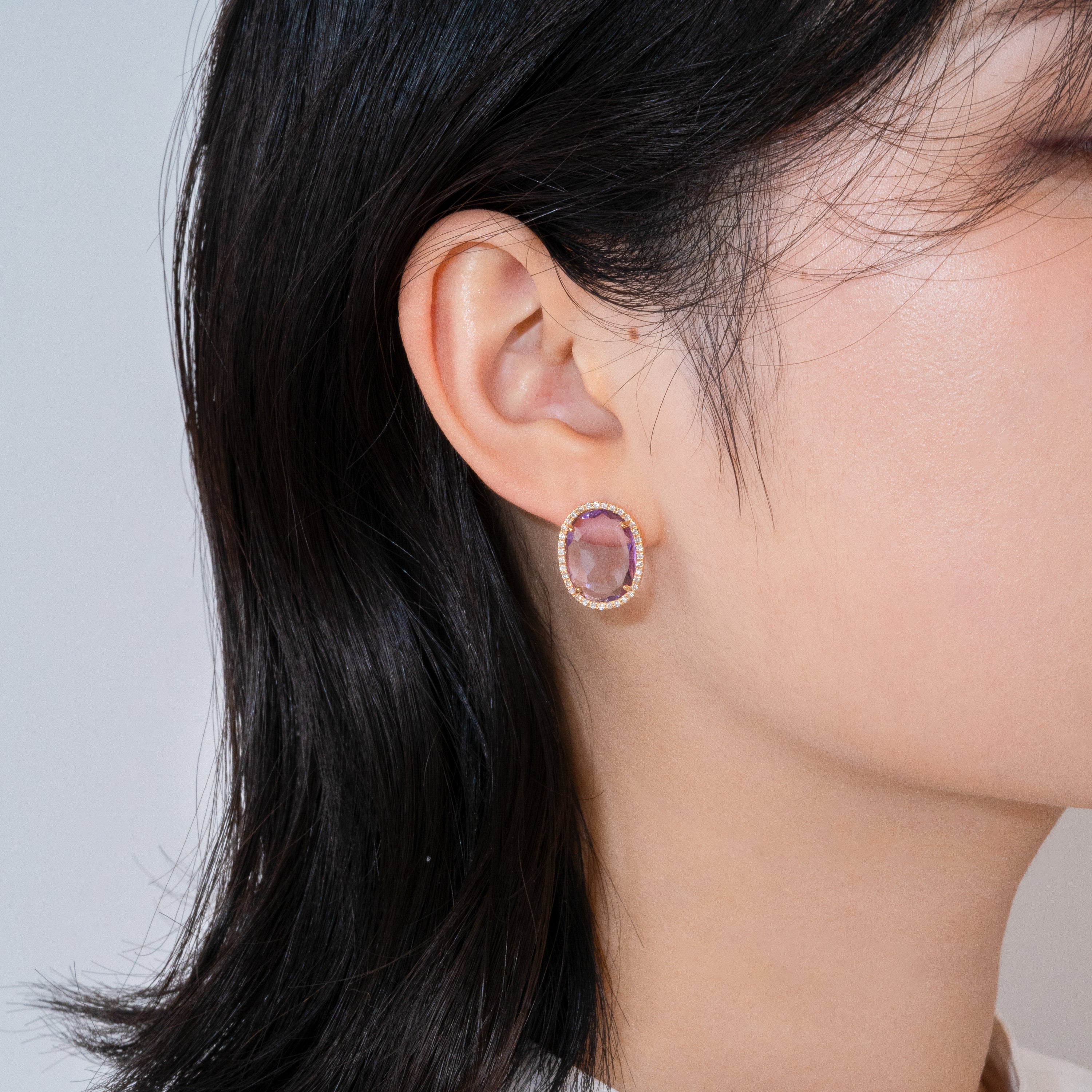 透明感のあるアメシストに繊細に輝くメレダイヤモンドを取り巻きました。シンプルでいて、宝石のユニークな形が際立つデザイン。 宝石の形に合わせ、一点ずつ丁寧にお作りしています。ペアでのお作りです。